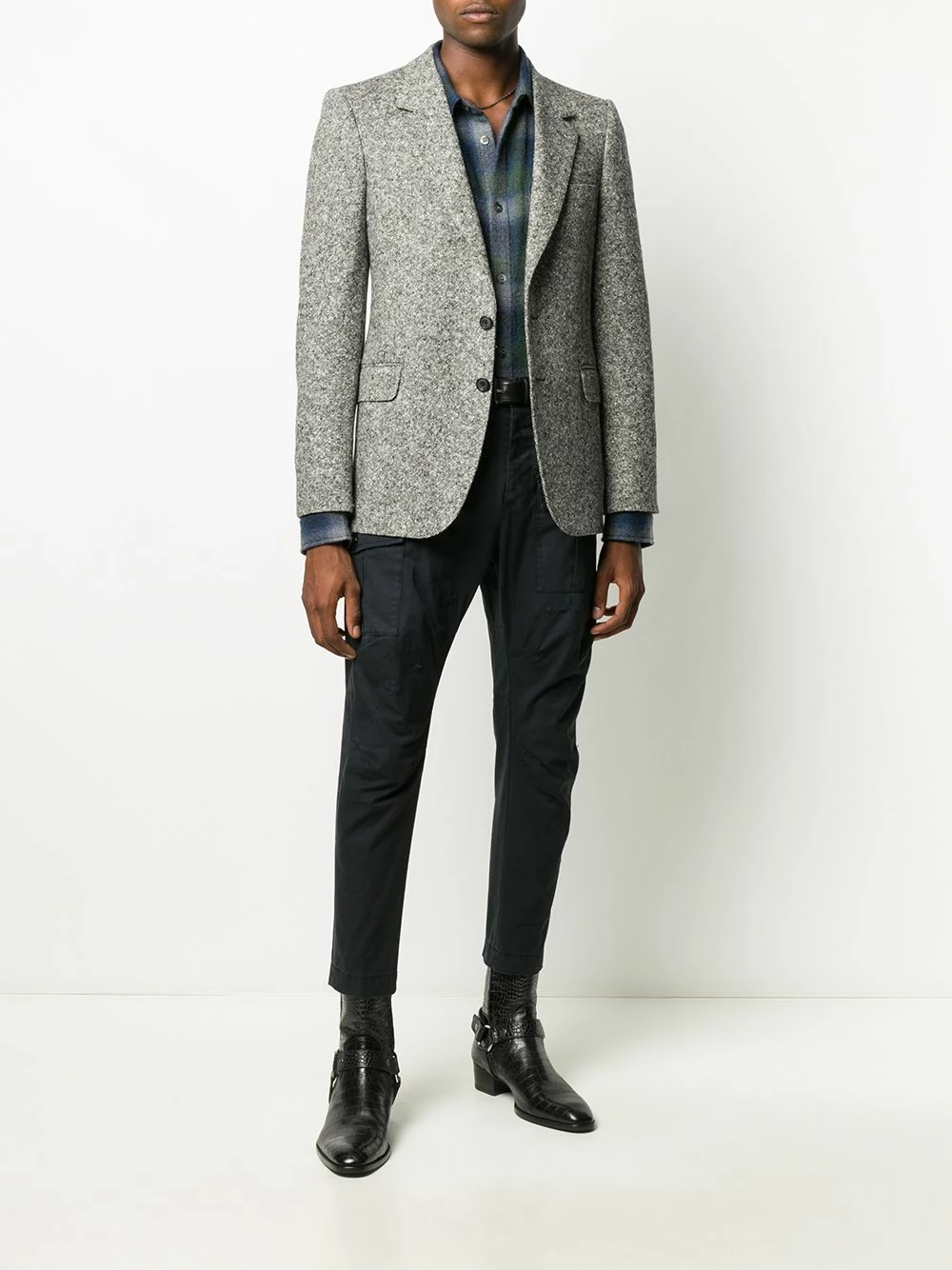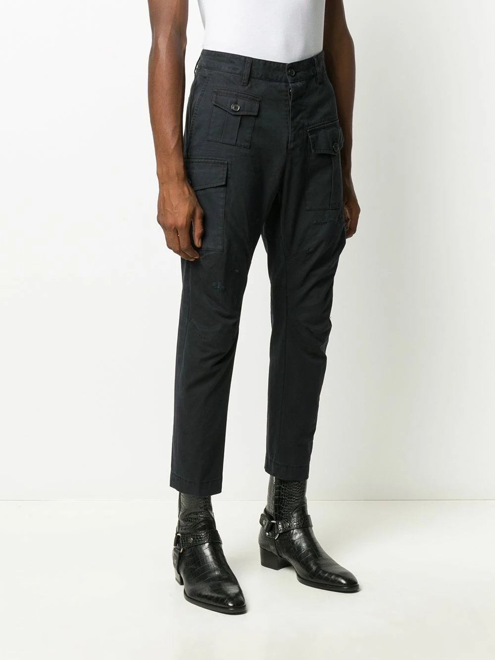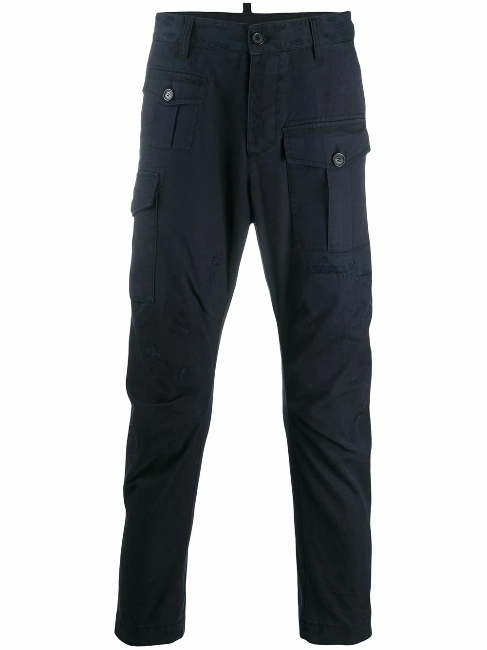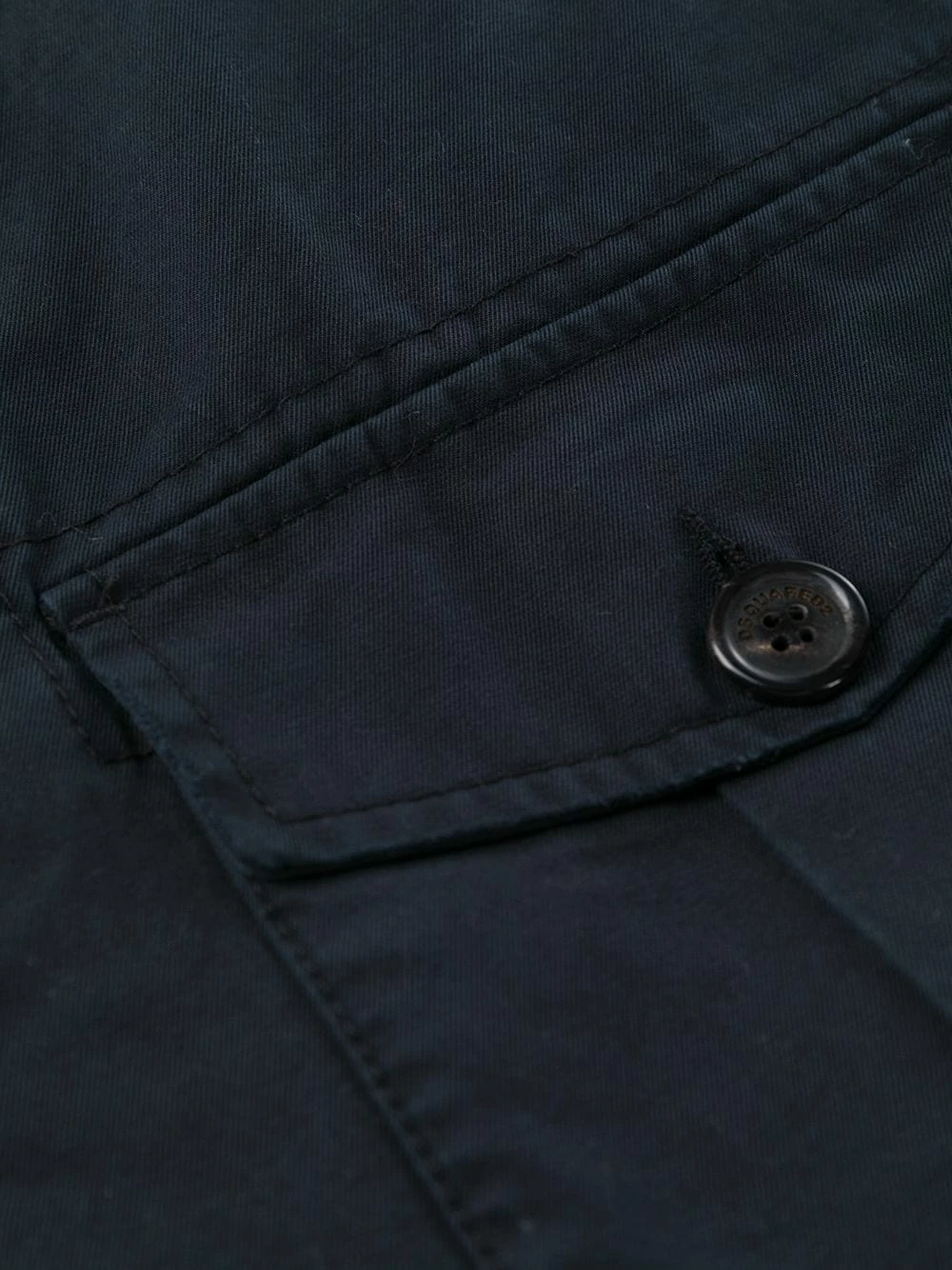 Fermeture à zip et boutons sur le devant, passants de ceinture, poches latérales cargo, poches arrière passepoilées. Matière : coton.