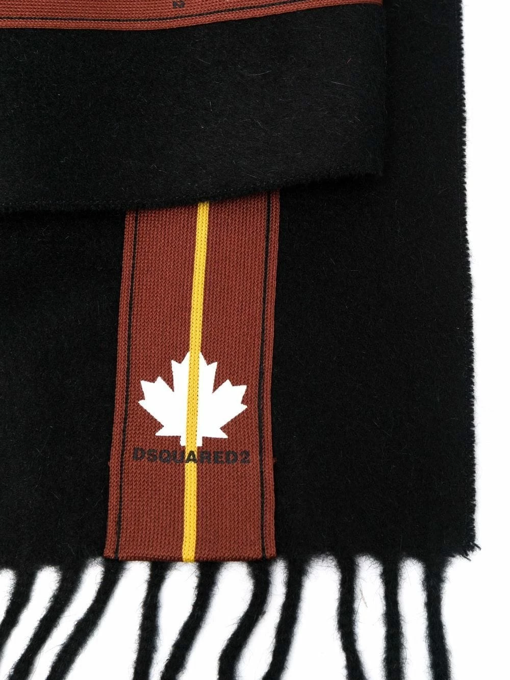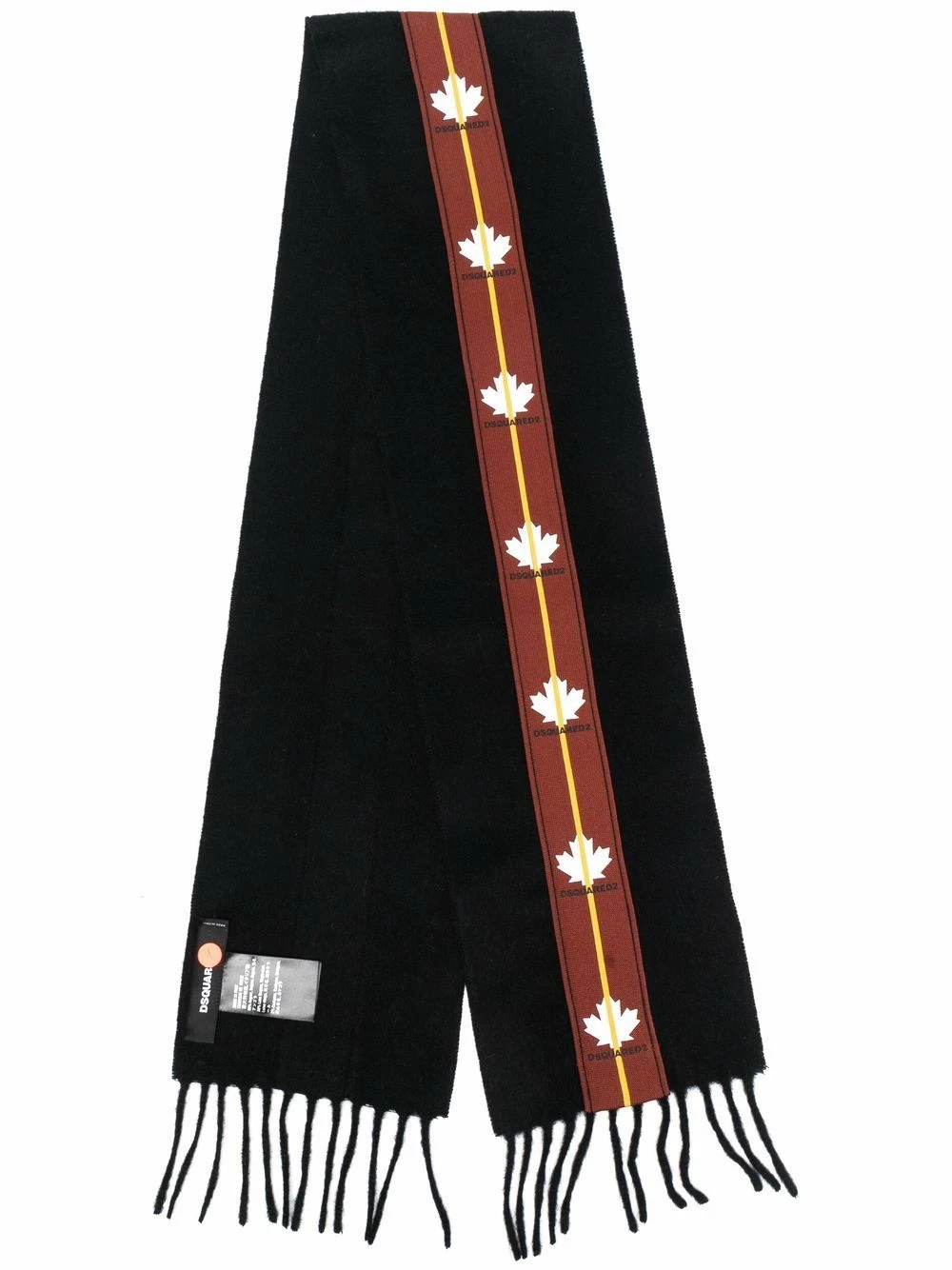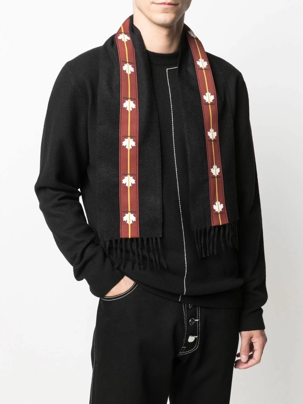 Finition à bande logo, imprimé feuille d’érable, finition à bande logo, bordure à franges. Couleur : noir.