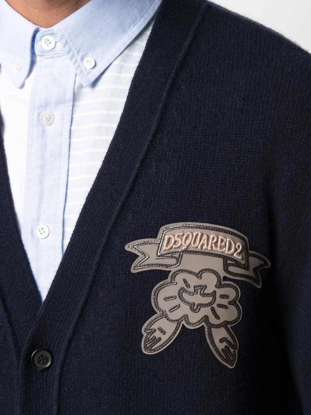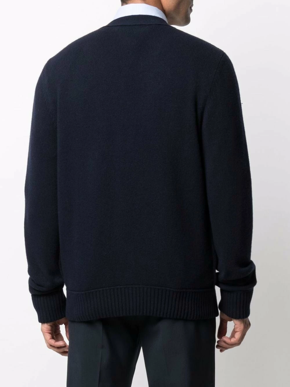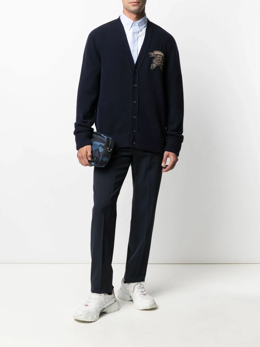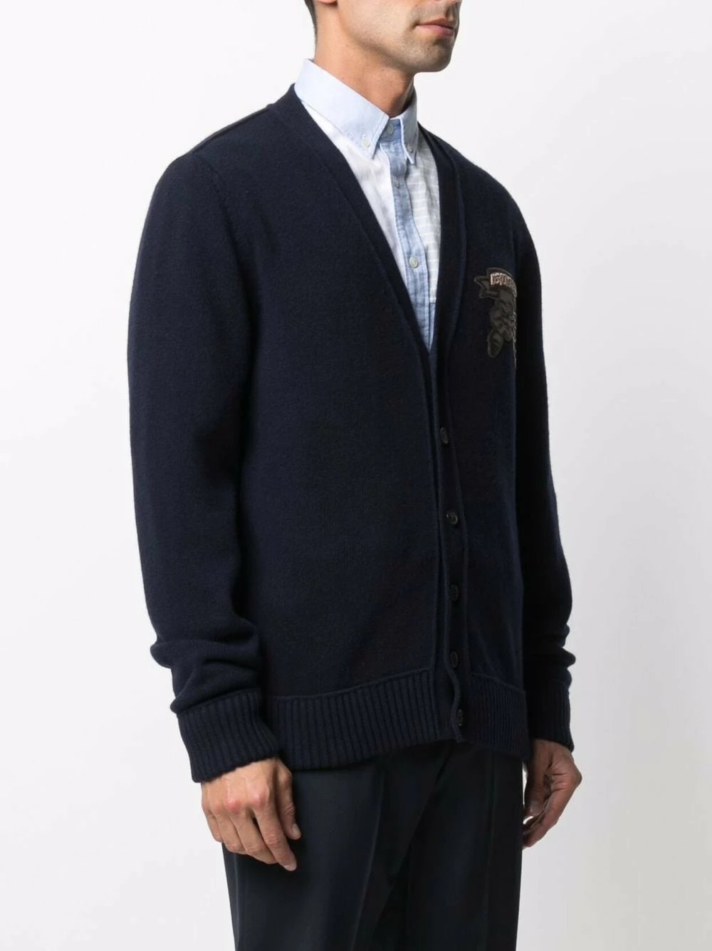 Patch poitrine à logo, design tricoté, col v, fermeture boutonnée, manches longues, manches à poignets resserrés.