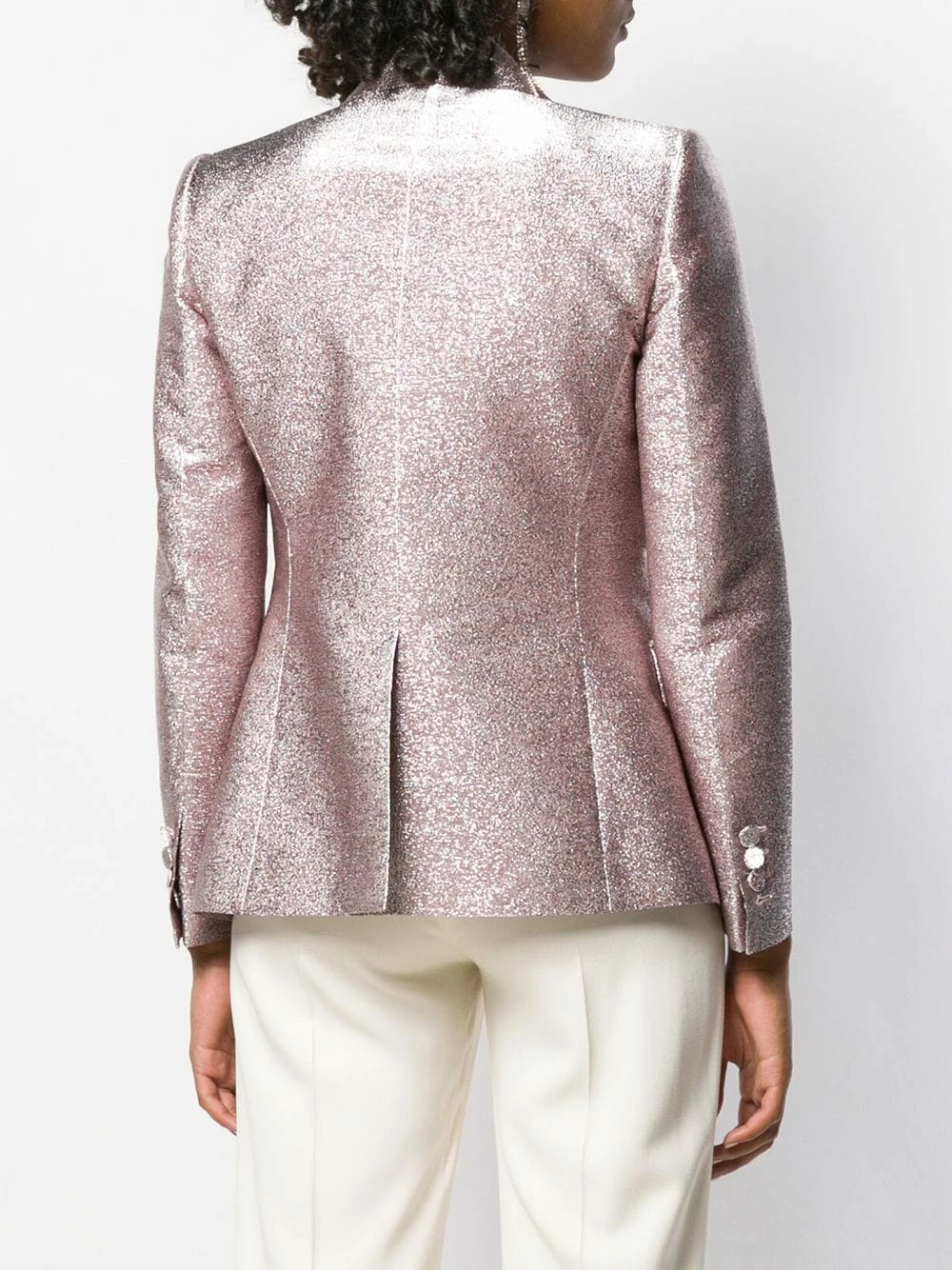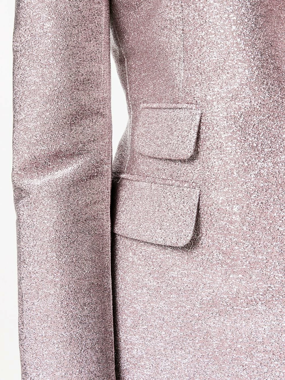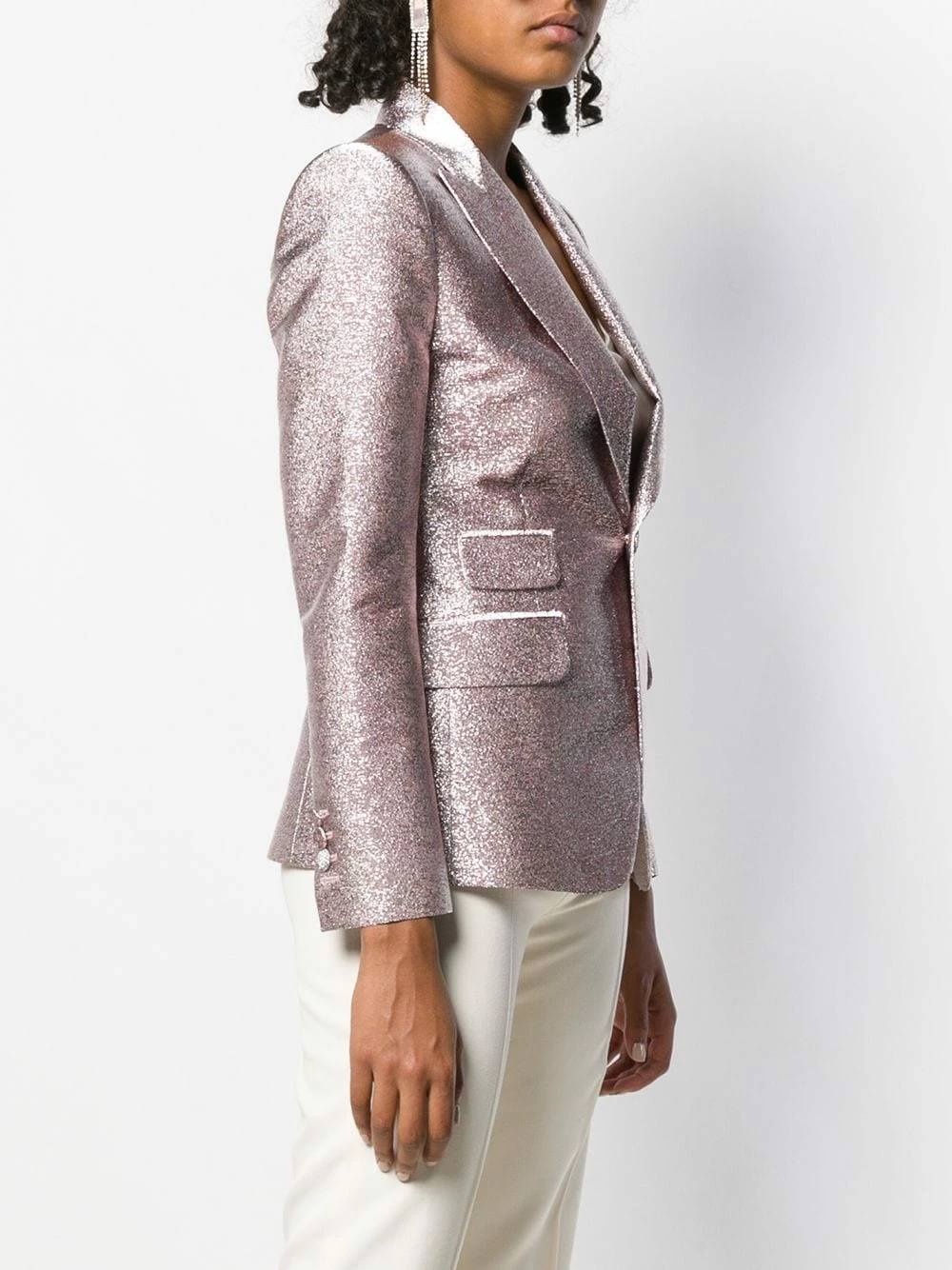 Blazer ajusté pailleté Dsquared2 avec revers pointus, poche passepoilée sur la poitrine, boutonnière sur le devant, poches devant à rabat, manches longues, poignets boutonnés et fente arrière. Couleur : rose.