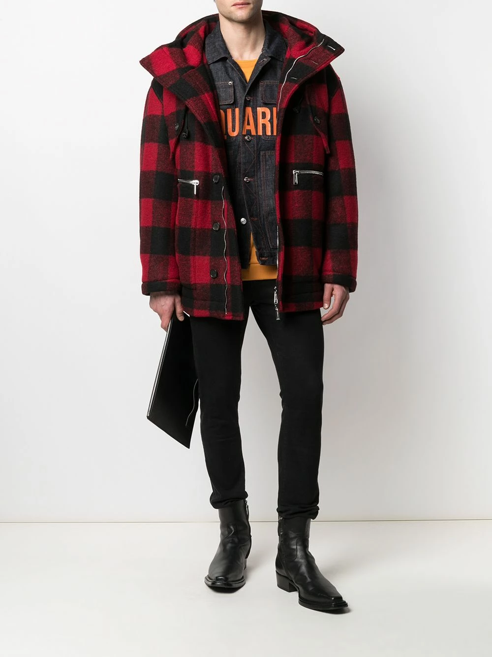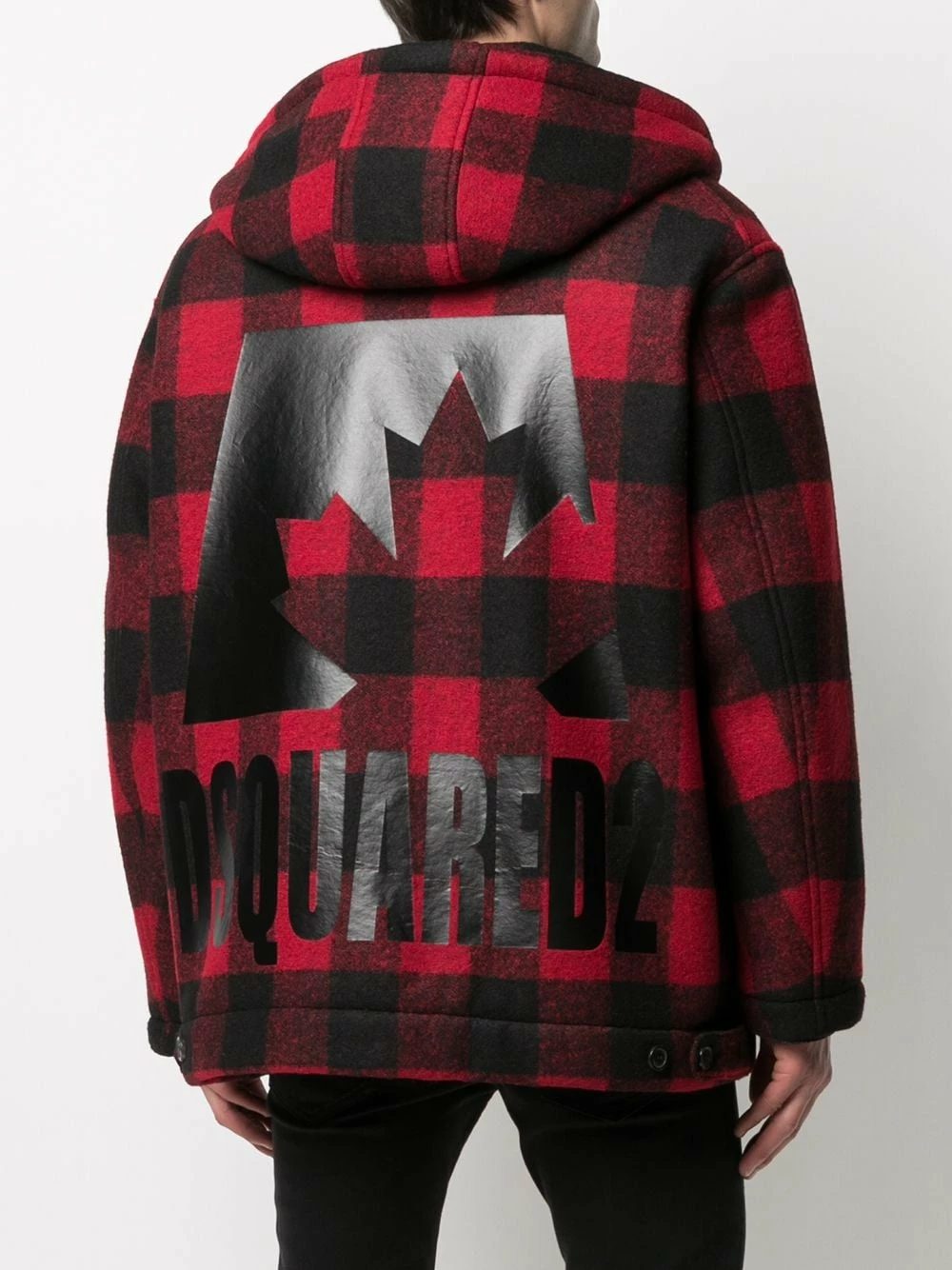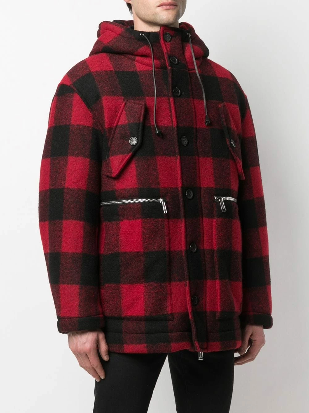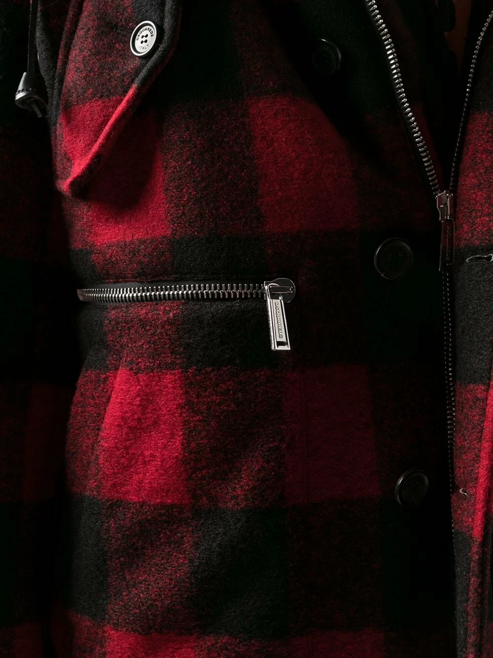 Carreaux, logo imprimé à l’arrière, col montant, capuche à lien de resserrage, manches longues, deux poches plaquées avant, poches à fermeture zippée devant, fermeture à zip et boutons sur le devant.