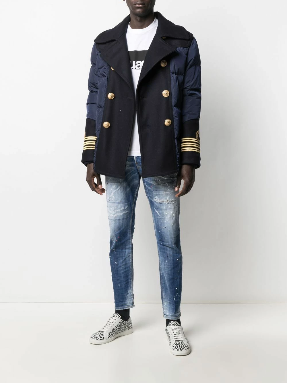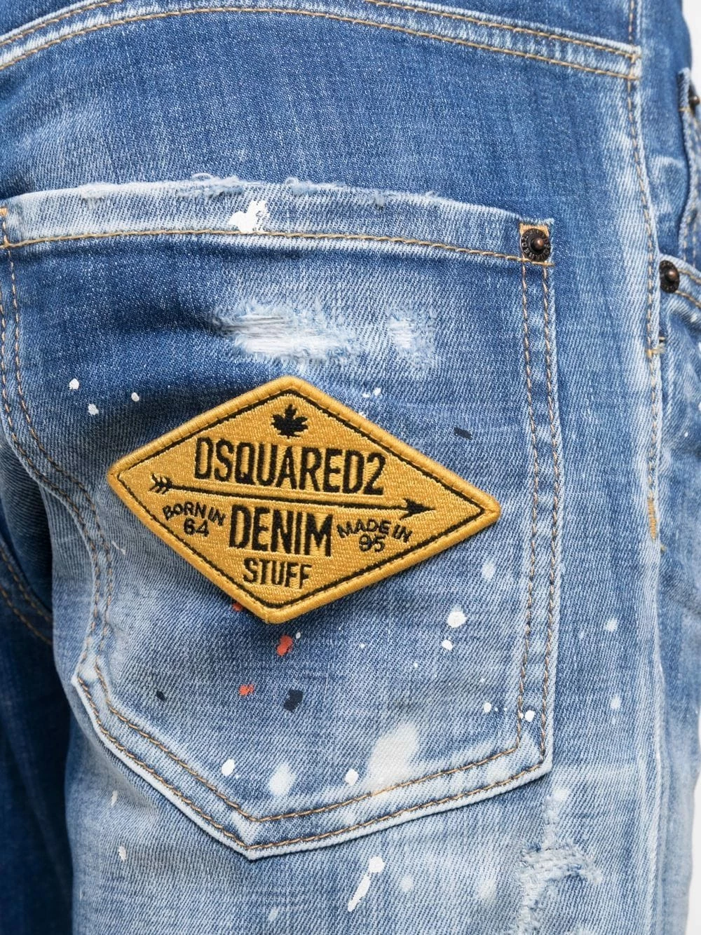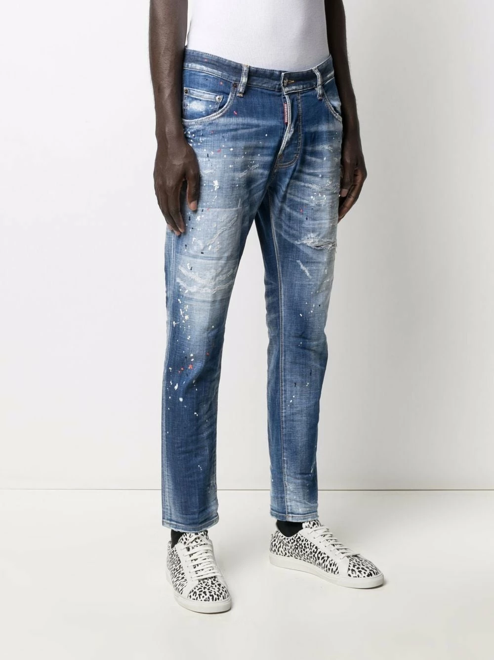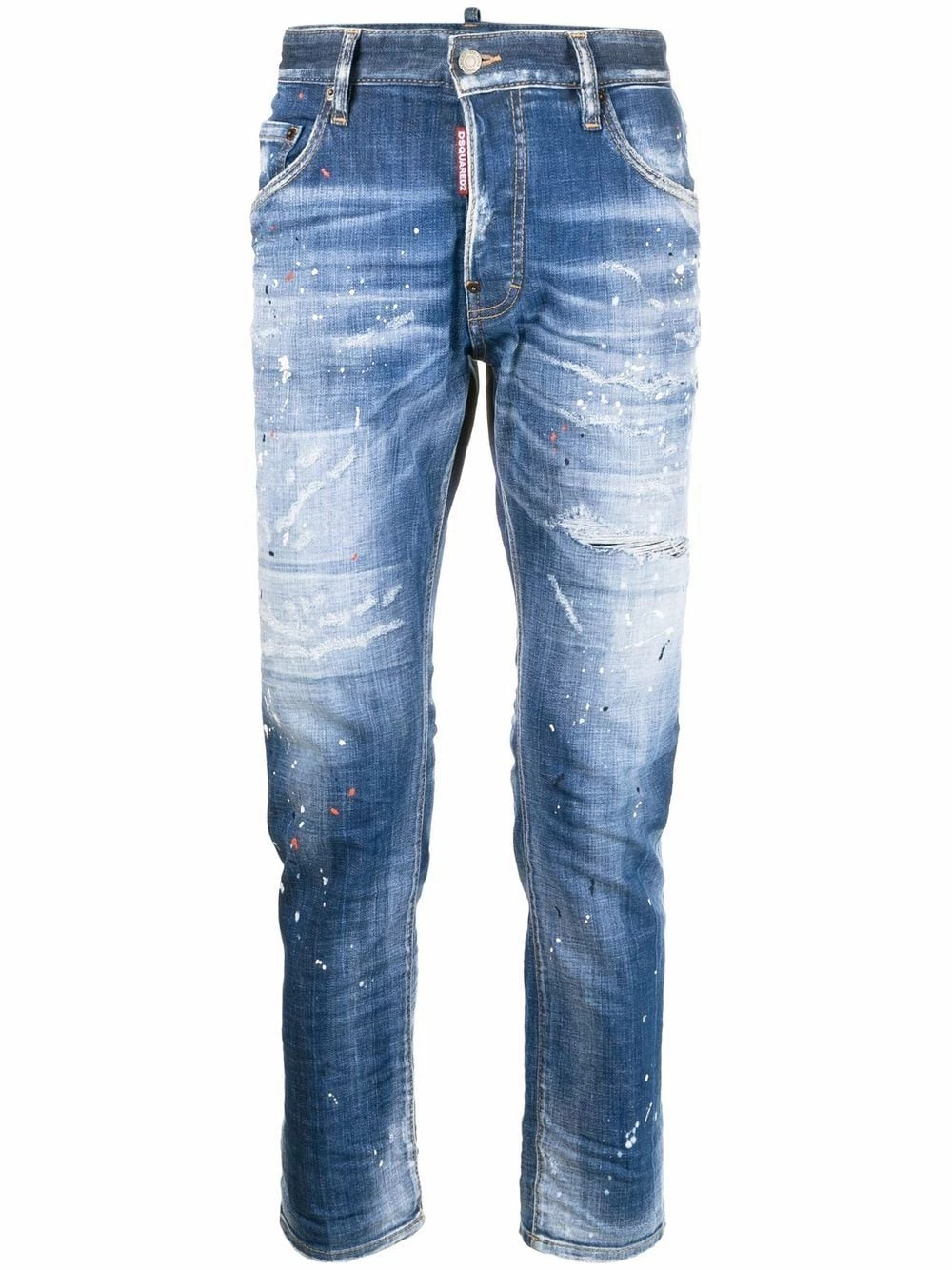 Effet taches de peinture, effet usé, patch logo sur l’arrière, fermeture boutonnée, passants de ceinture, cinq poches classiques, coupe droite. Couleur : bleu.