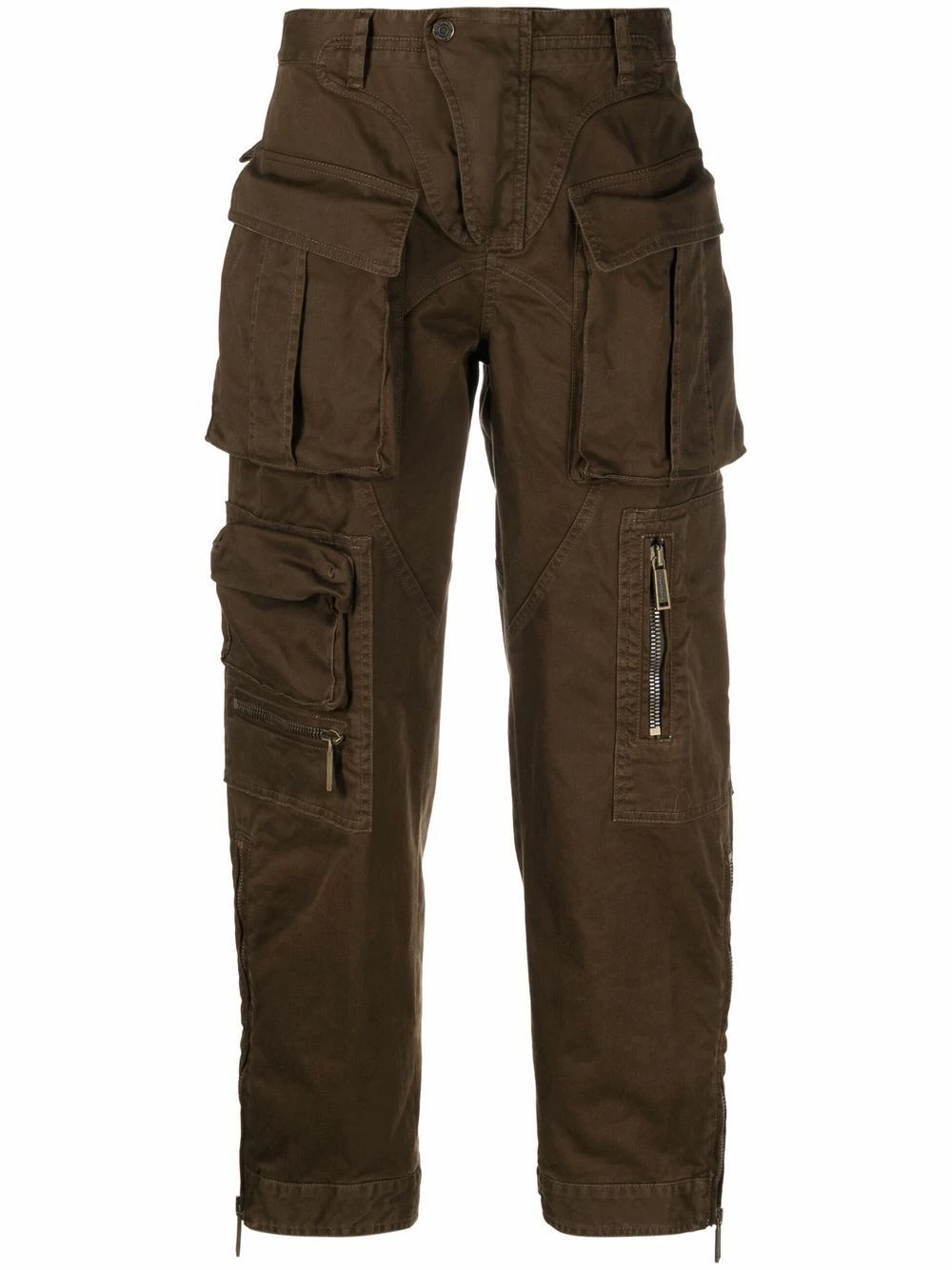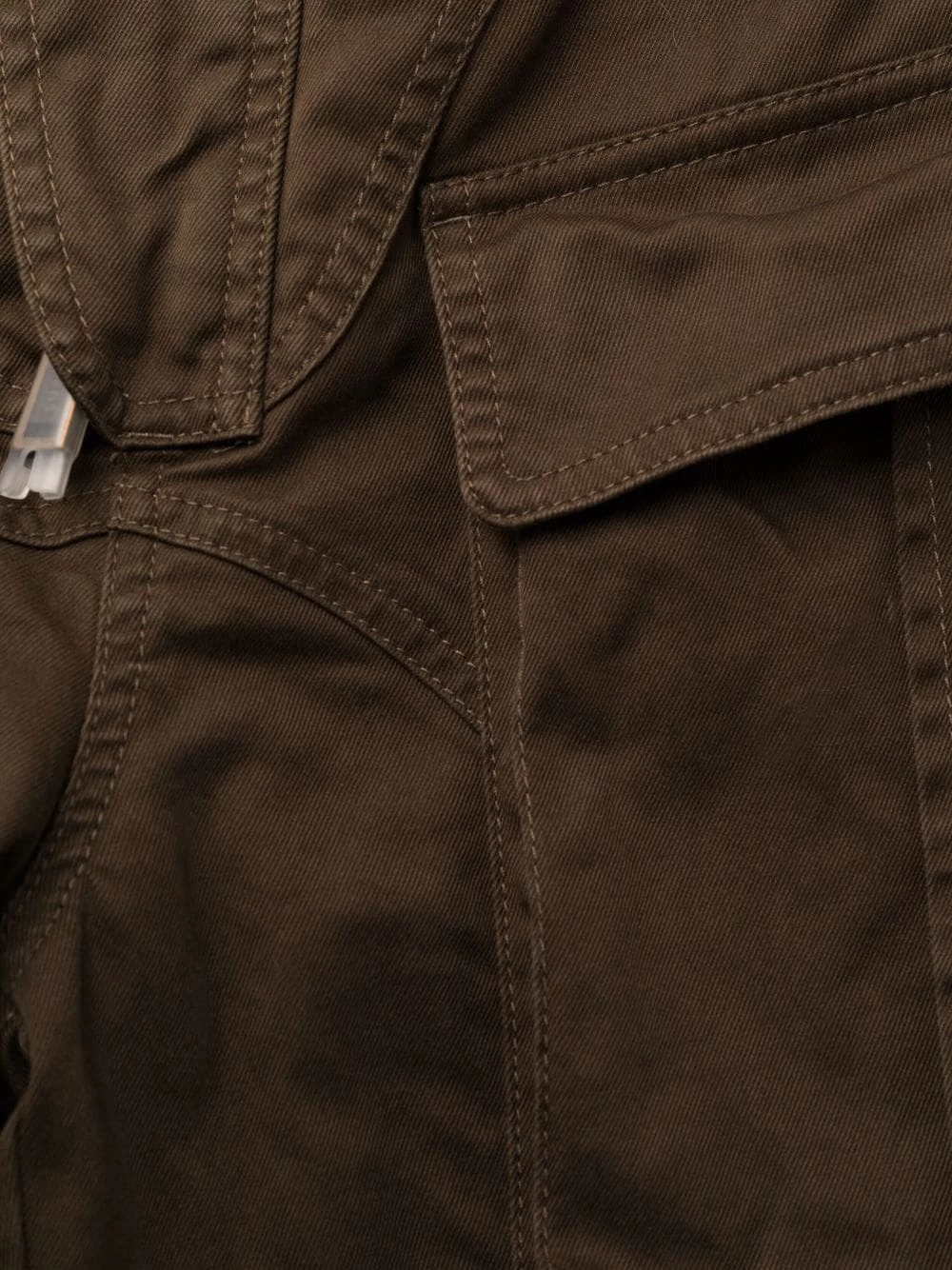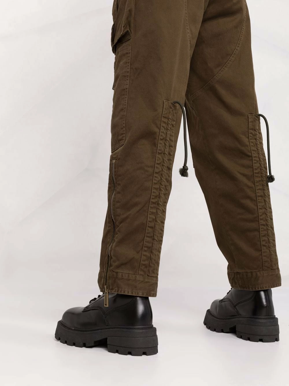 Taille mi-haute, coupe droite, passants de ceinture, fermeture dissimulée sur le devant, poches cargo multiples.