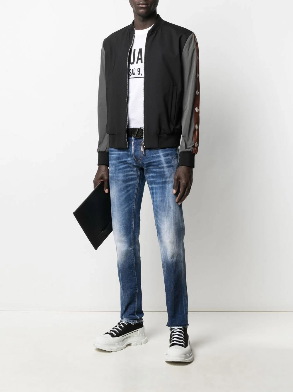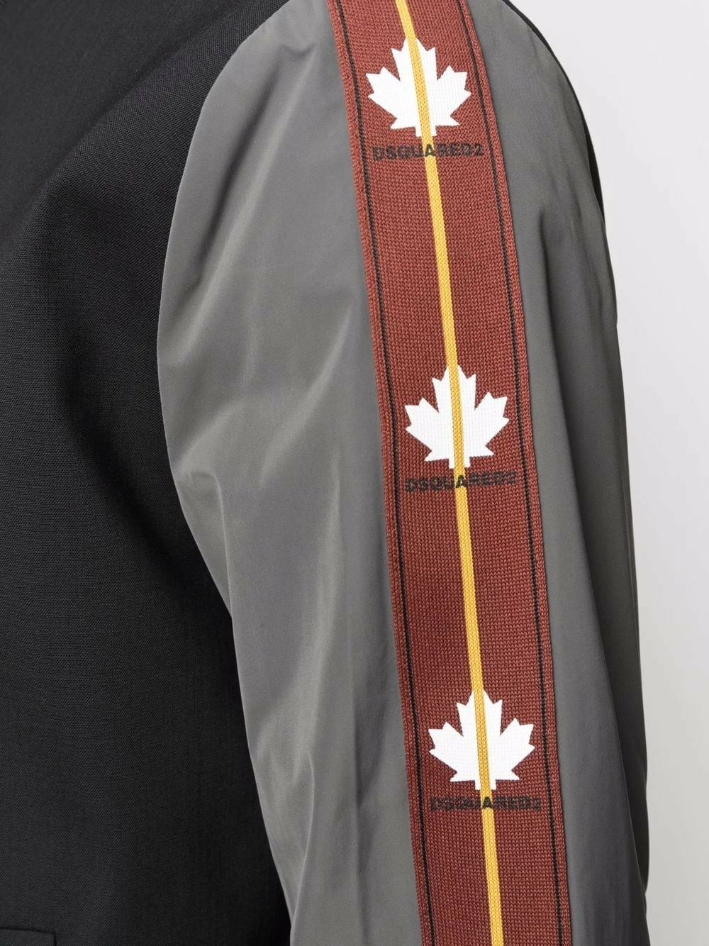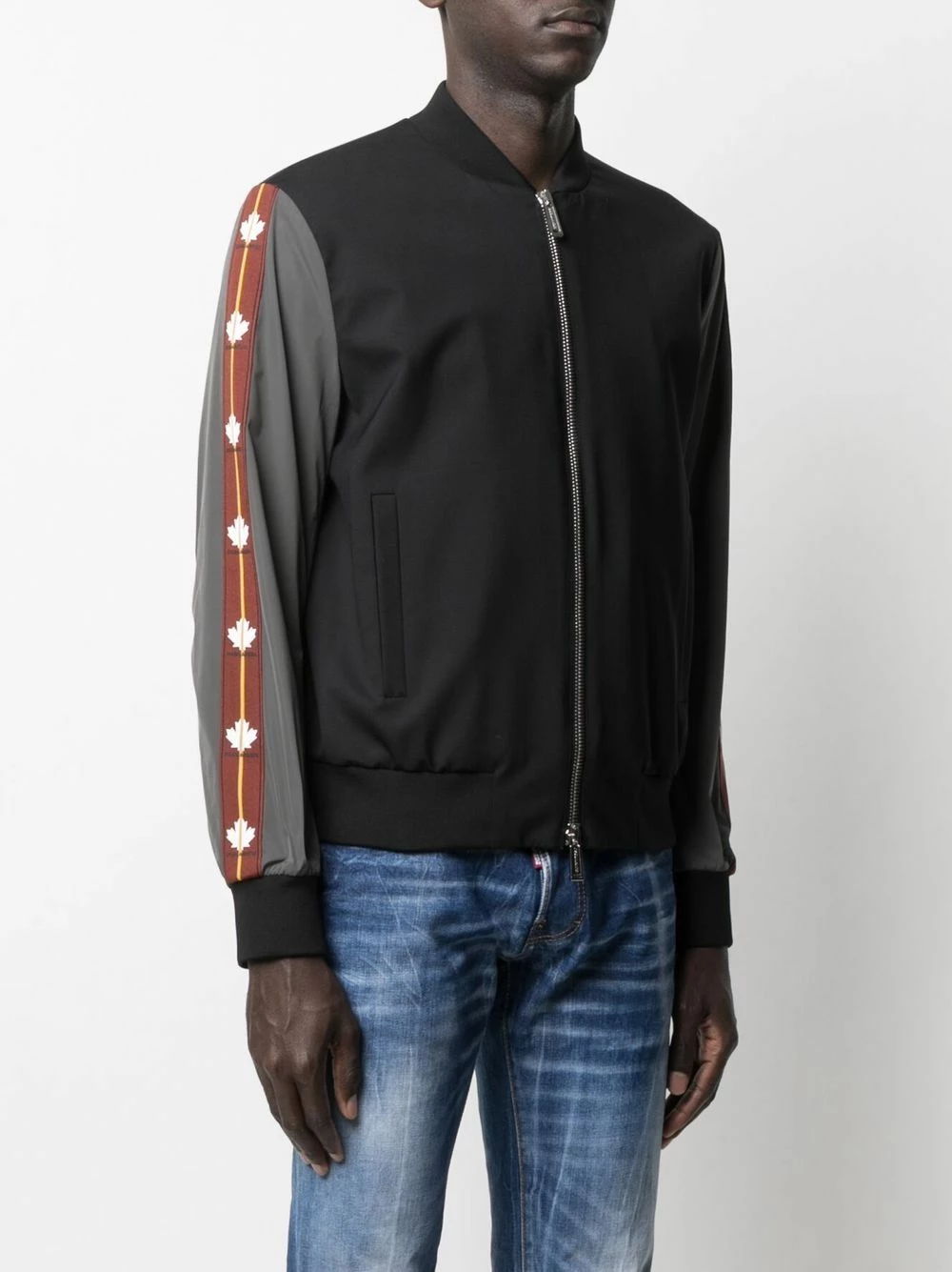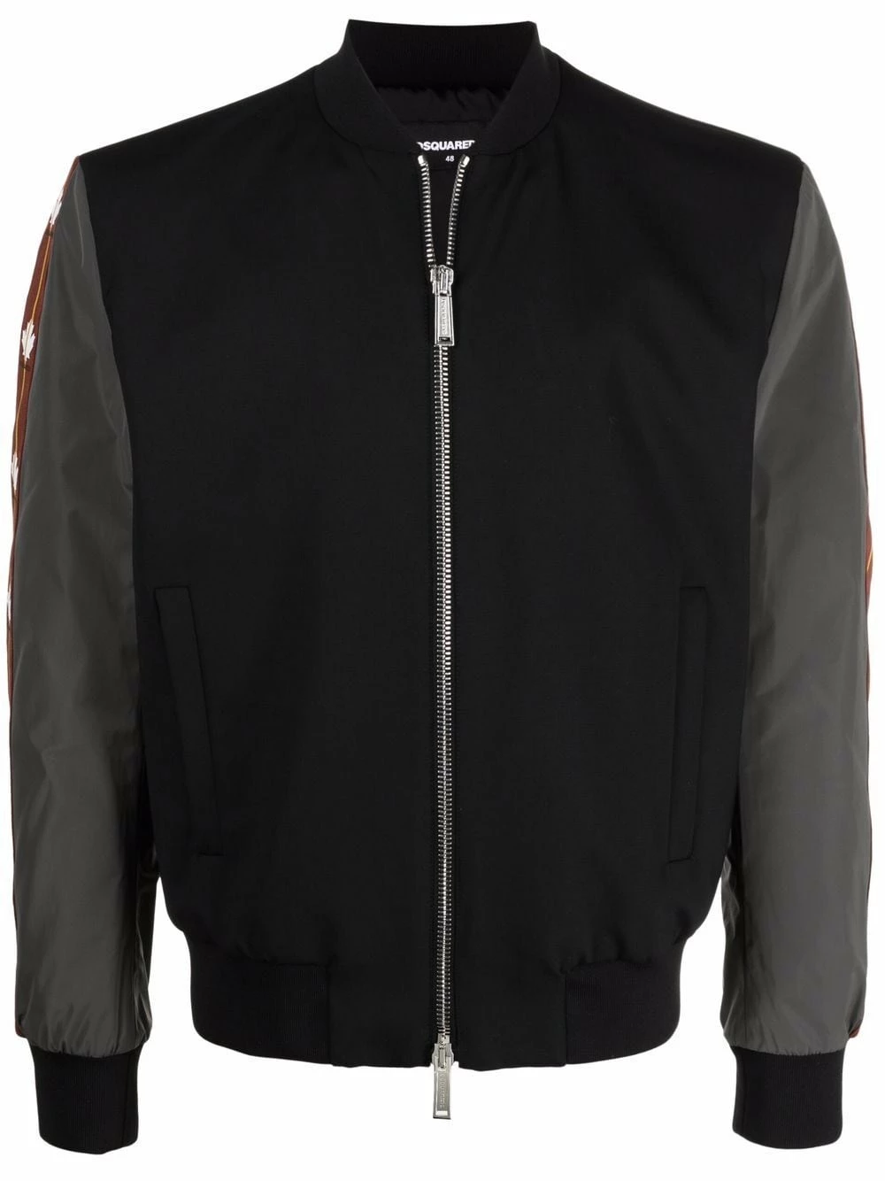 Bordure rayée, manches à tissu contrastant, col montant, fermeture zippée devant, deux poches latérales fendues. Couleur : noir.