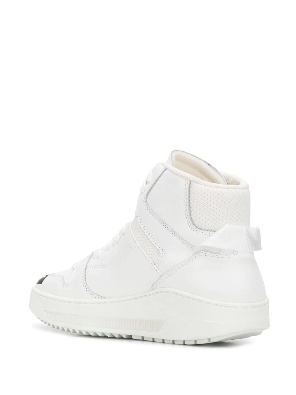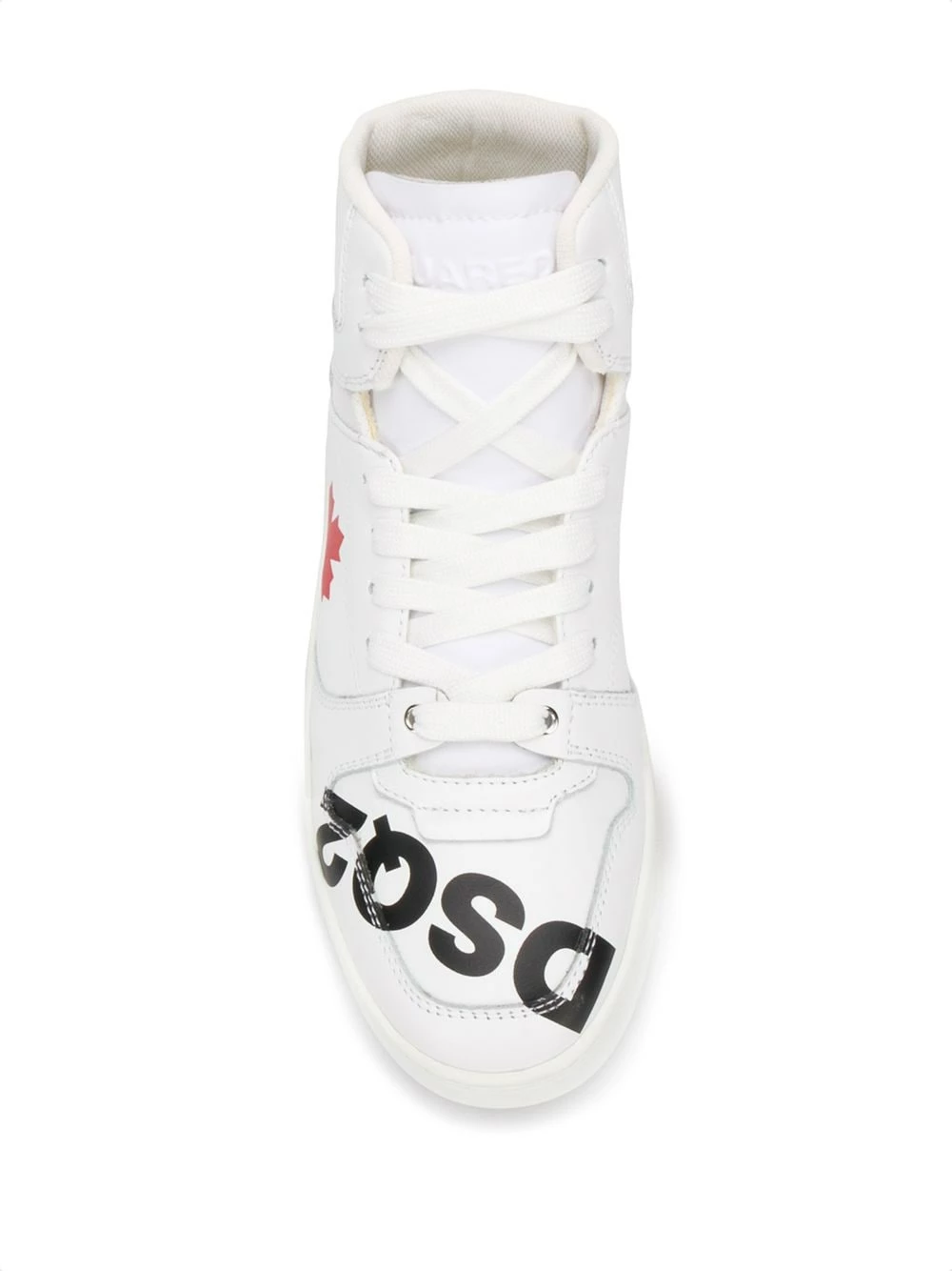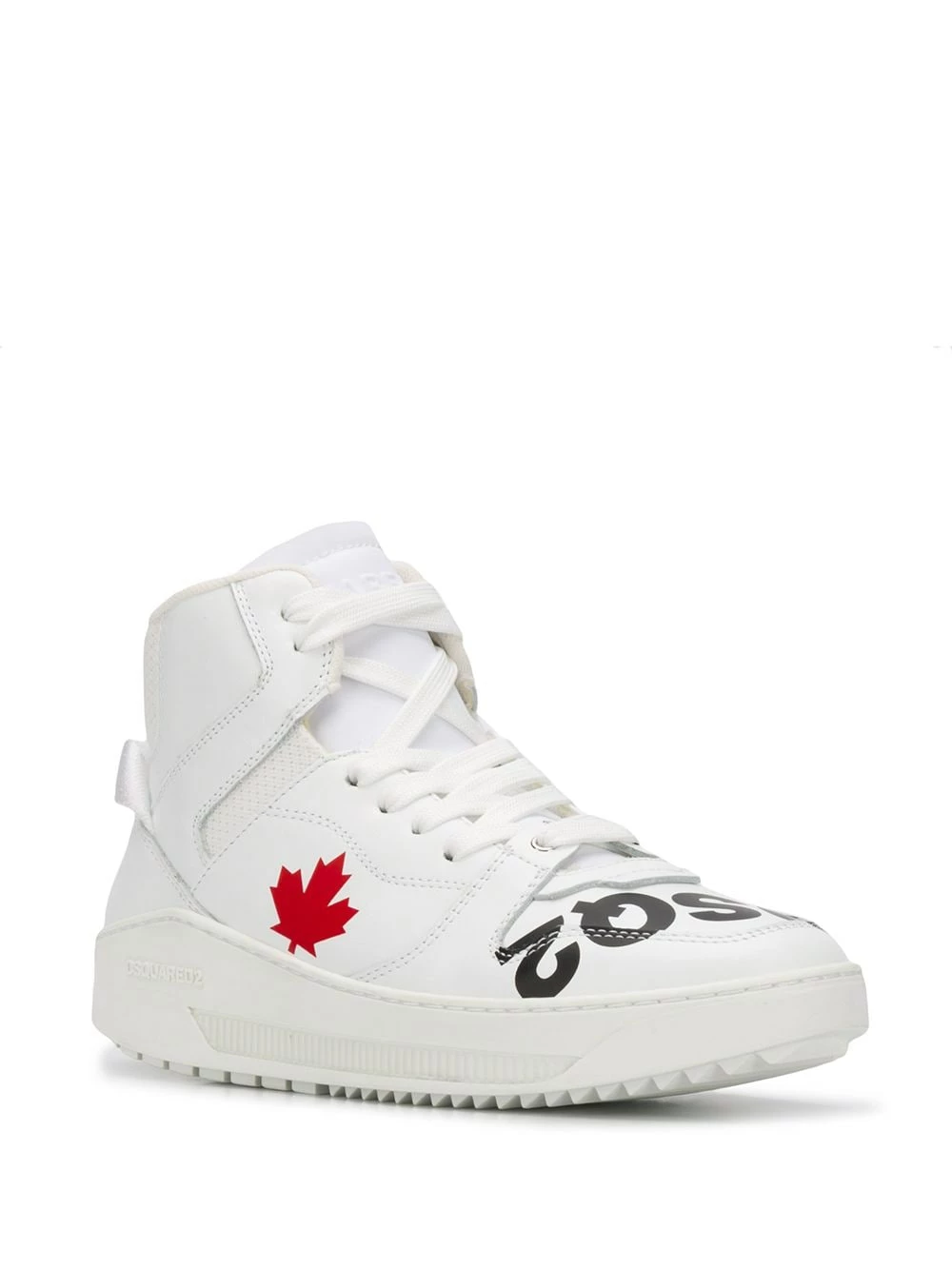 Baskets montantes en cuir de veau à logo imprimé Dsquared2 avec empiècements à coutures visibles, empiècements en résille, bout rond, logo imprimé, languette à logo, fermeture à lacets et semelle crantée en caoutchouc. Couleur: blanc.