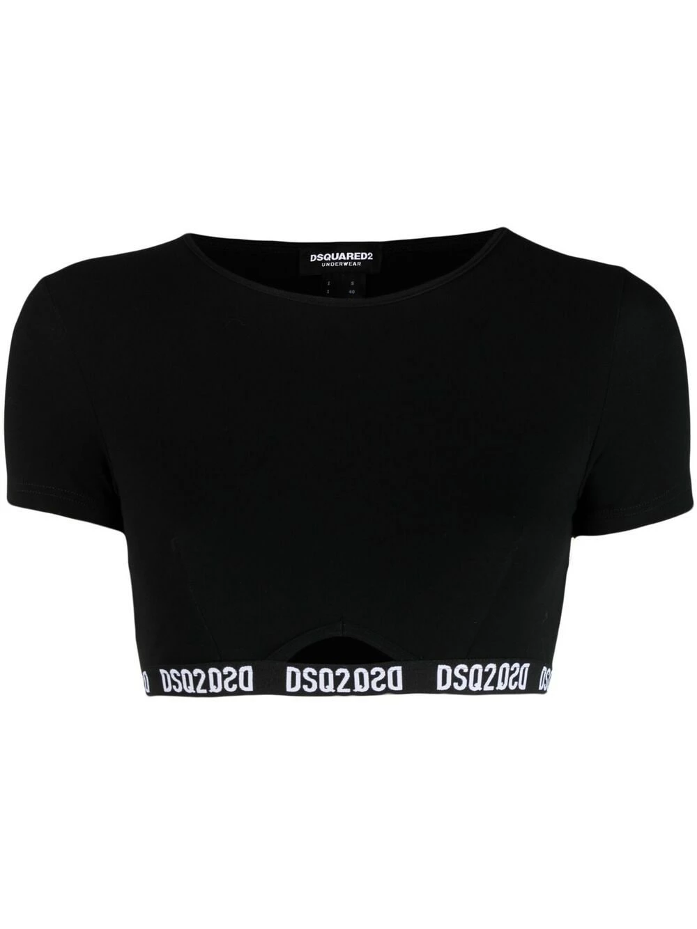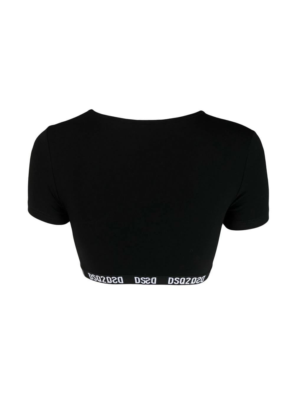 Détails de découpes, ourlet à logo imprimé, coupe courte, encolure ronde, manches courtes. Couleur : noir.
