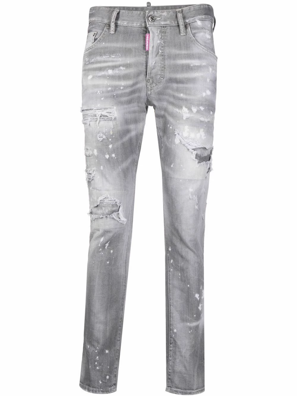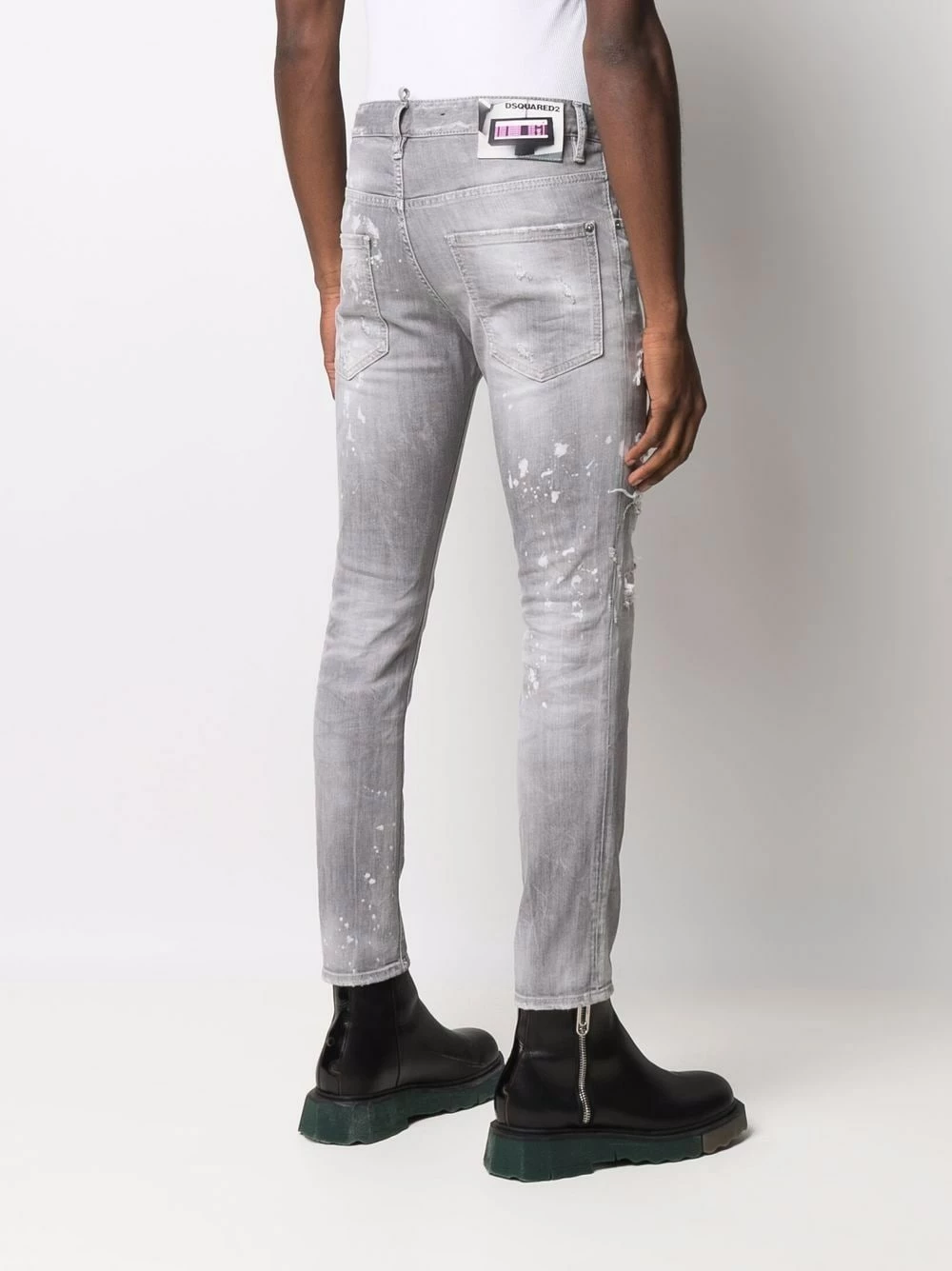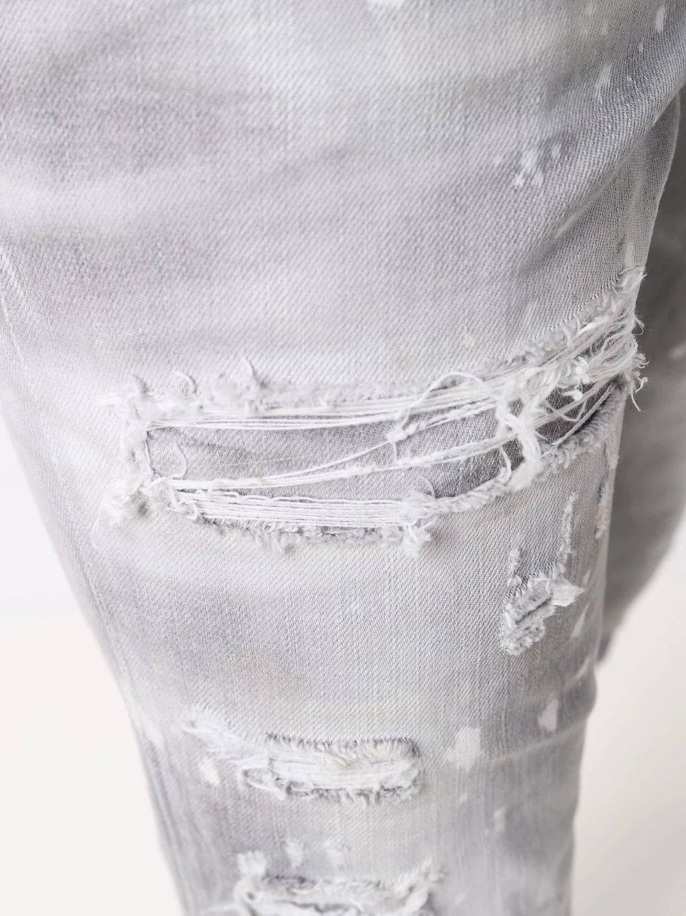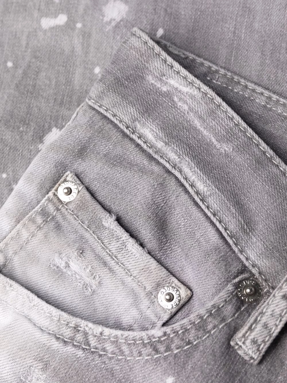 Finitions effilochées, effet délavé, coupe slim, cinq poches classiques, boutonnière sur le devant.