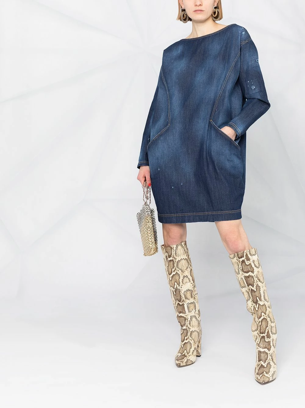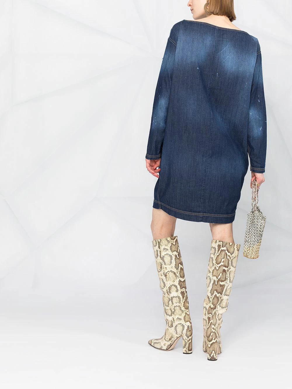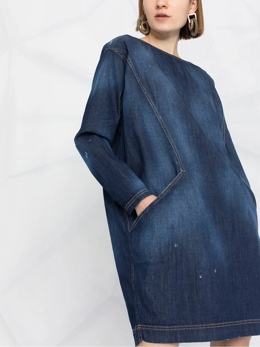Effet délavé, effet usé, encolure bateau, manches longues, poches latérales fendues, ourlet droit. Couleur : bleu.