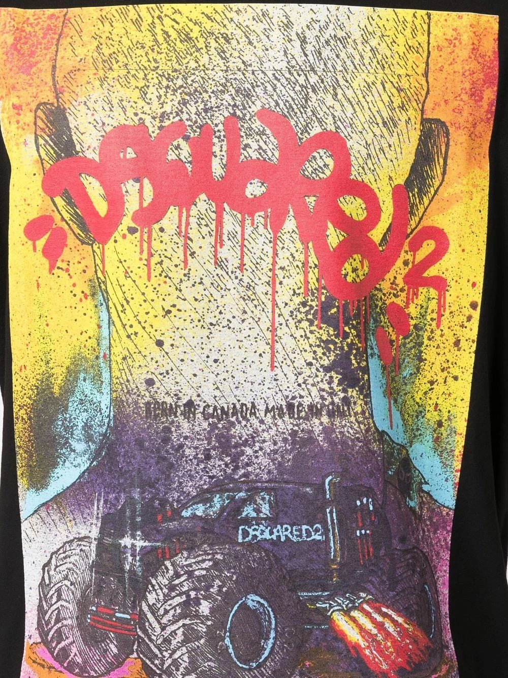 Tricot point jersey, imprimé graphique sur le buste, encolure ras du cou, manches courtes. Matière : coton.