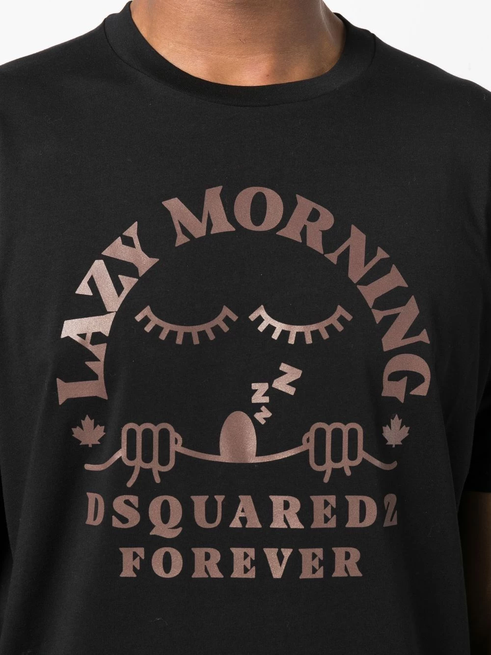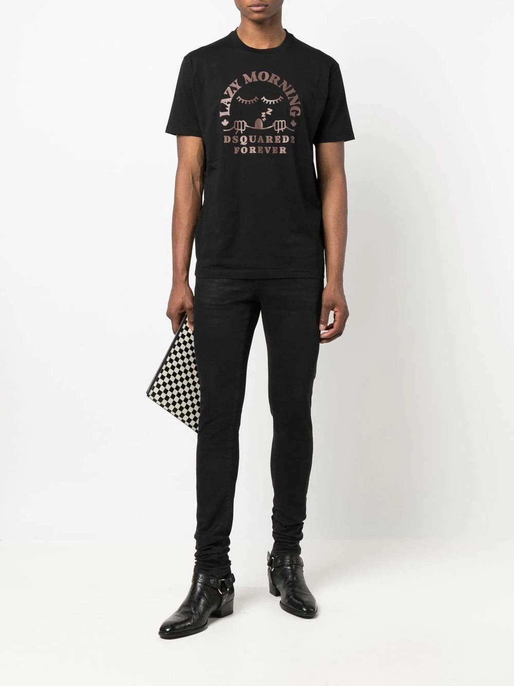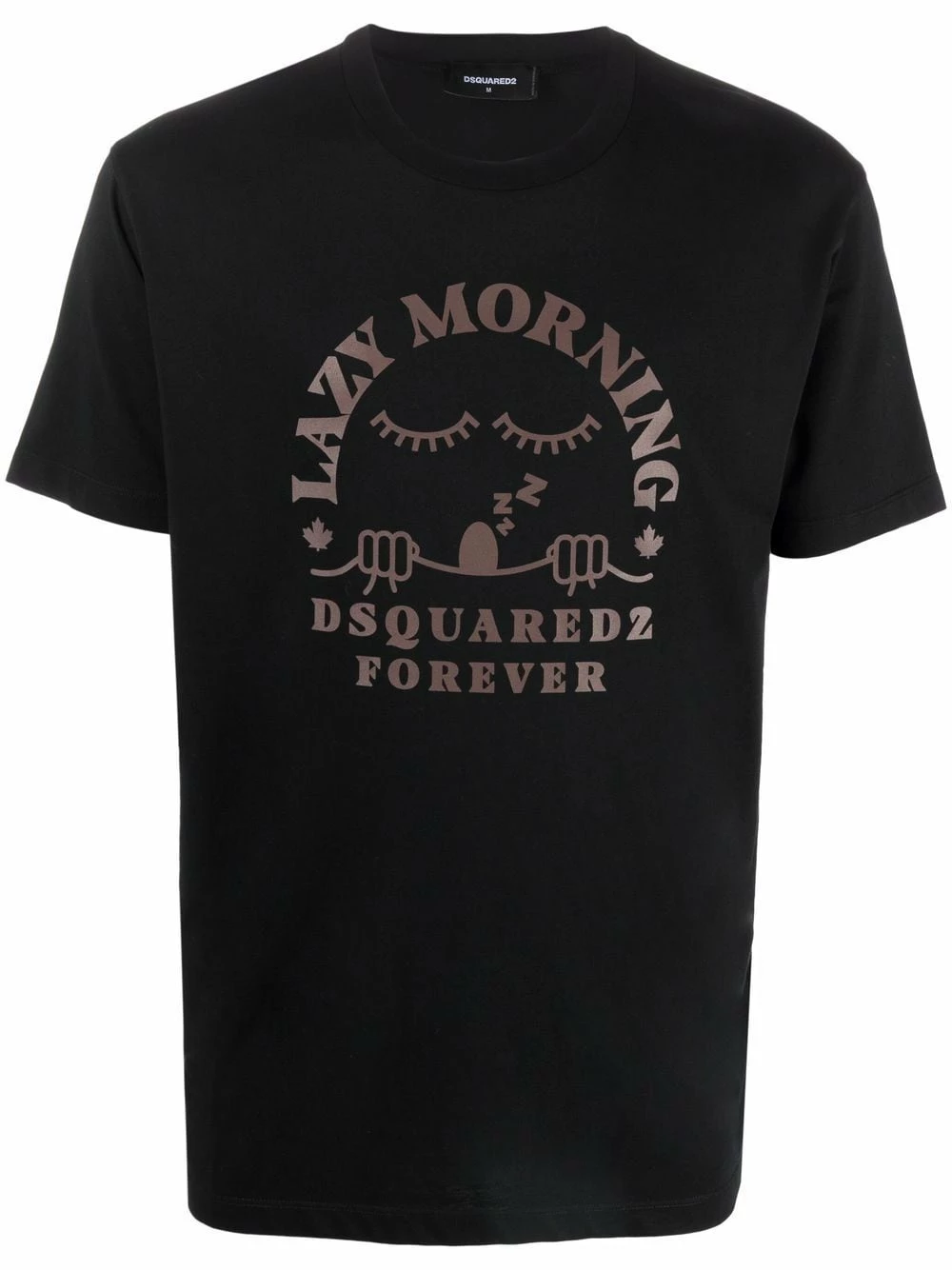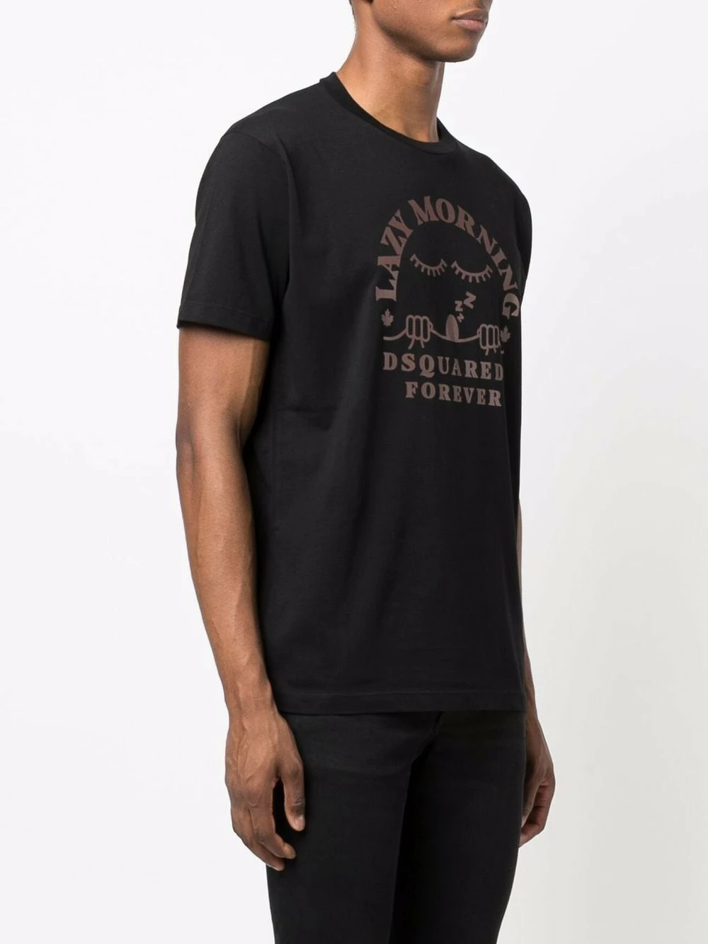 Slogan imprimé, logo imprimé sur le devant, encolure ras du cou, manches courtes. Couleur : noir. Matière : coton.