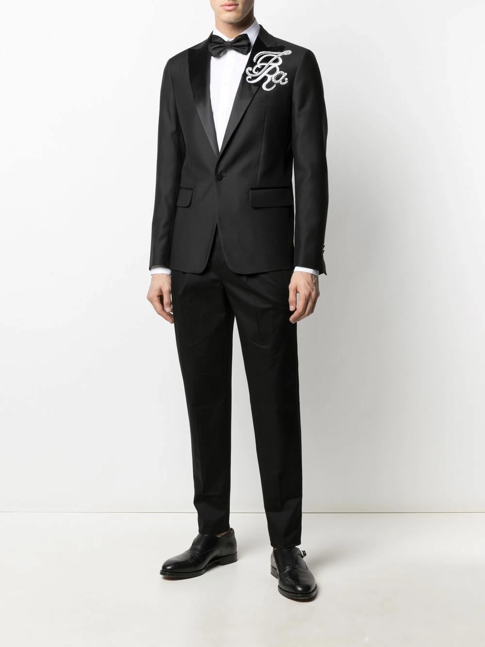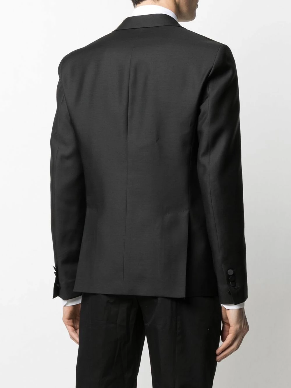 Motif brodé, revers pointus, boutonnière sur le devant, deux poches à rabat sur le devant, manches longues. Couleur : noir. Matière : laine vierge.