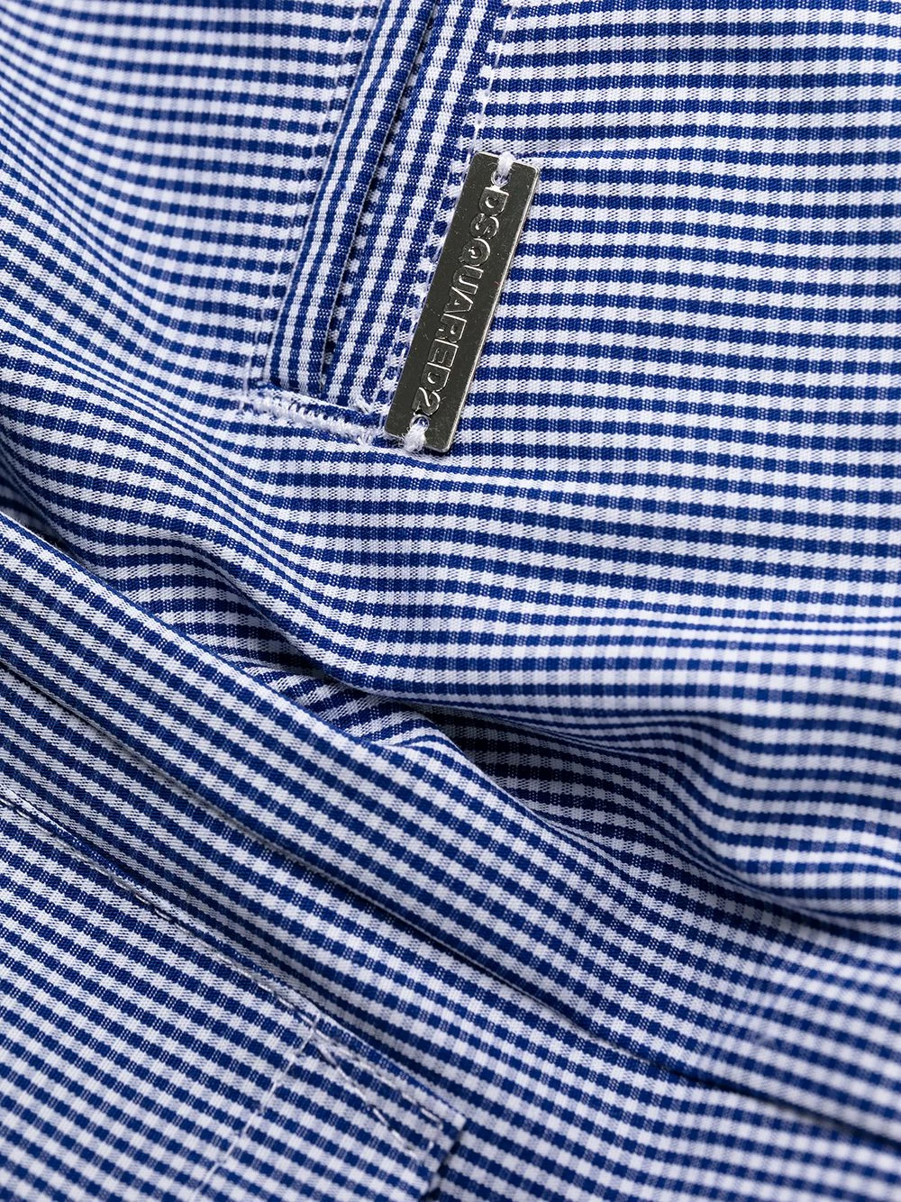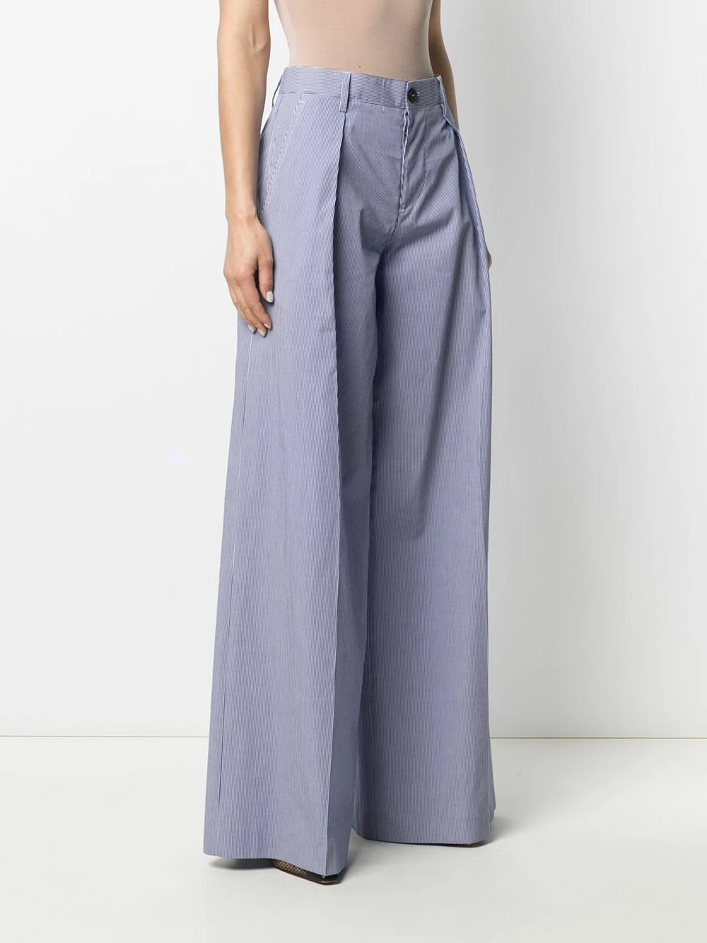 Taille haute, boutonnière dissimulée sur le devant, passants de ceinture, coupe ample, longueur maxi. Couleur : bleu. Matière : coton.