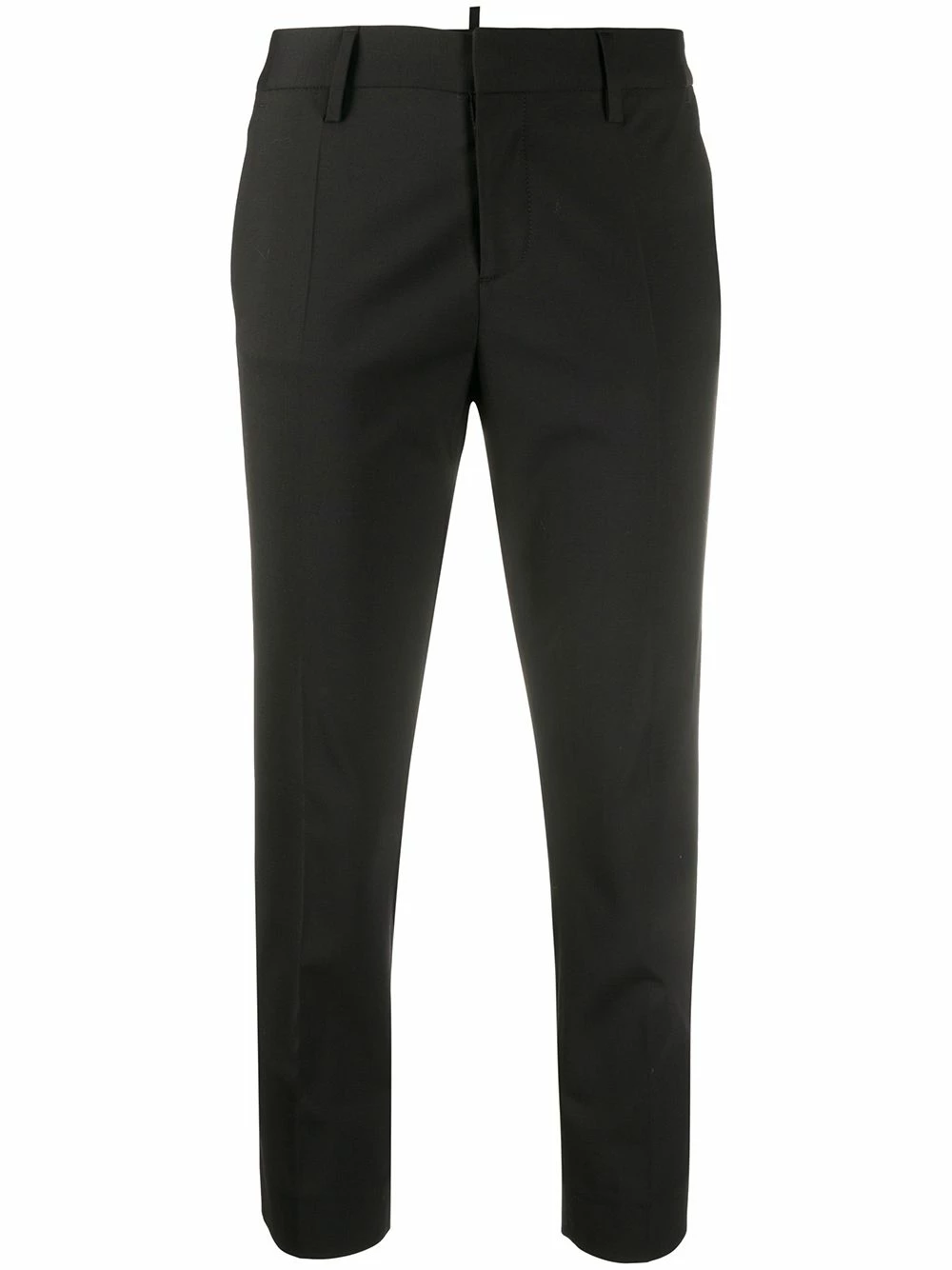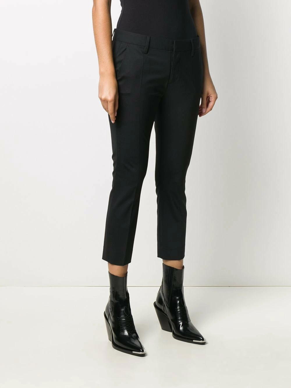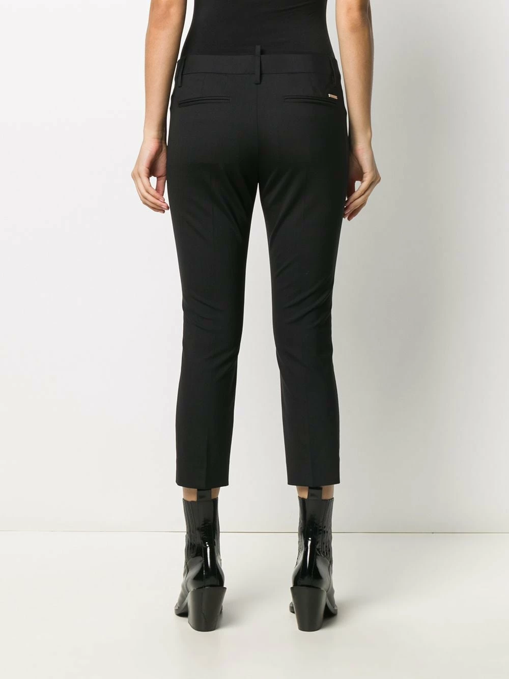 Coupe classique, longueur crop, taille basse, passants de ceinture, fermeture à zip et agrafes, deux poches latérales passepoilées, poches arrière passepoilées. Couleur : noir.
