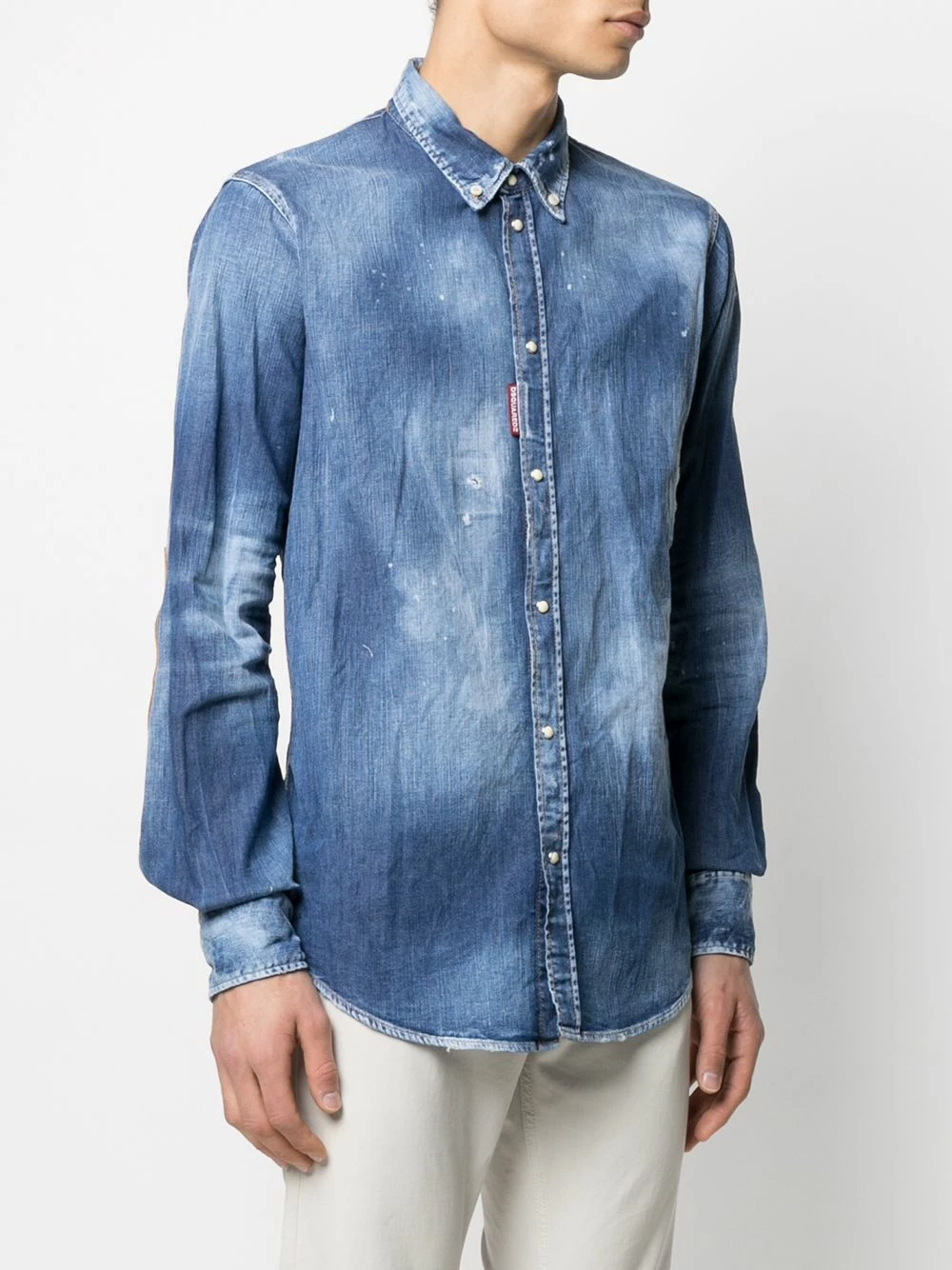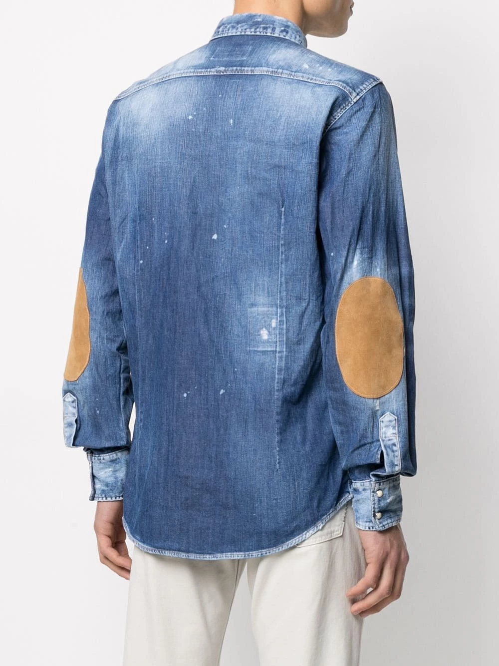 Effet usé, effet légèrement délavé, patch logo sur le devant, col classique, manches longues, poignets boutonnés, coudières, fermeture à boutons pression sur le devant. Couleur : Bleu.