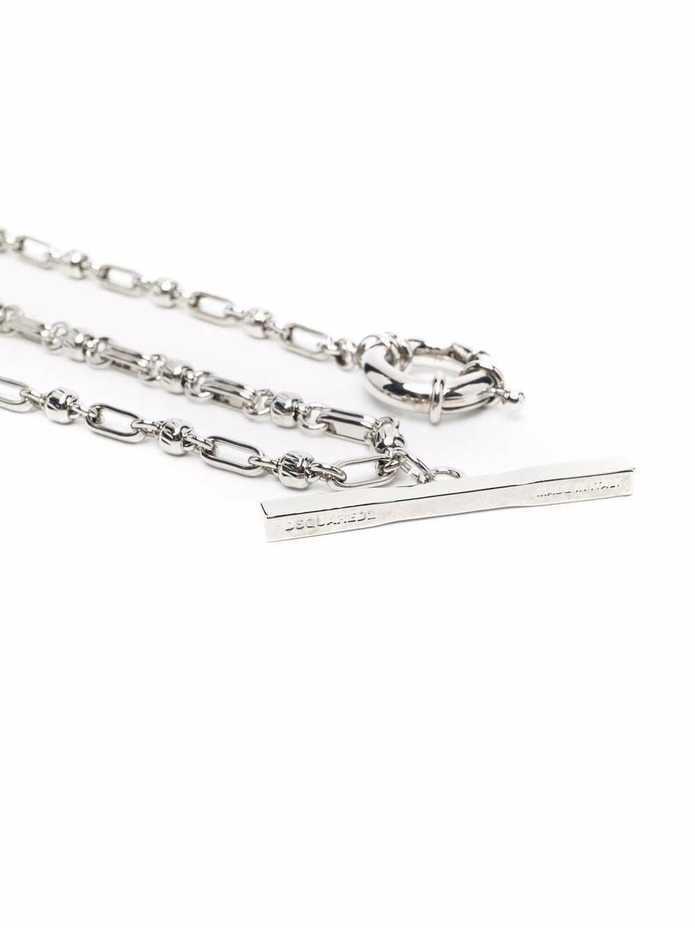 Logo gravé, détails de chaînes, coupe longue. Couleur : argent.
