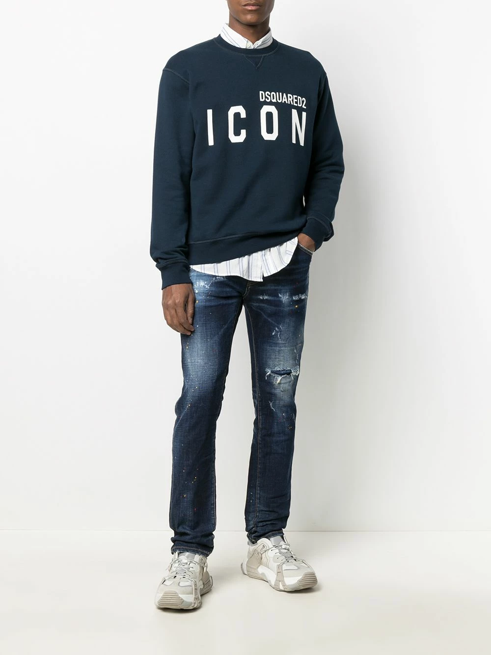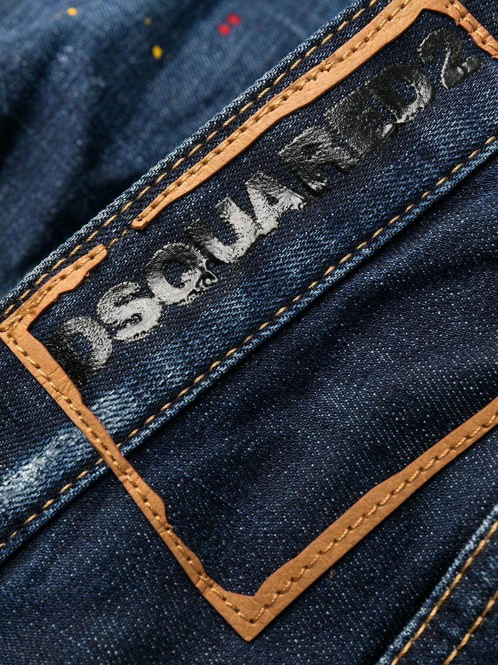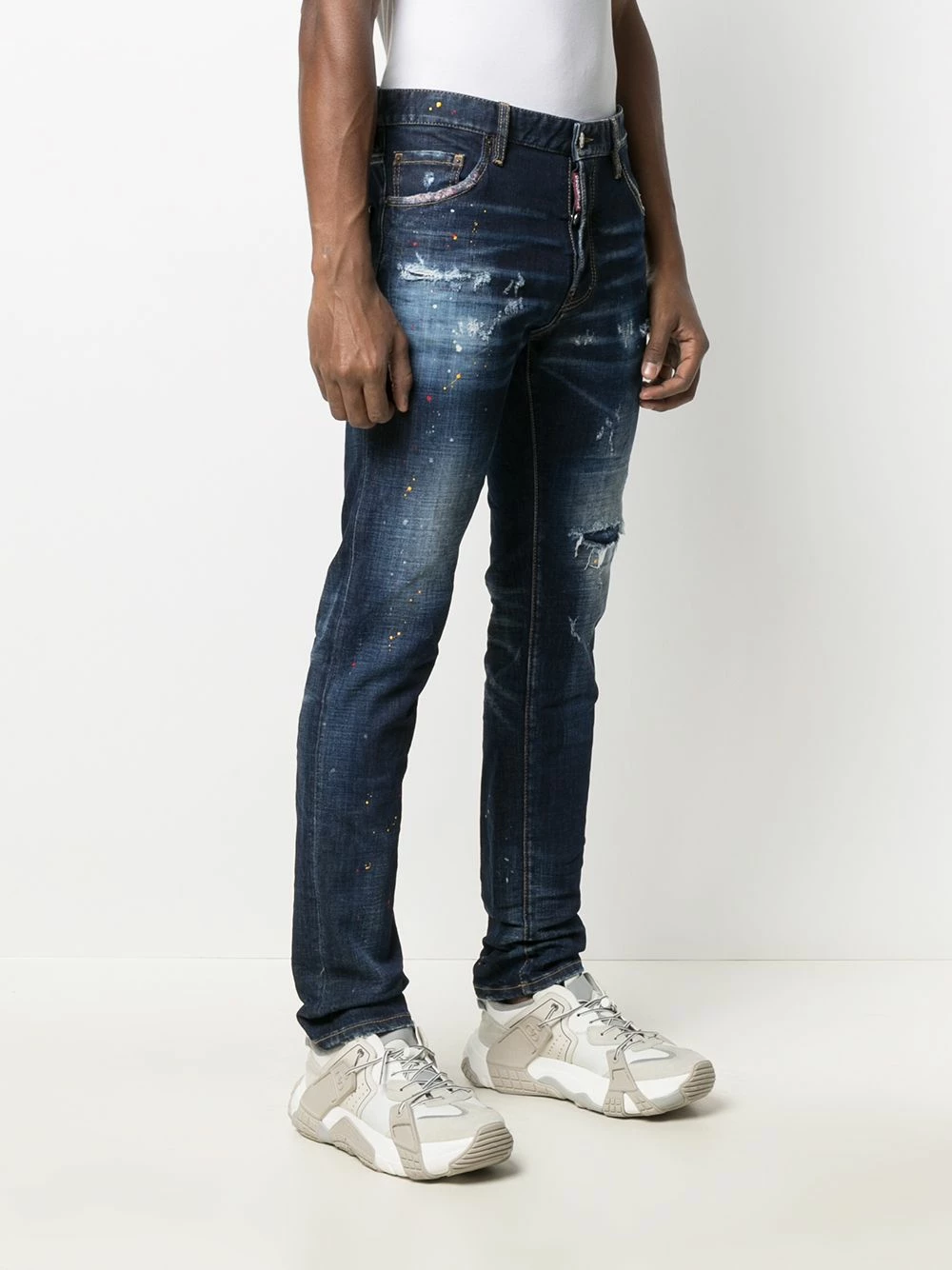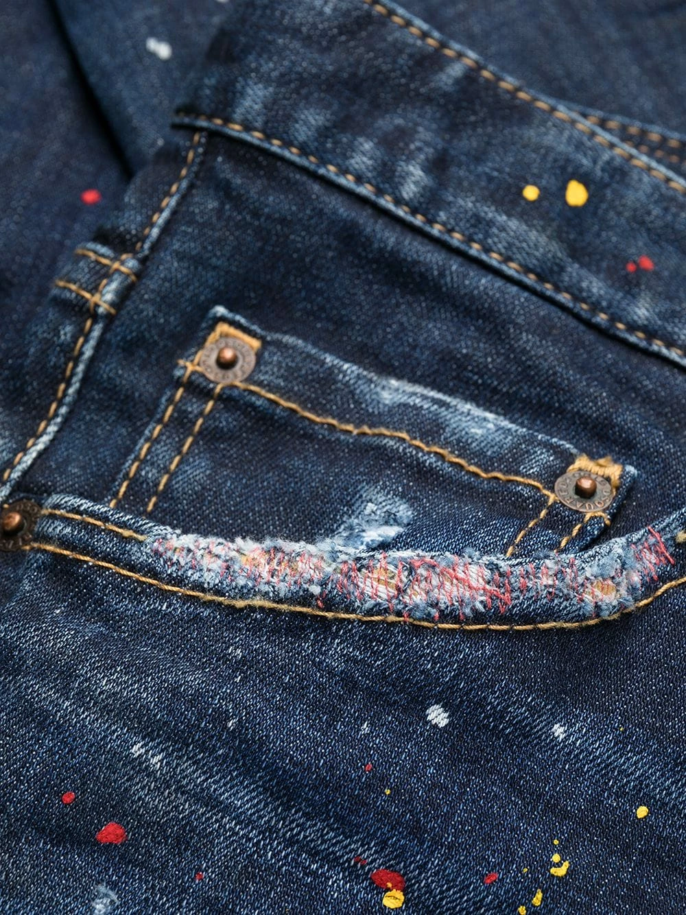 Effet taches de peinture, finitions effilochées, taille mi-haute, passants de ceinture, boutonnière sur le devant, 5 poches classiques, coupe droite. Couleur : bleu. Matière : coton.
