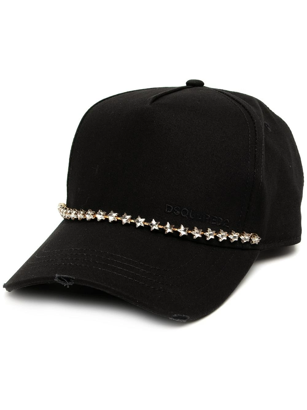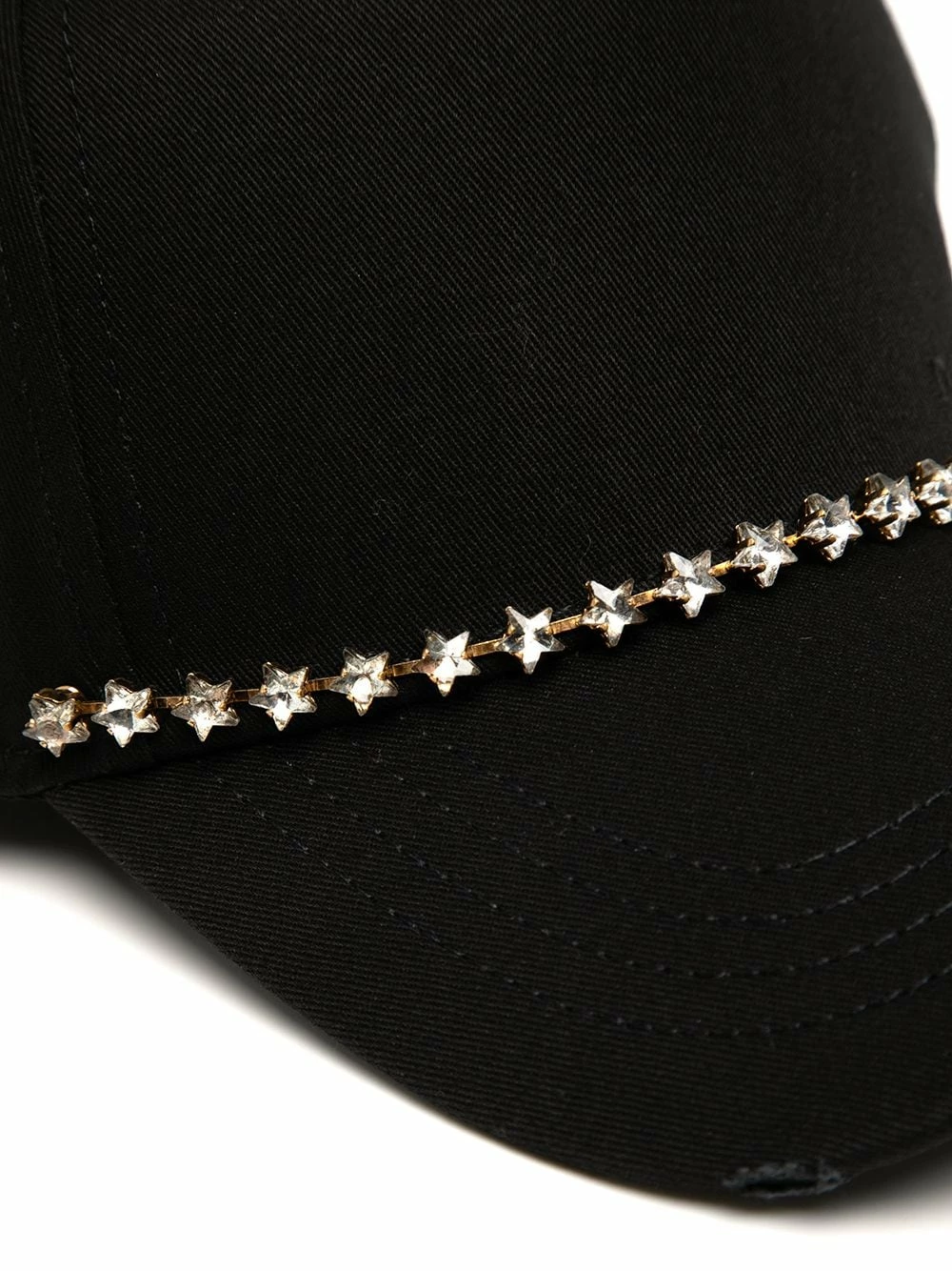 Design à six empiècements, effet usé, logo brodé sur le devant, étoiles métalliques, ornement en cristal, bord incurvé. Couleur : noir. Matière : coton.