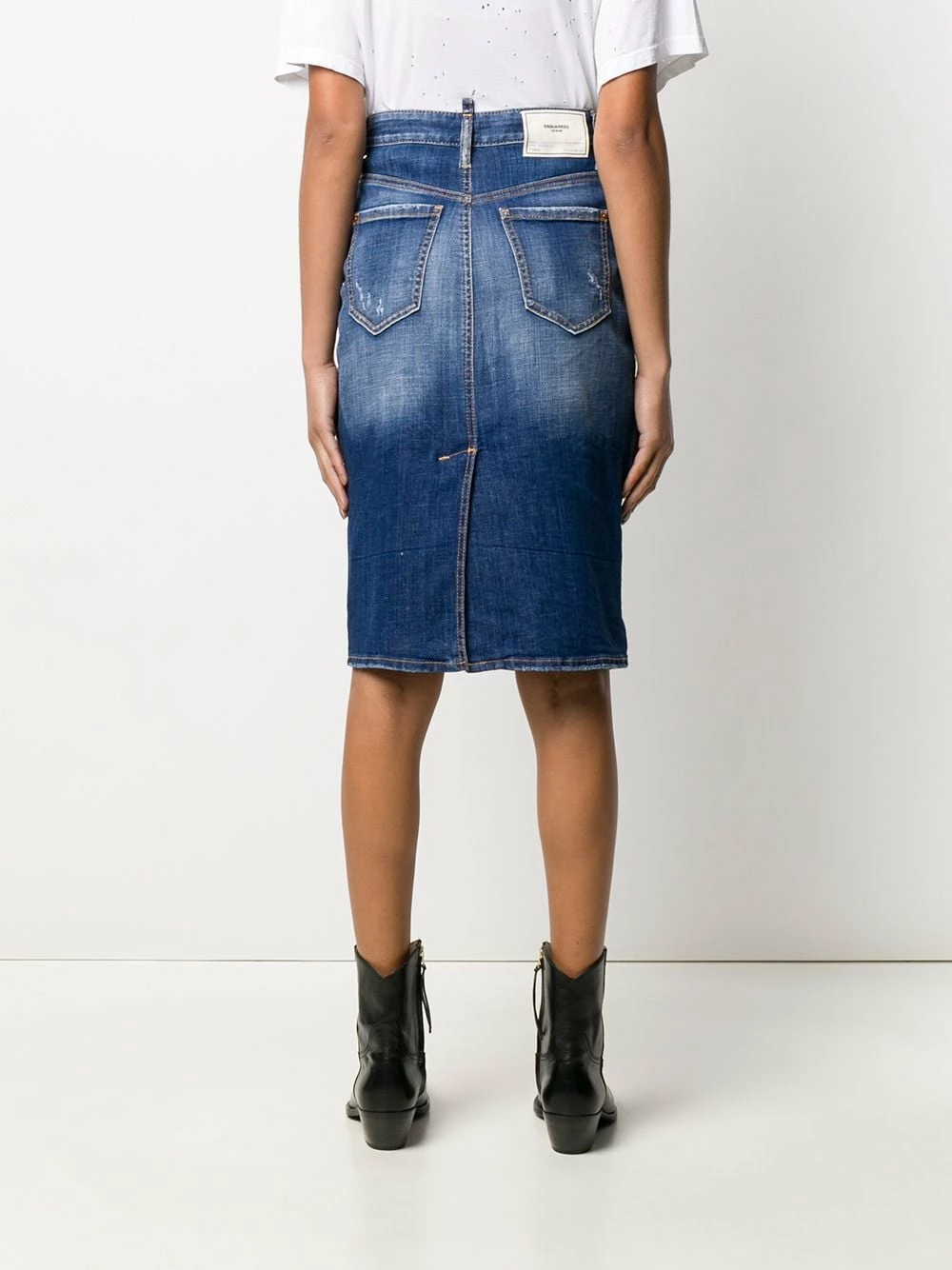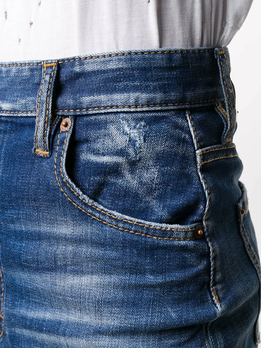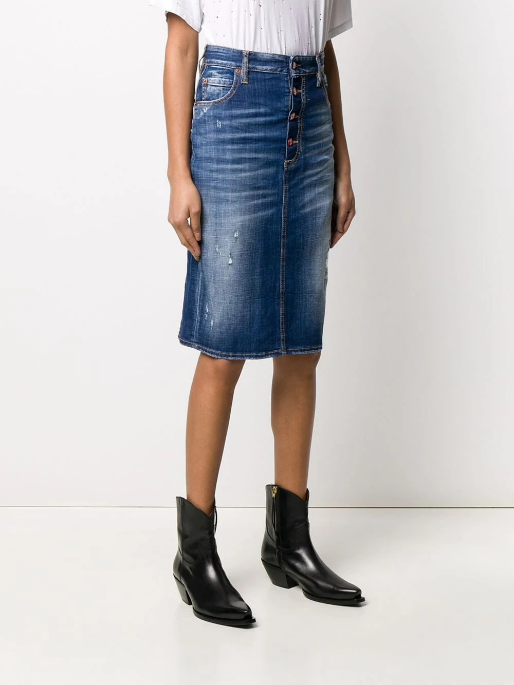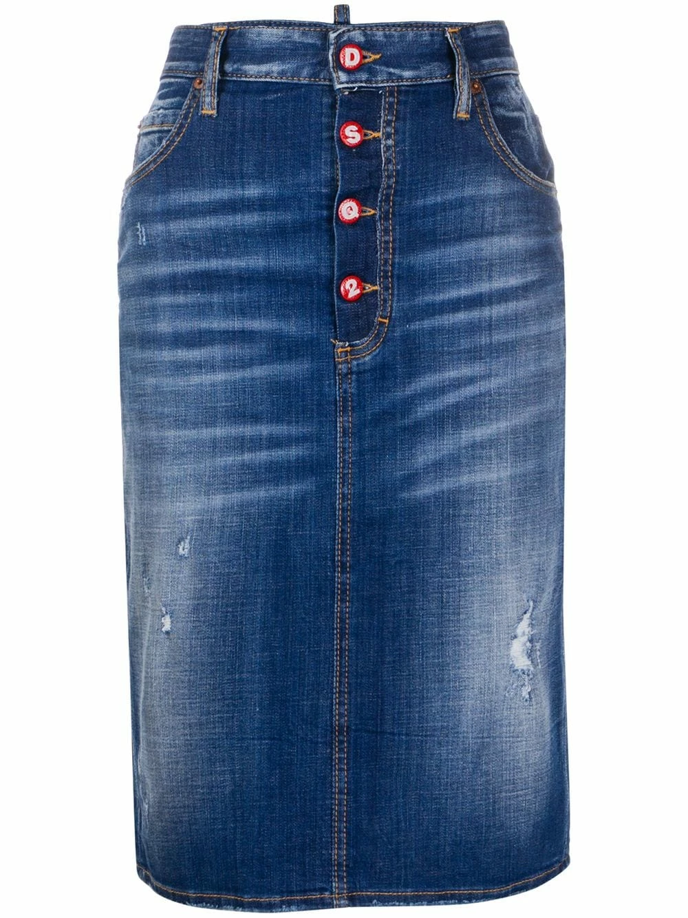Effet usé, boutonnière sur le devant, longueur genou, 5 poches classiques, passants de ceinture. Couleur : bleu.