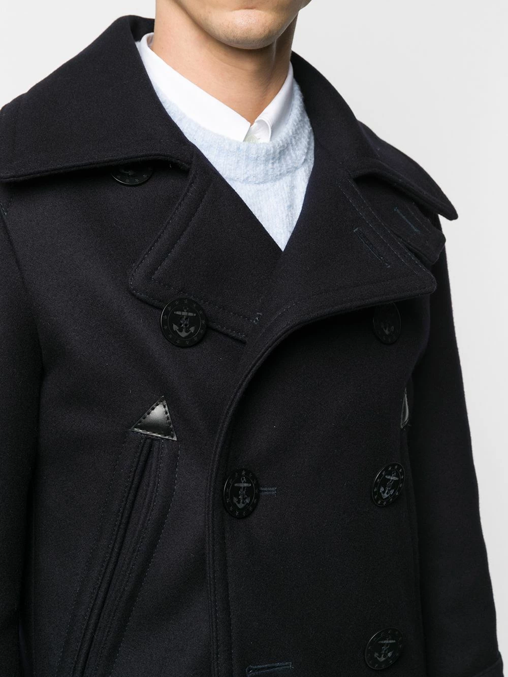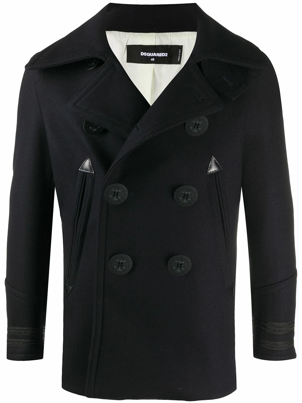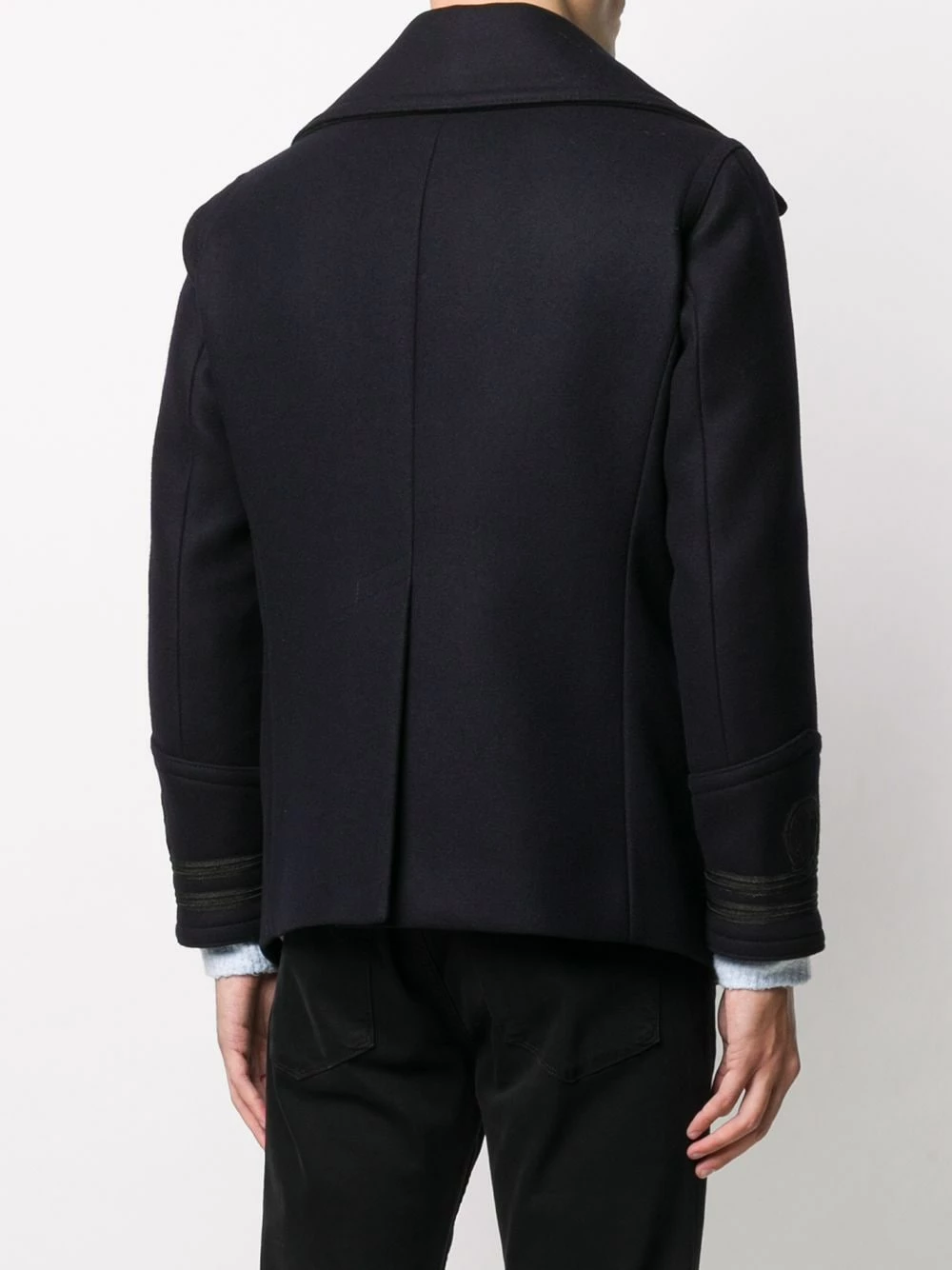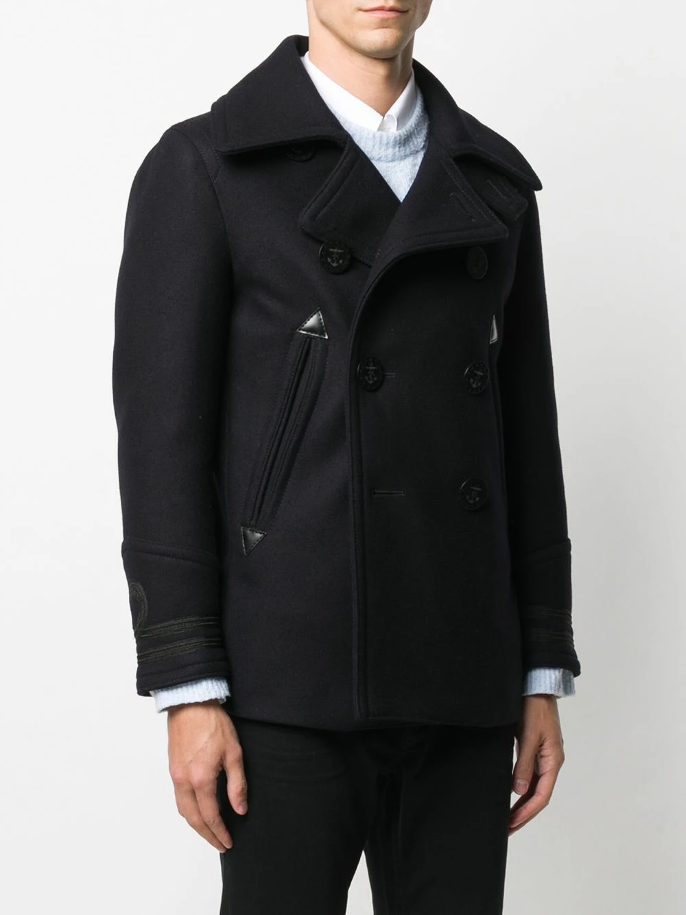 Revers crantés, boutonnière sur le devant, manches longues, deux poches latérales passepoilées. Couleur : noir. Matière : coton.