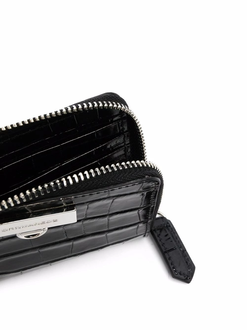 Effet peau de crocodile, fermeture zippée tout autour, plaque logo argentée, détails de chaînes, compartiments intérieurs pour carte. Couleur : noir. Matière : cuir.