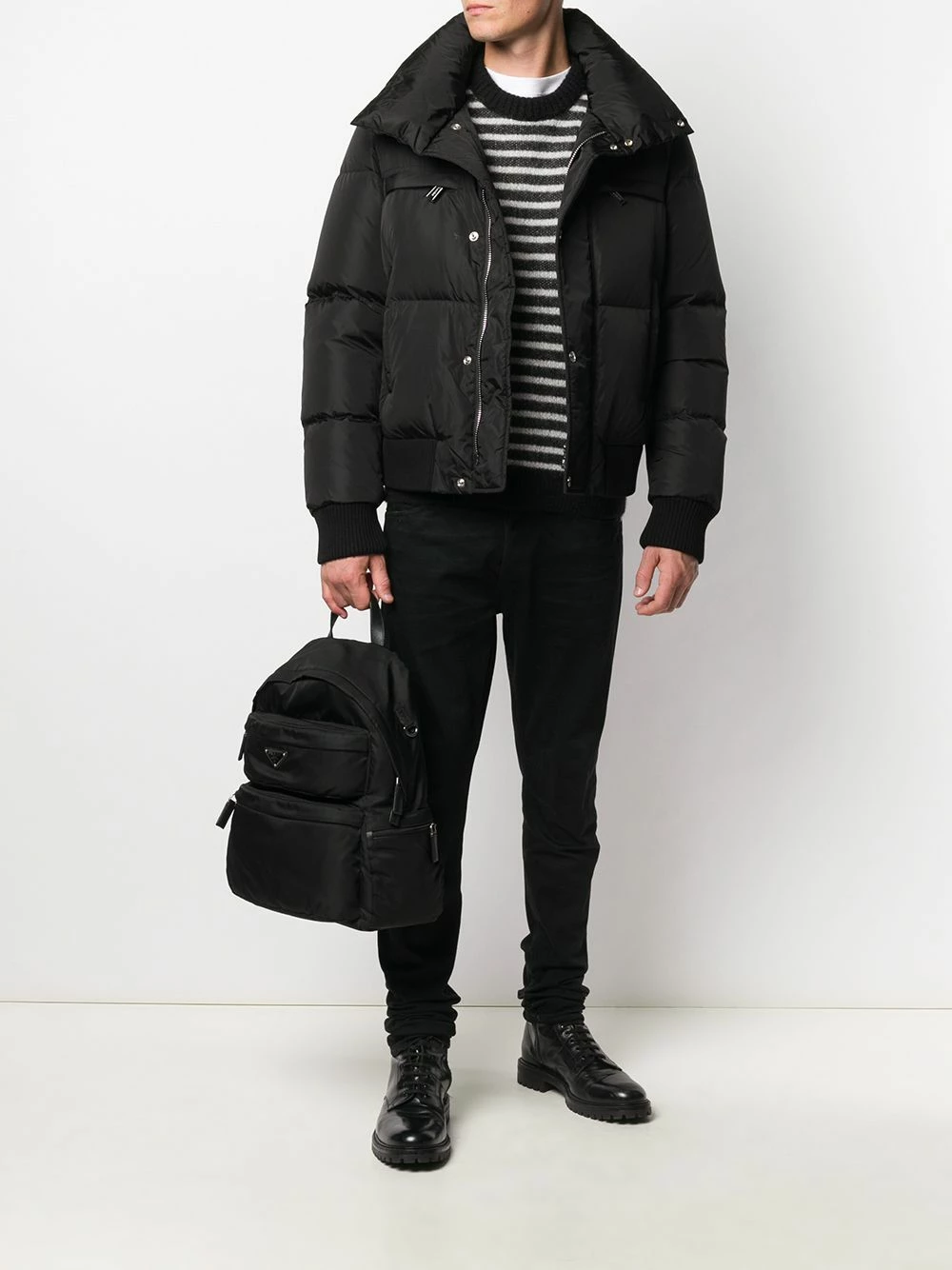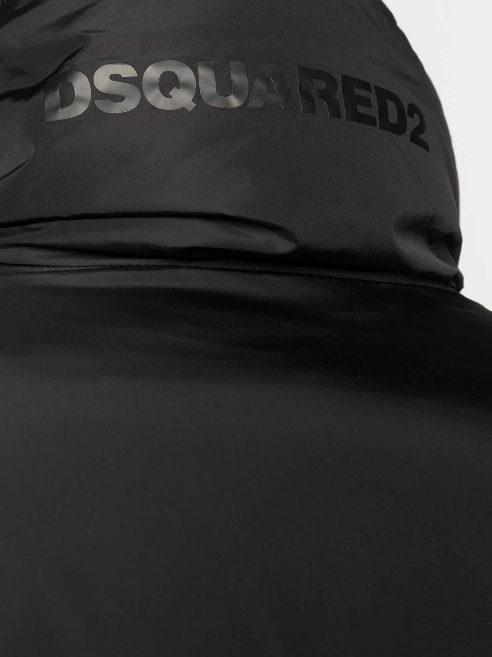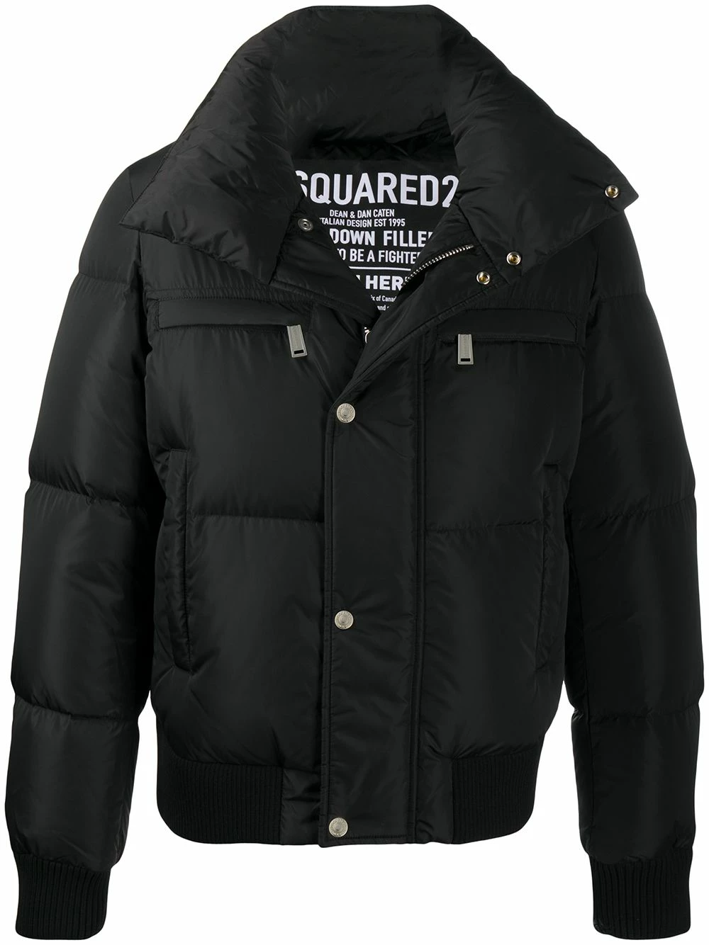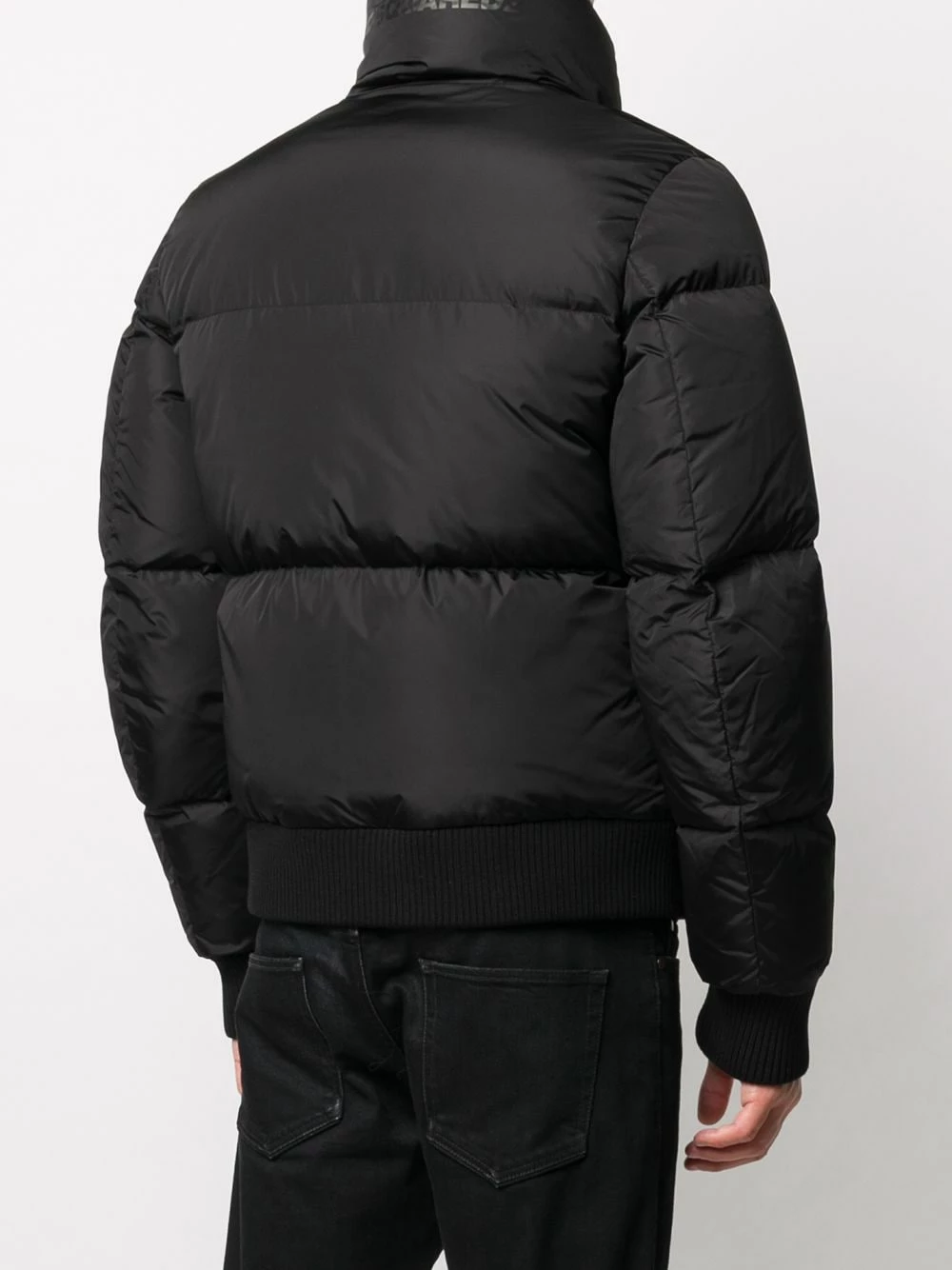 Design ton sur ton, design matelassé, col cheminée, manches longues, logo imprimé à l’arrière, détail nervuré, fermeture à bouton pression, ornements argentés, fermeture zippée devant, deux poches latérales passepoilées, deux poches poitrine zippées. Couleur : noir. Matière : duvet.