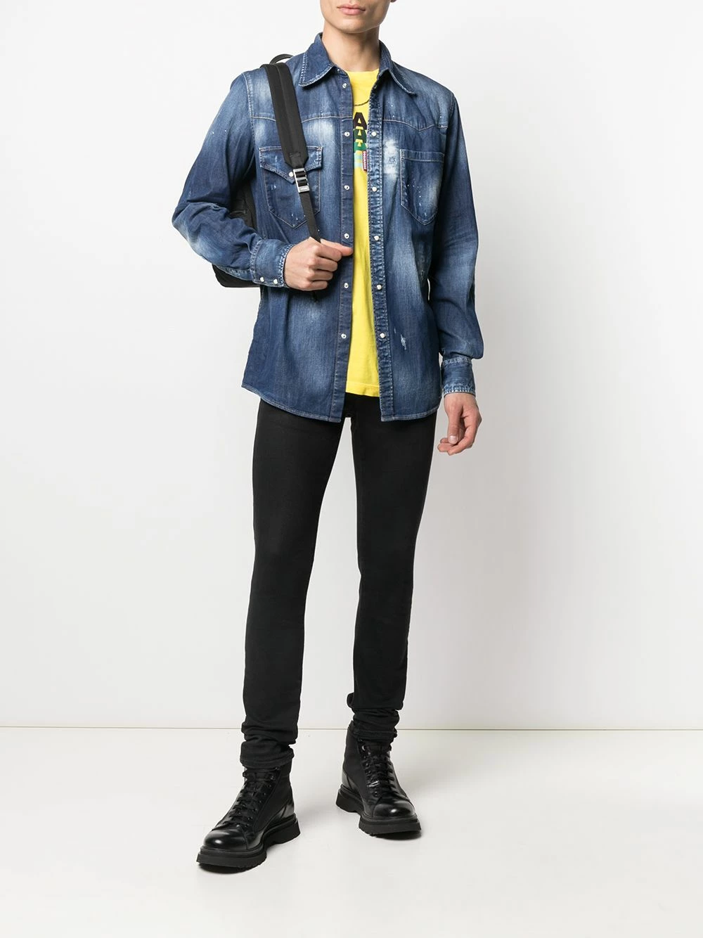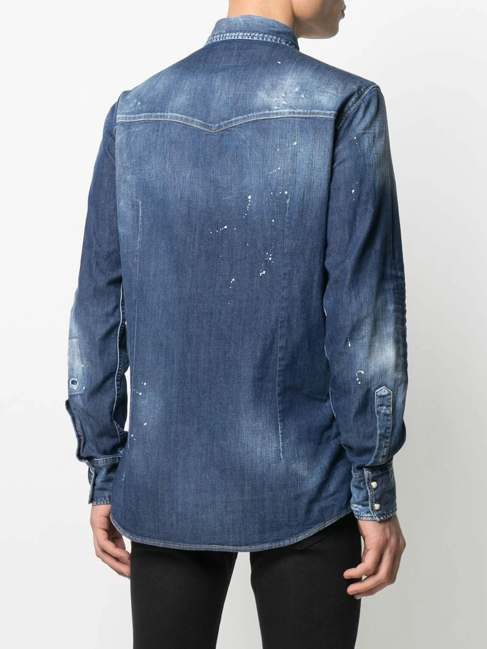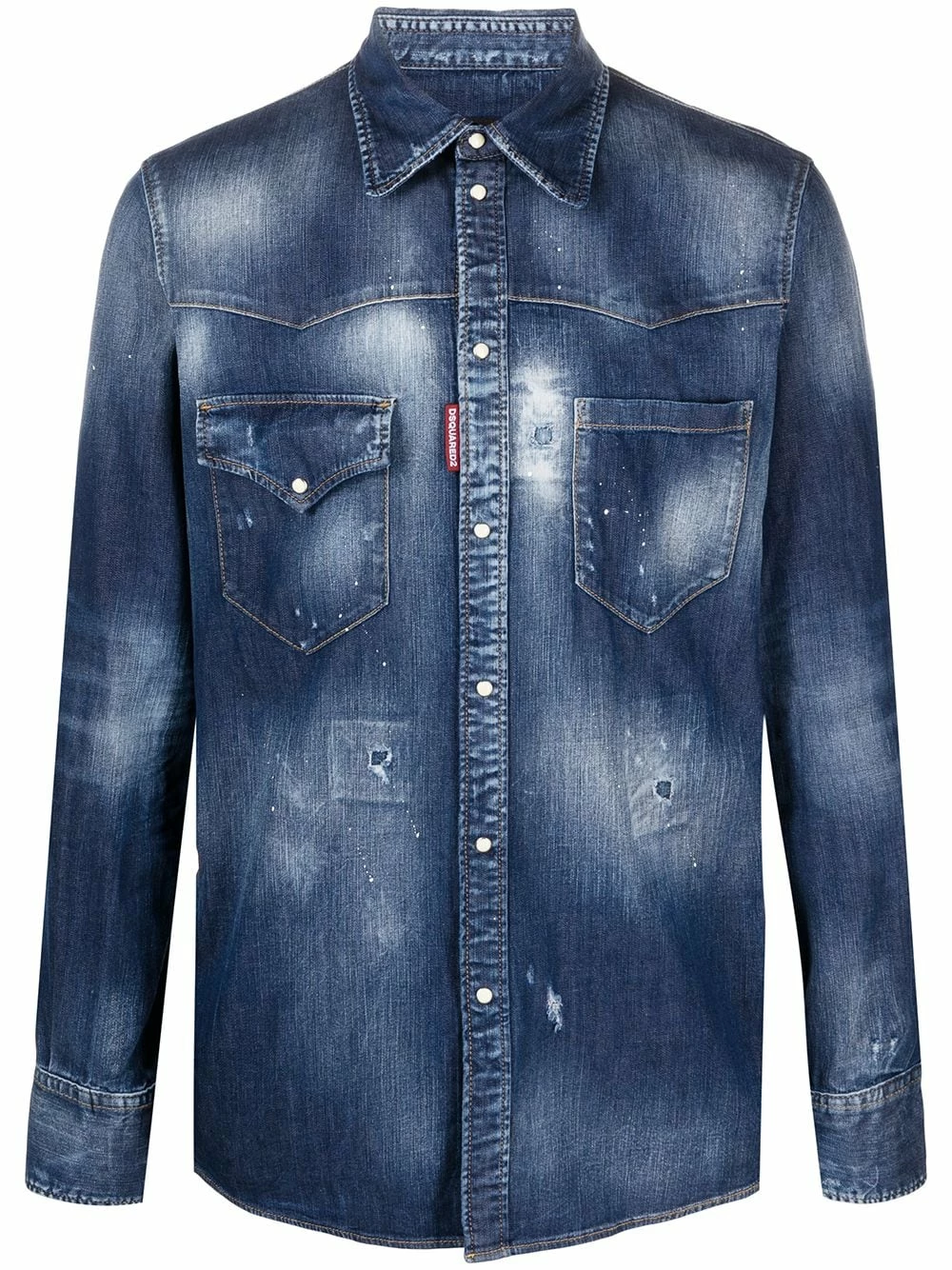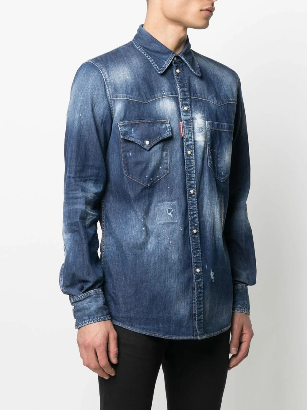 Col classique, boutonnière sur le devant, effet usé, deux poches poitrine à rabat, poignets boutonnés, ourlet incurvé. Couleur : bleu.
