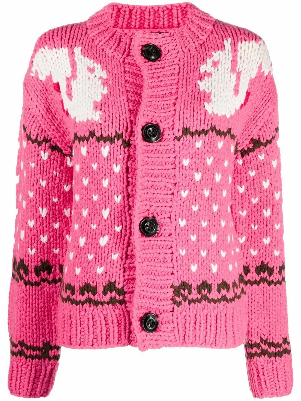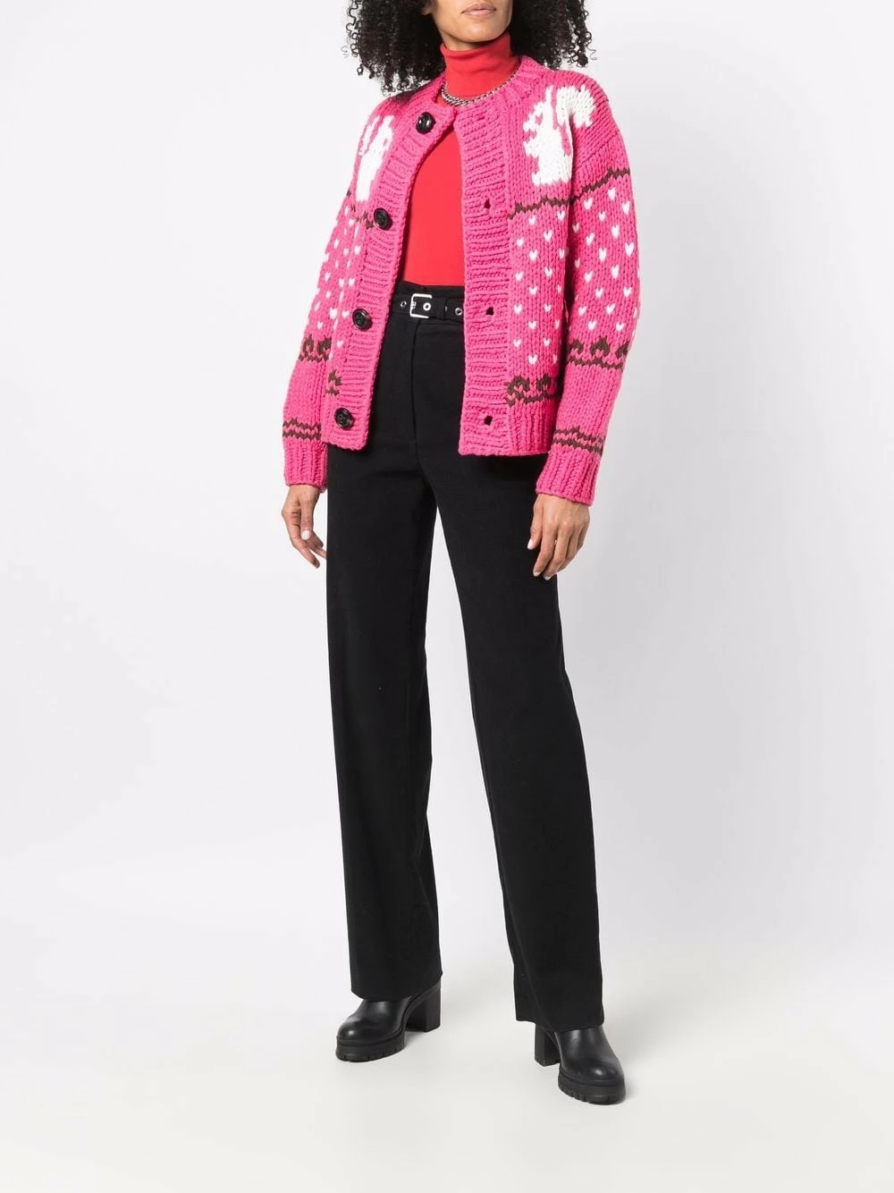Motif intarsia, boutonnière sur le devant, col montant nervuré, ourlet nervuré, poignets nervurés. Couleur : rose.