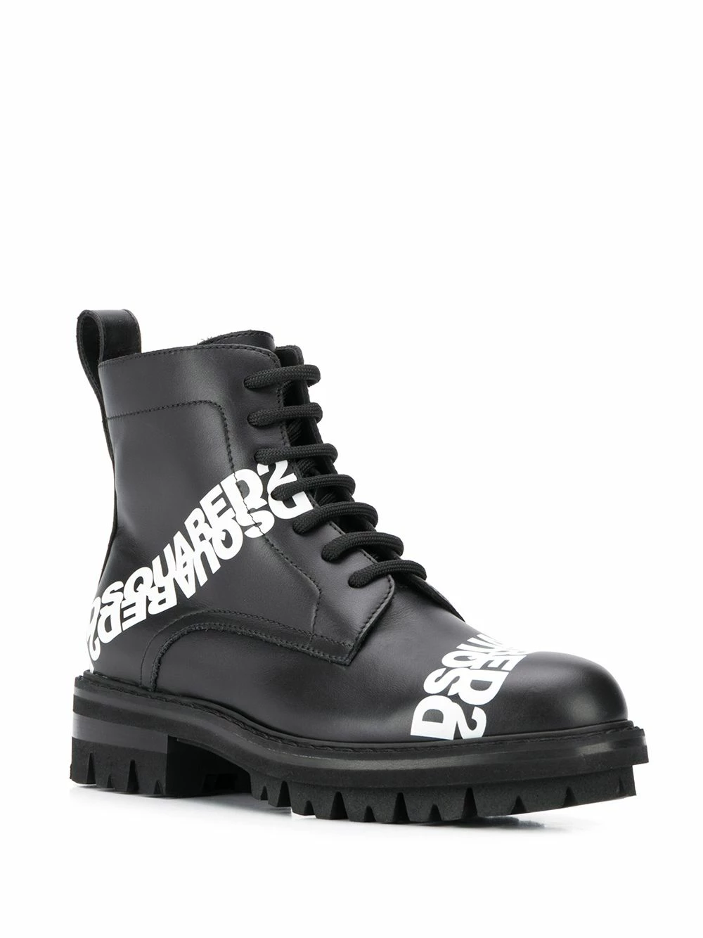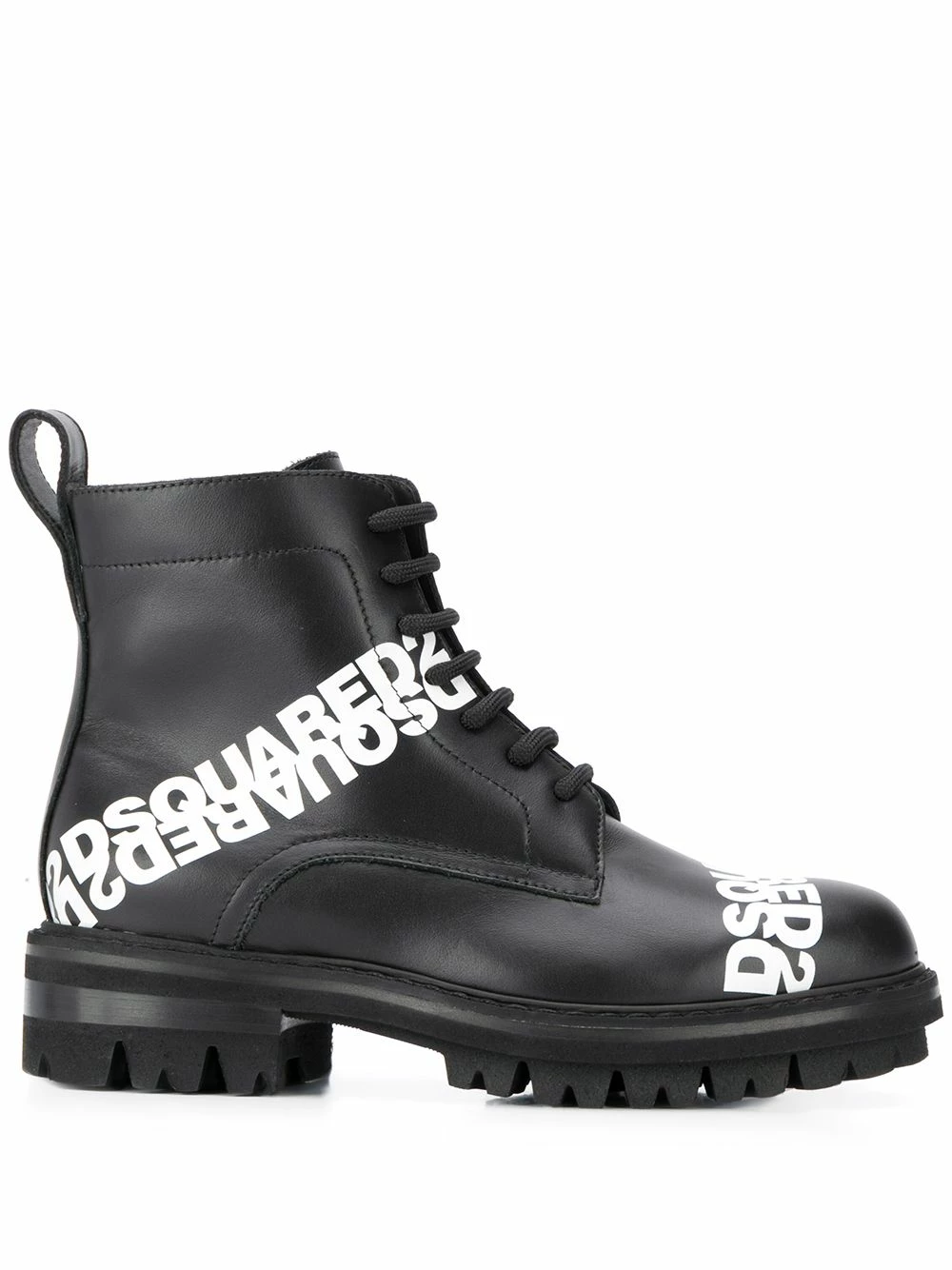 Bottes lacées à logo en cuir de veau Dsquared2 avec logo imprimé, bout rond, fermeture à lacer sur le devant, languette arrière et semelle crantée en caoutchouc.