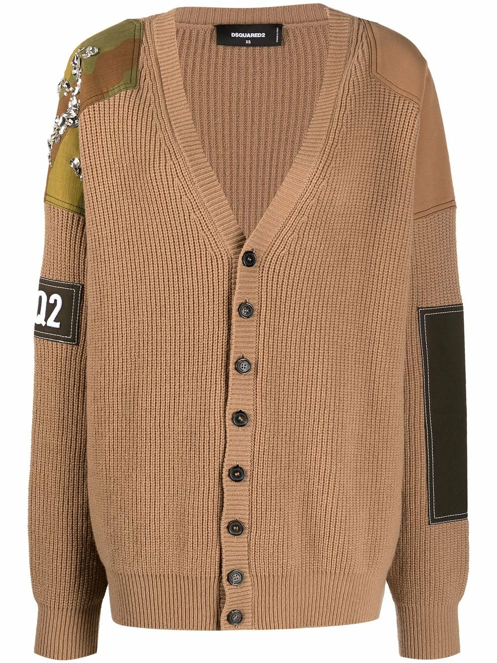 Design patchwork, ornement en cristal, col v, boutonnière sur le devant, manches longues, ourlet droit, bordures nervurées. Couleur : Marron.