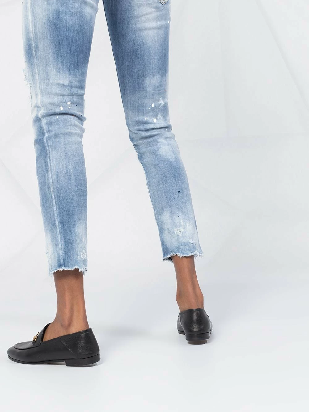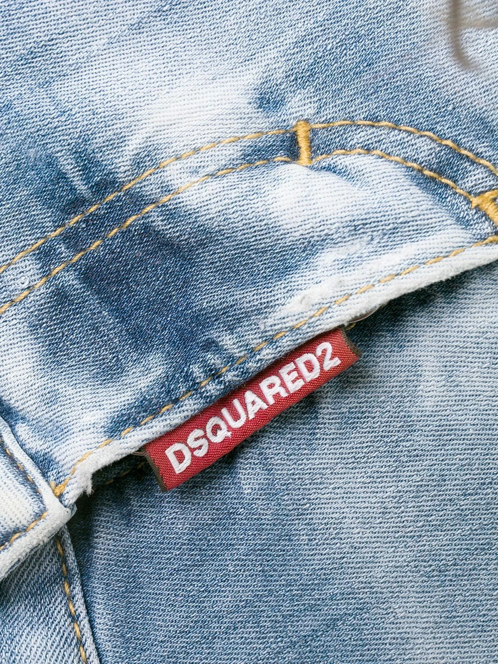 Jean crop à effet usé Dsquared2 avec passants de ceinture, bouton et zip, coupe classique cinq poches, effet taches de peinture, effet usé, coupe slim et longueur crop. Couleur : bleu.