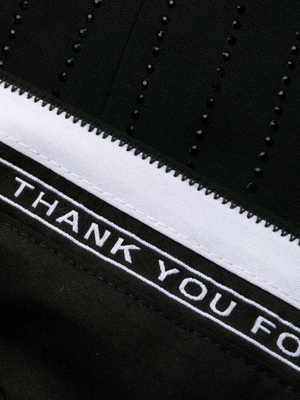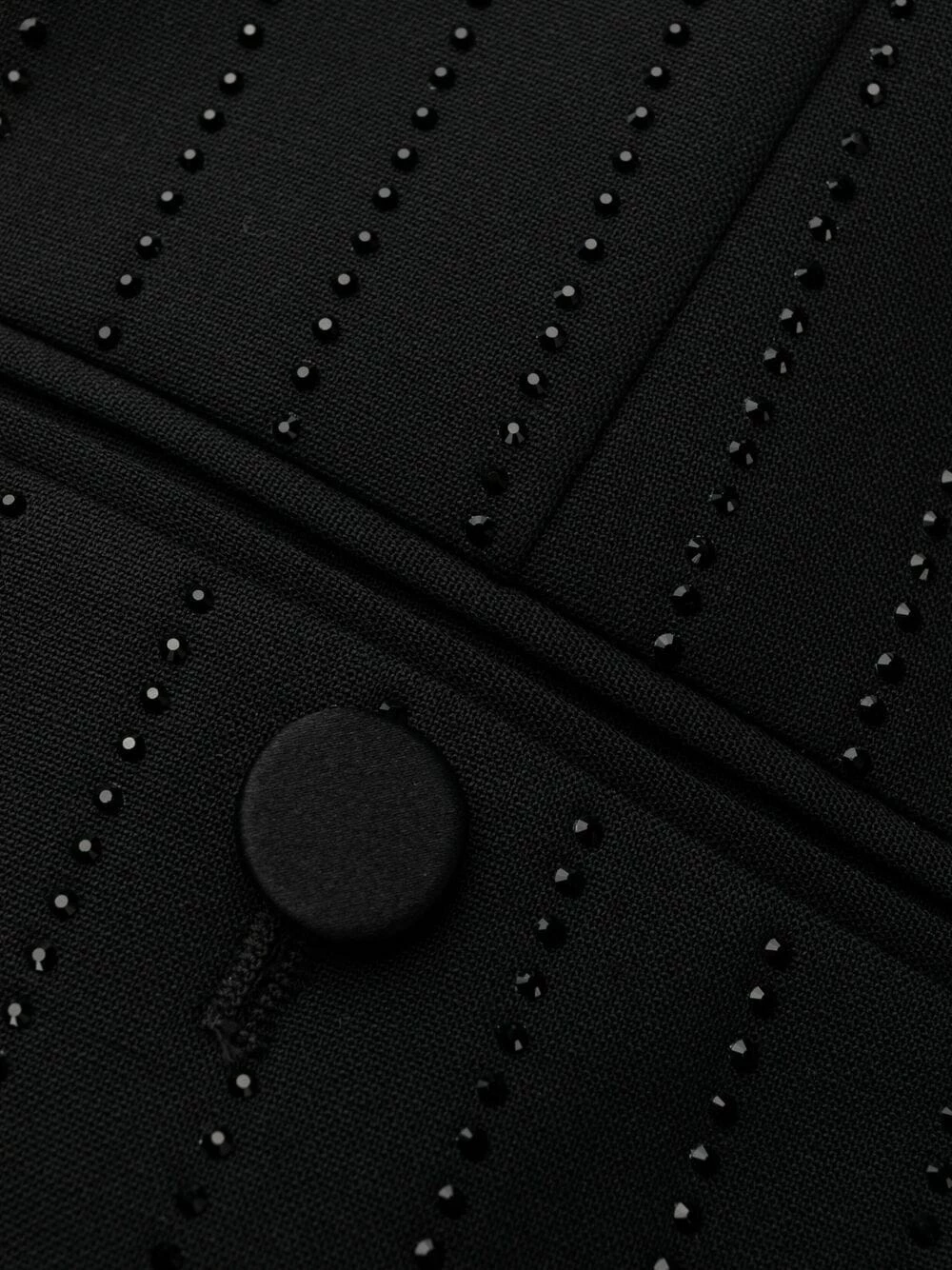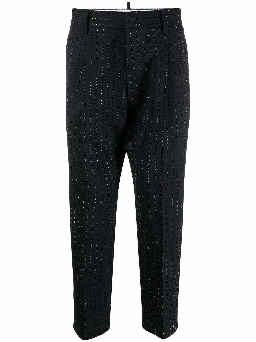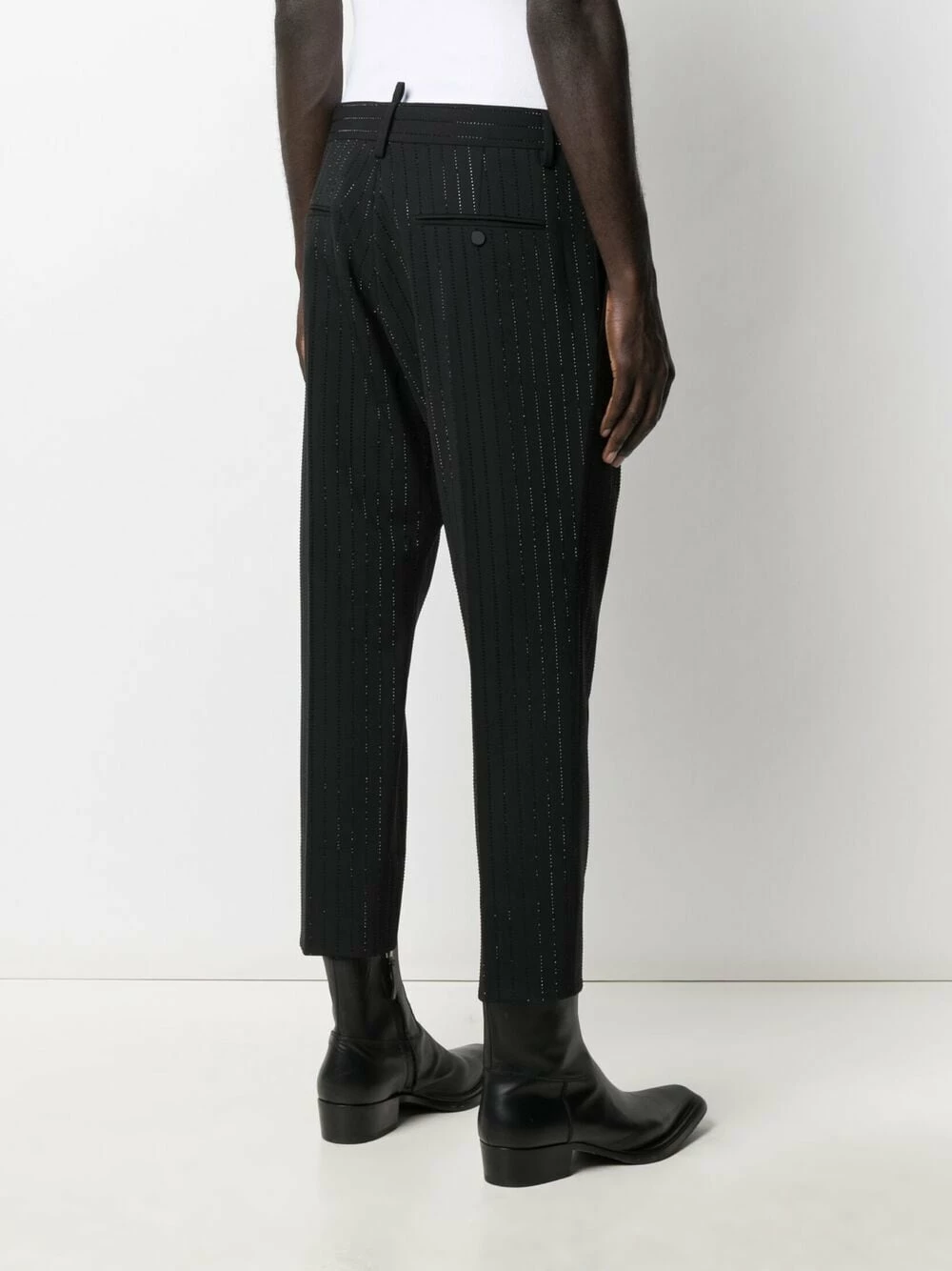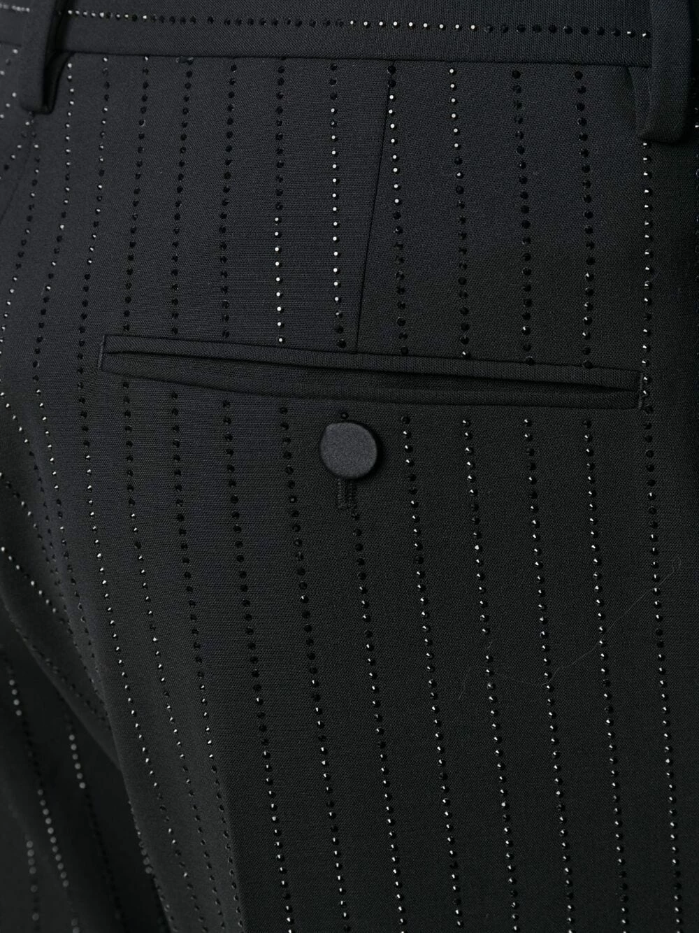 Ornement en cristal, rayures verticales, détails de plis, longueur crop, passants de ceinture, fermeture à zip et agrafes, deux poches latérales fendues, deux poches passepoilées boutonnées à l’arrière. Couleur : noir.