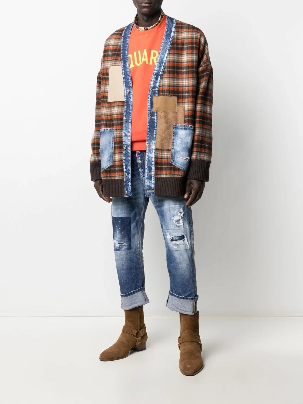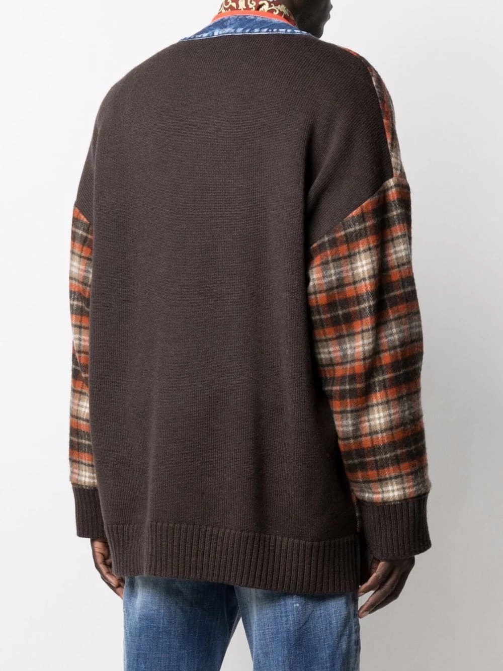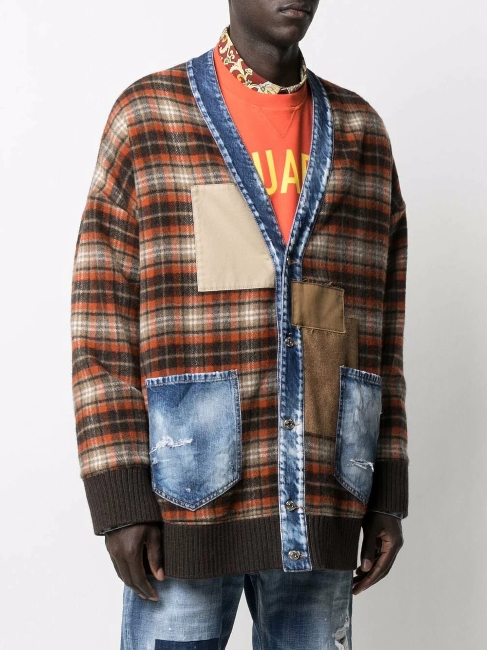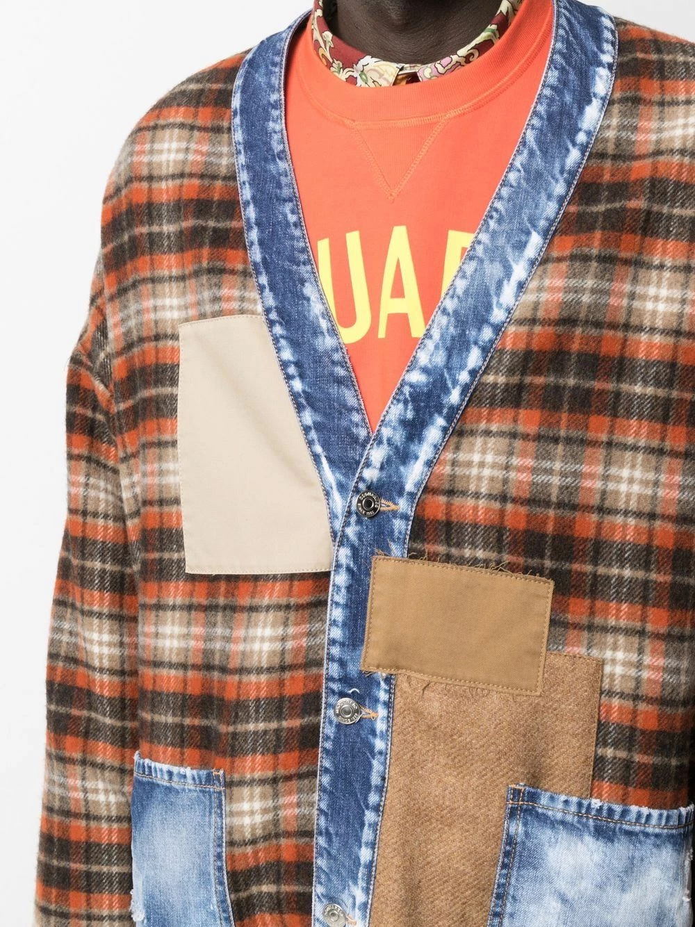 Design patchwork, carreaux, finitions en denim, col v, boutonnière sur le devant, manches longues. Couleur : multicolore.