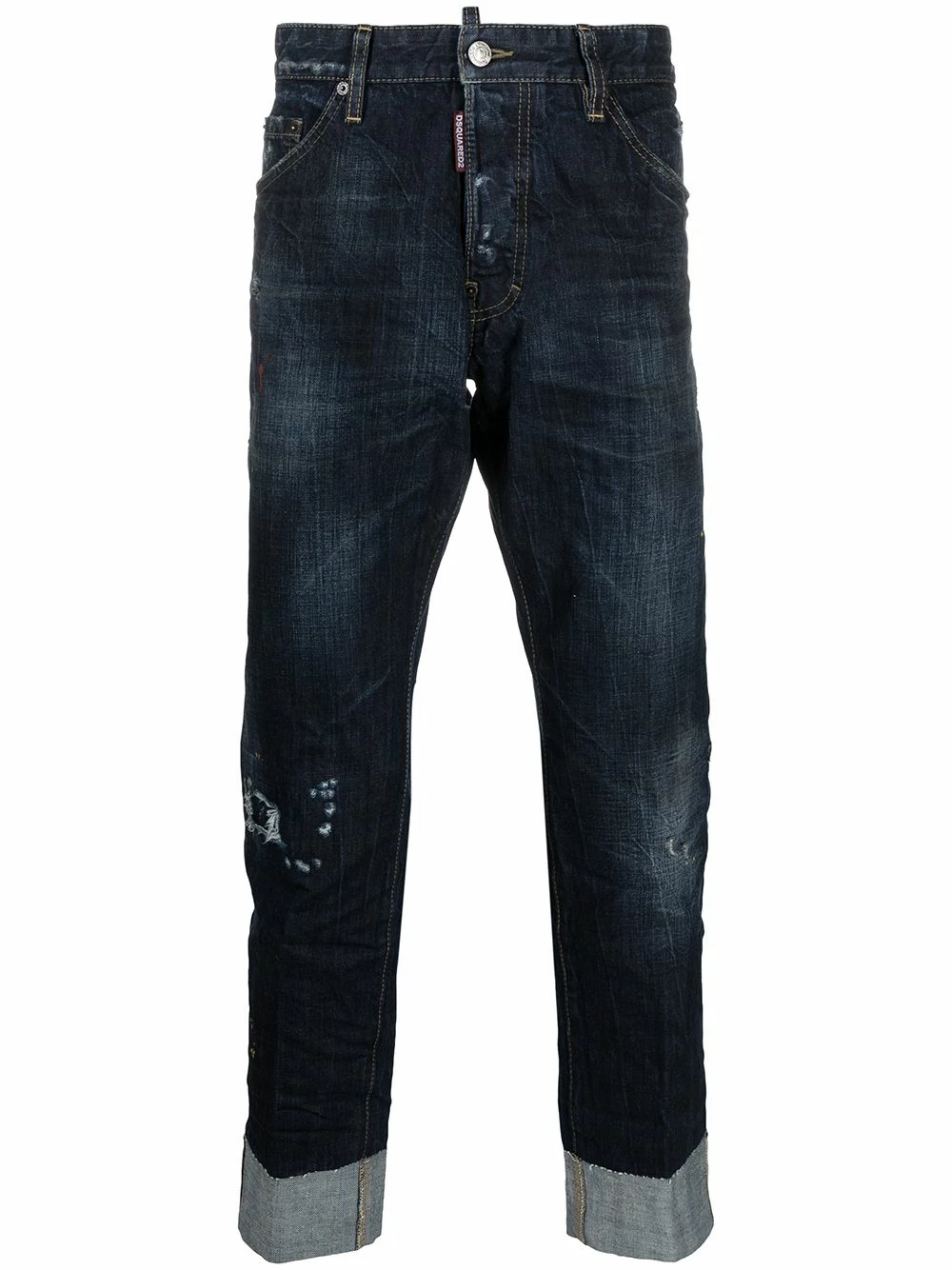 Taille mi-haute, passants de ceinture, coutures contrastantes, fermeture boutonnée, 5 poches classiques, effet taches de peinture, effet usé, patch logo sur l’arrière, coupe droite. Couleur : bleu. Matière : coton.