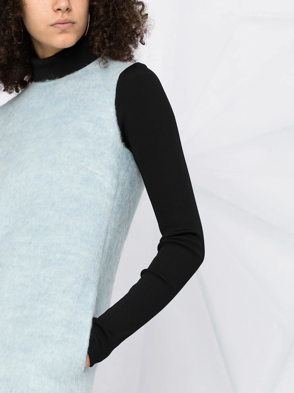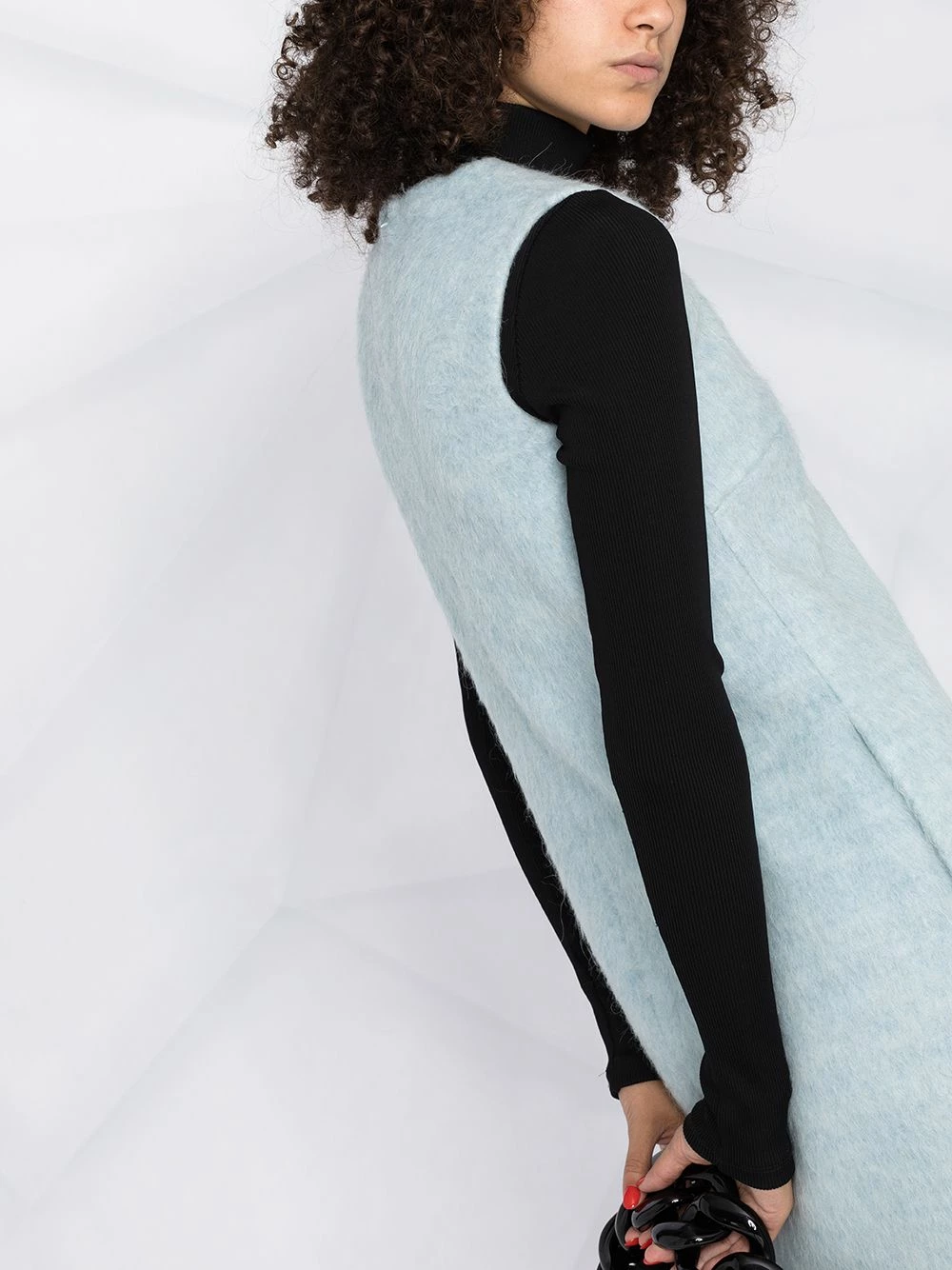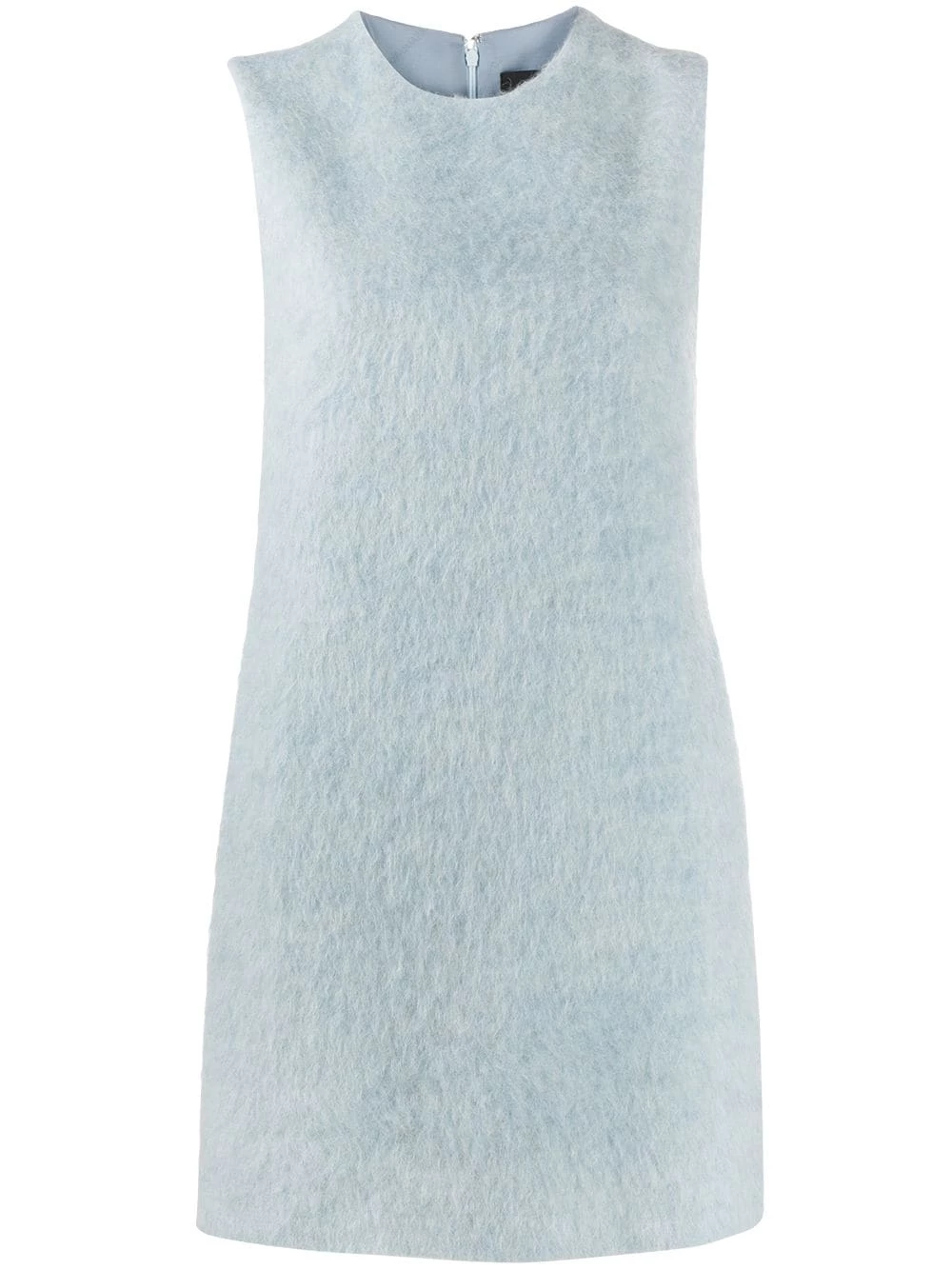 Encolure ronde, design sans manches, fermeture zippée à l’arrière, coupe évasée, deux poches latérales passepoilées, coupe courte. Couleur : bleu.