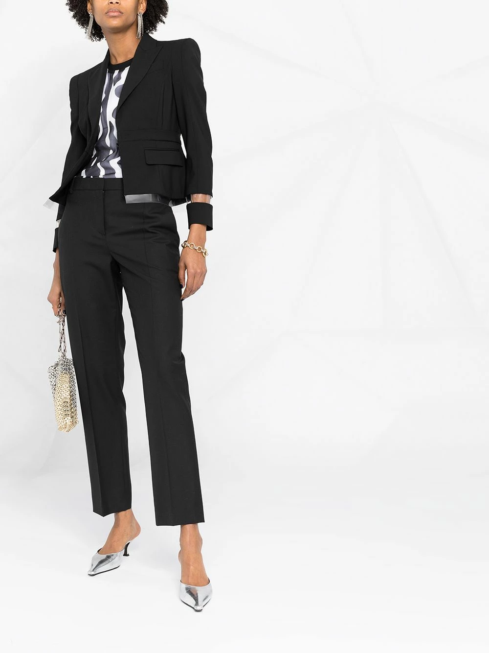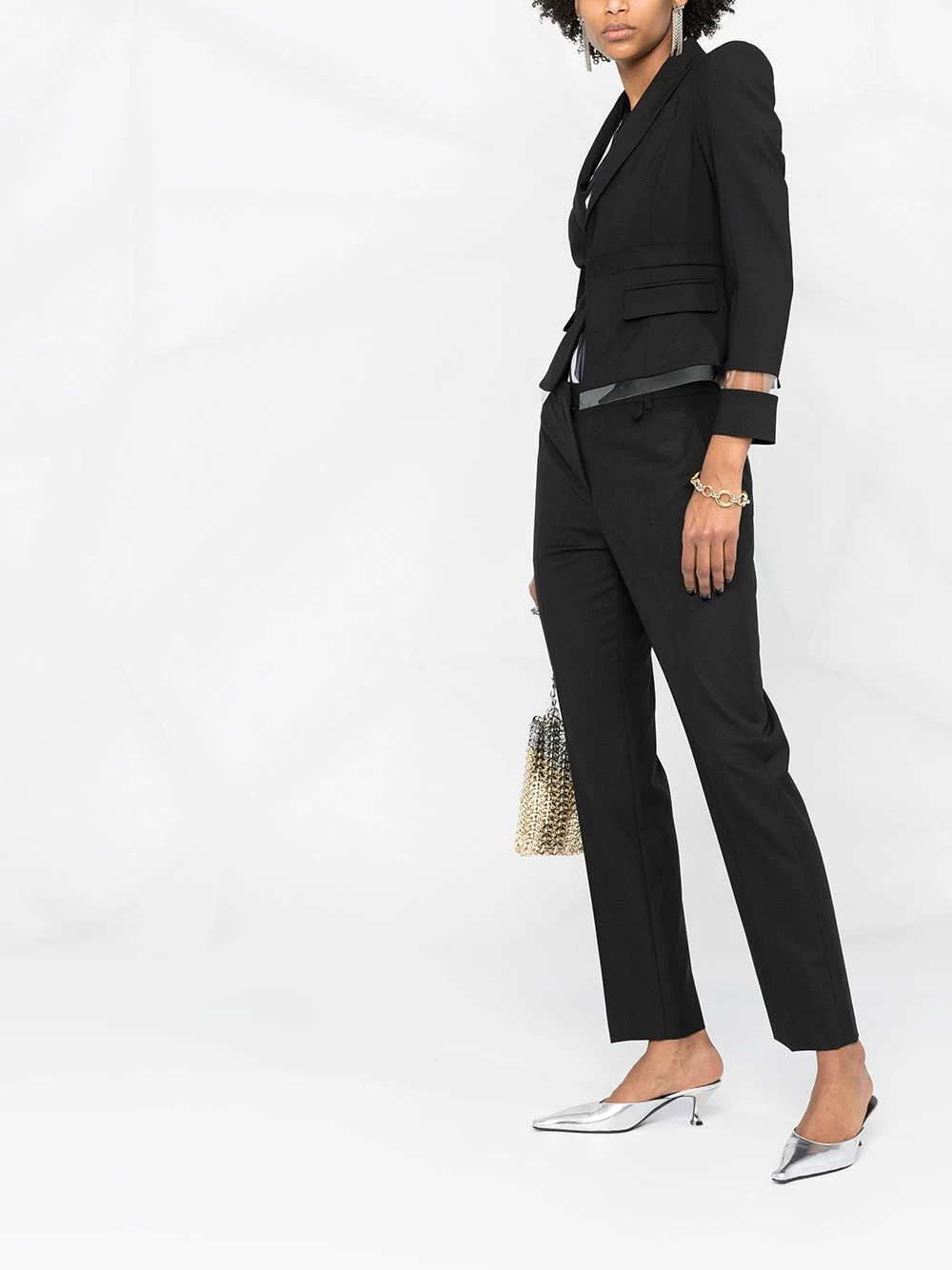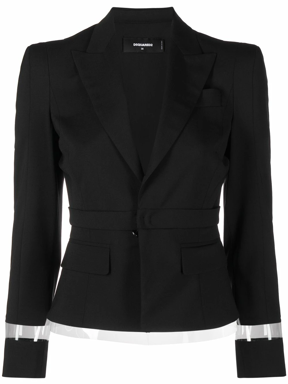 Empiècement transparent, coupe courte, revers pointus, boutonnière sur le devant, manches longues, poche passepoilée sur la poitrine, deux poches latérales à rabat. Couleur : Noir.