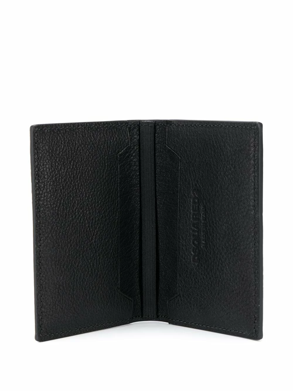 Porte-cartes pliant Icon en cuir de veau Dsquared2 avec logo imprimé au centre, texture en cuir grainé, compartiments porte-cartes et logo embossé sur le côté. Couleur : noir.