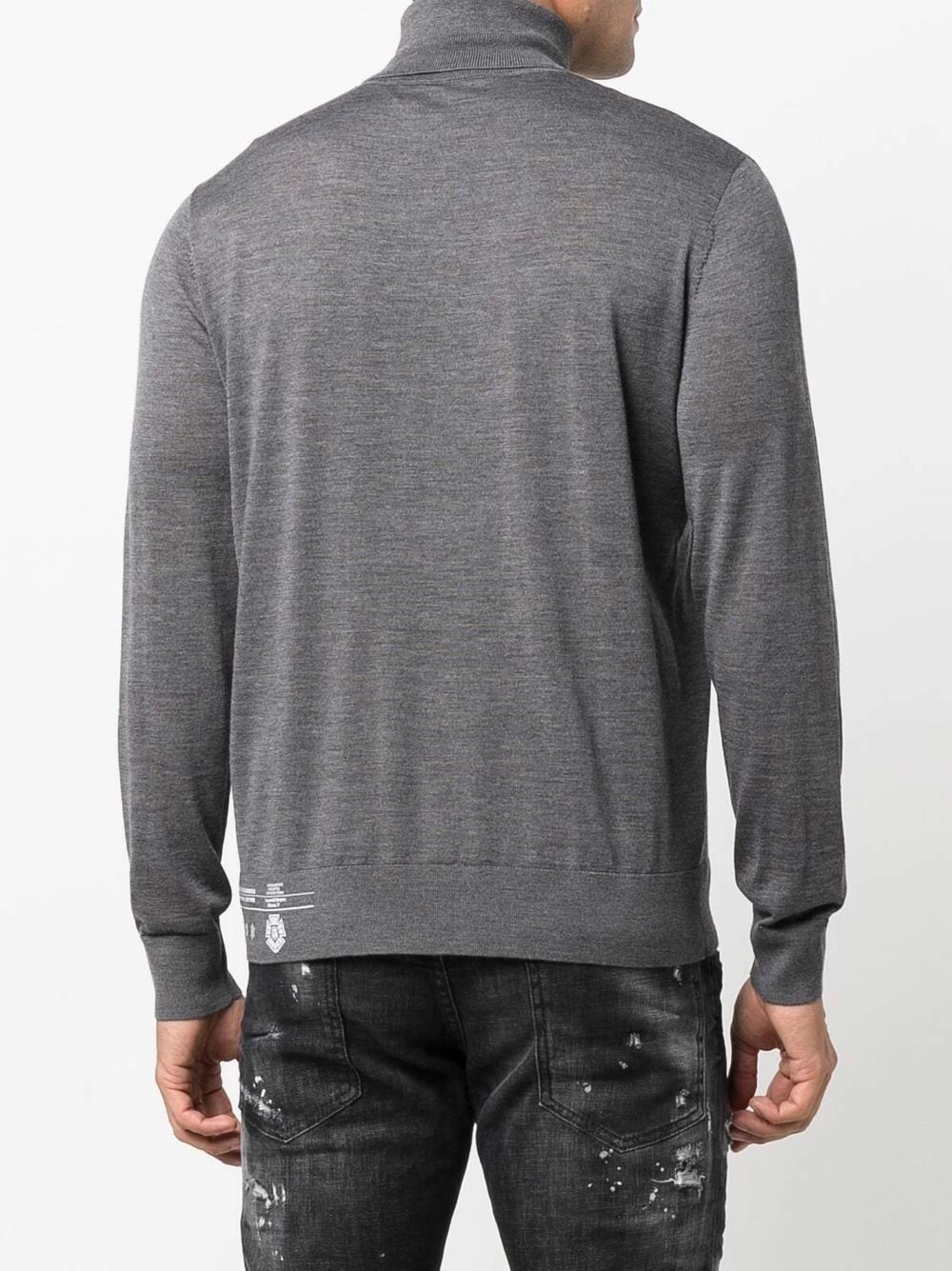 Maille fine, logo imprimé sur le devant, manches longues, manches à poignets resserrés, col roulé, ourlet droit. Matière : laine.