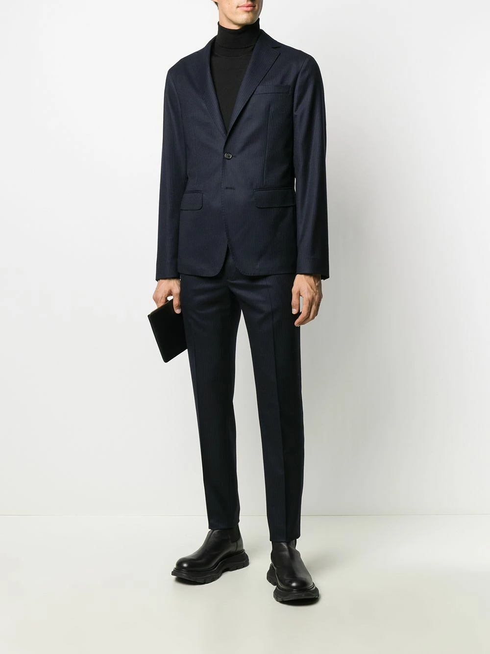 Costume classique en laine vierge DSQUARED2 avec col à revers crantés, boutonnière sur le devant, manches longues, poignets boutonnés, poches devant, passants de ceinture, coupe fuselée et fines rayures.