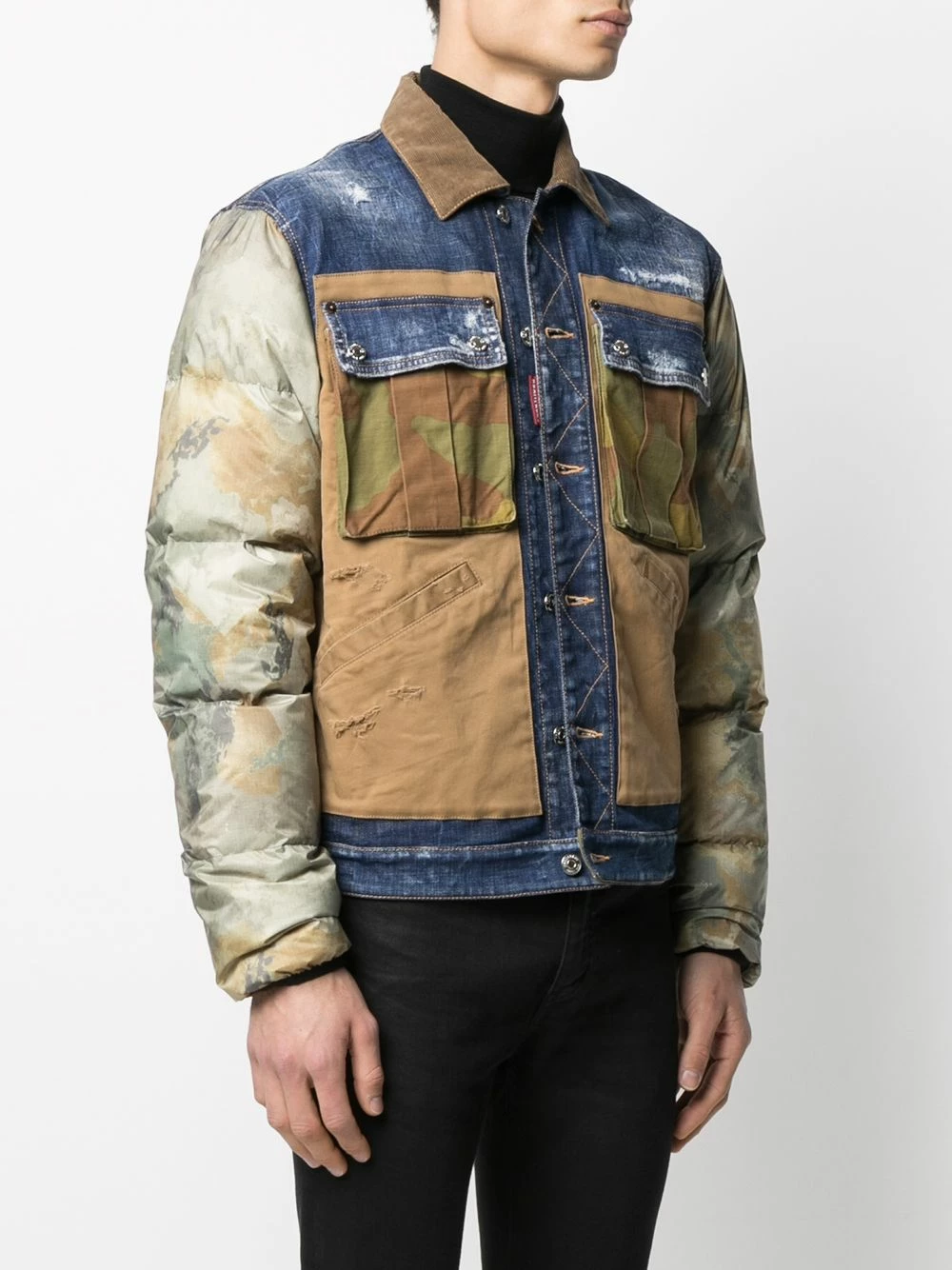 Design patchwork, design matelassé, imprimé camouflage, col classique, patch logo sur le devant, boutonnière sur le devant, deux poches latérales passepoilées, deux poches poitrines boutonnées. Matière : coton.