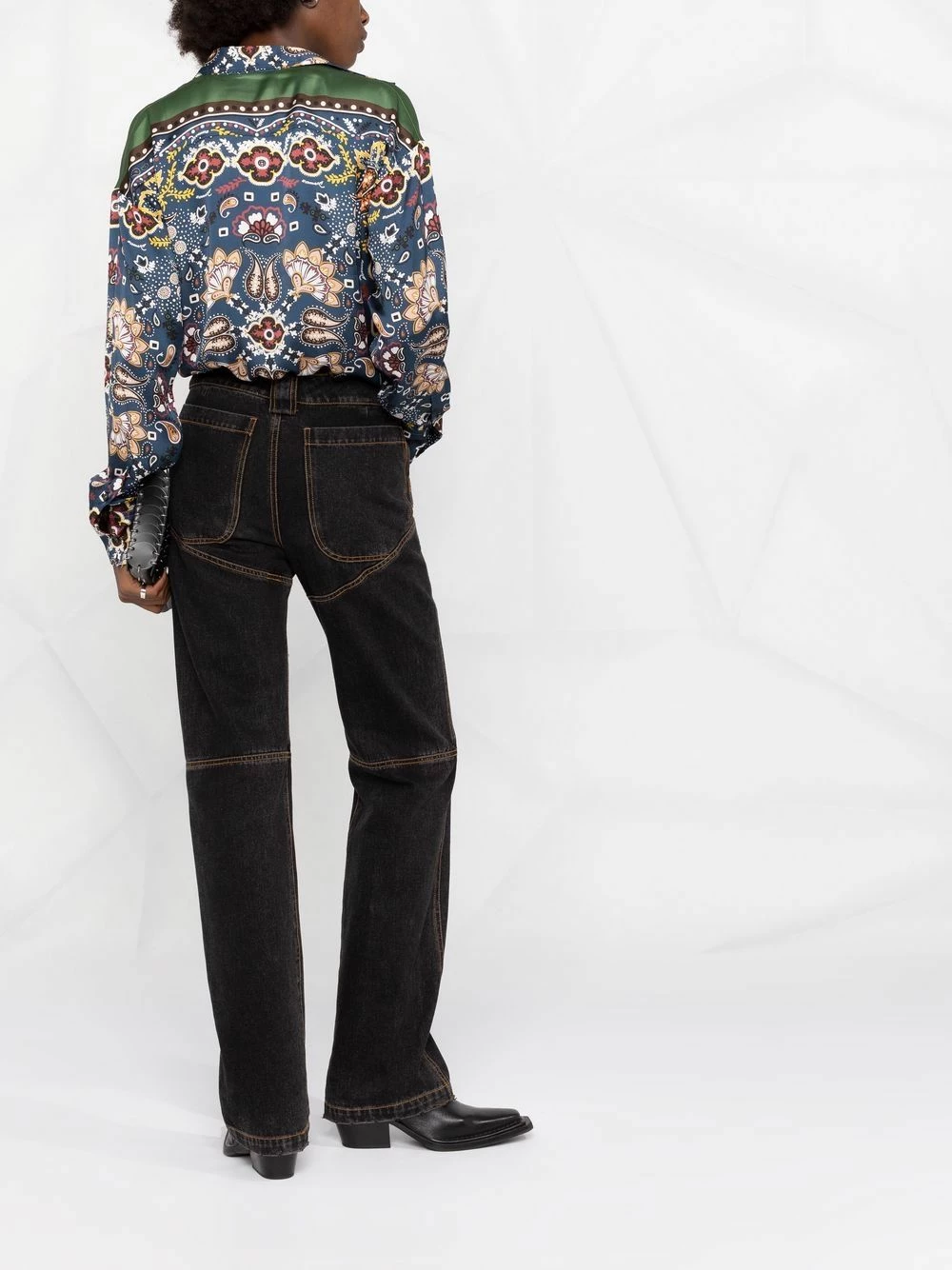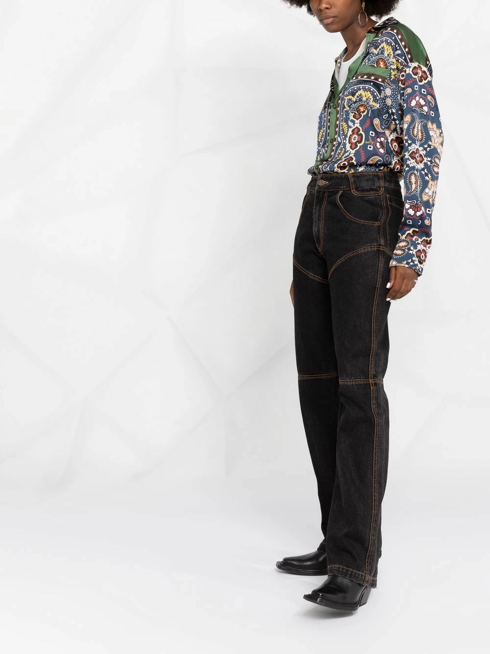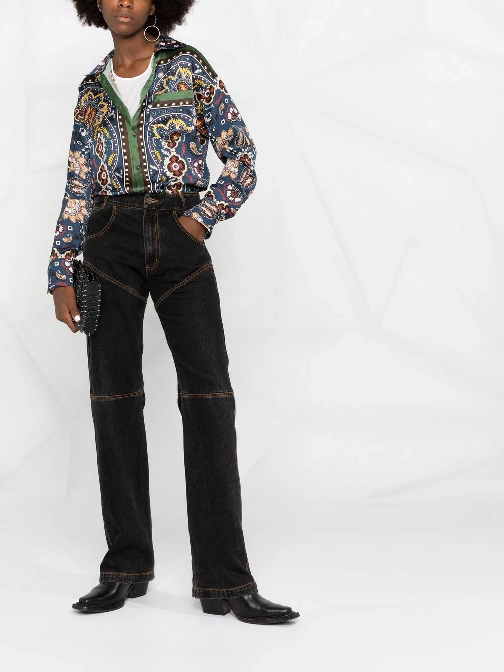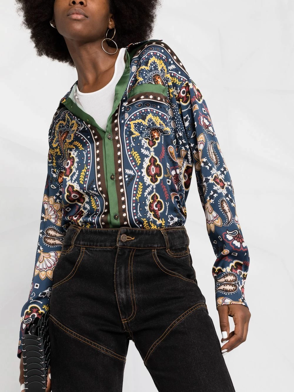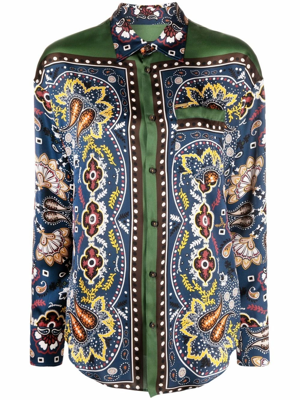 Imprimé graphique intégral, col classique, boutonnière sur le devant, manches longues, ourlet droit.