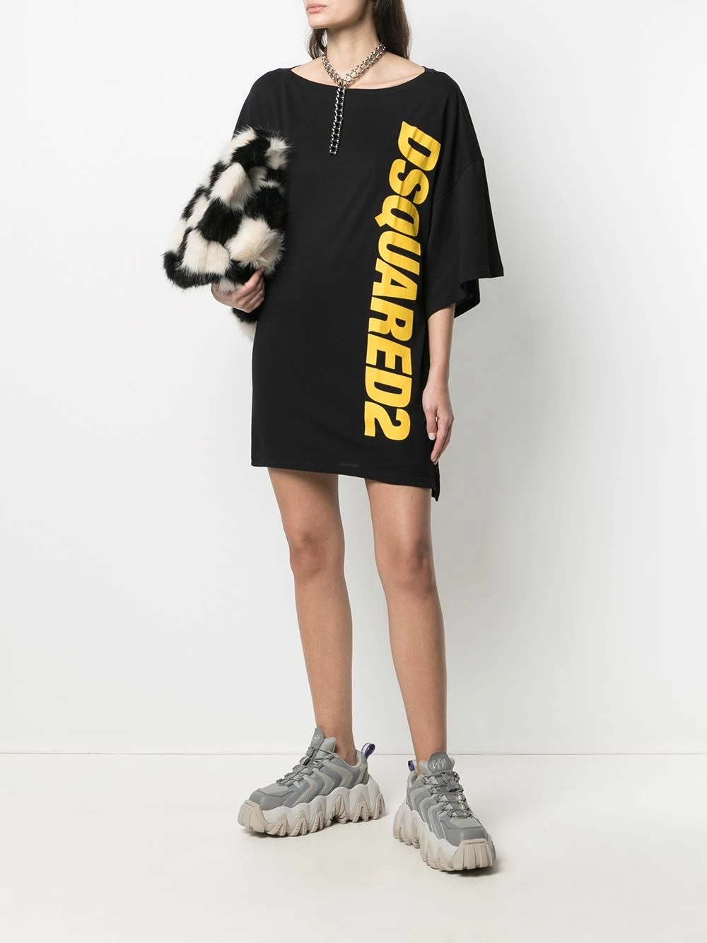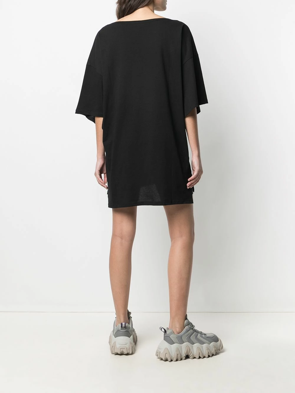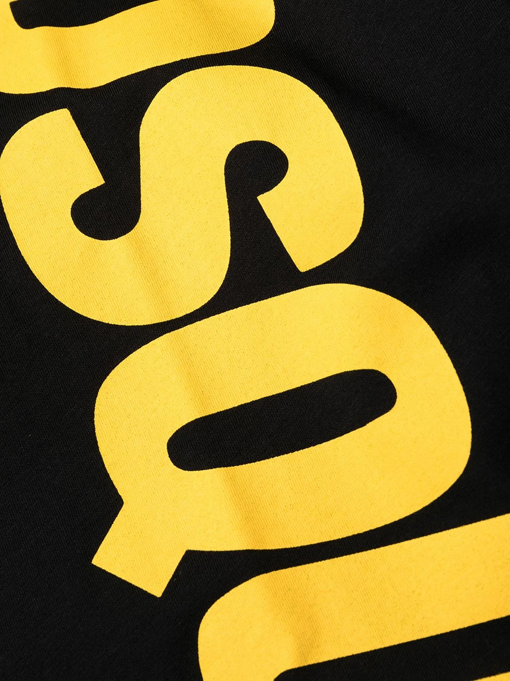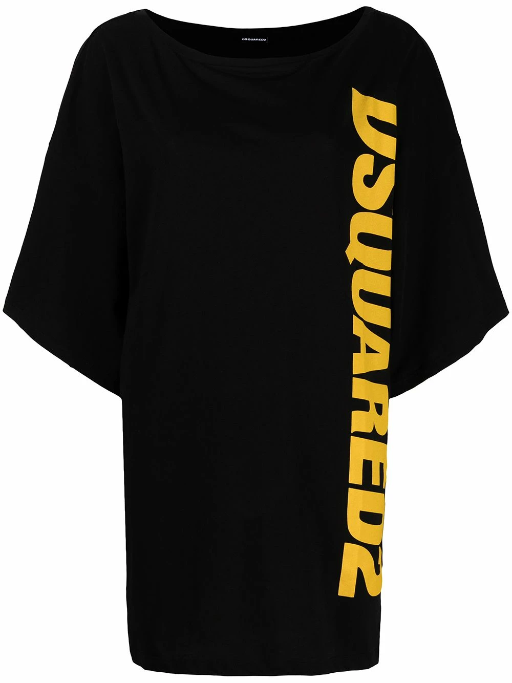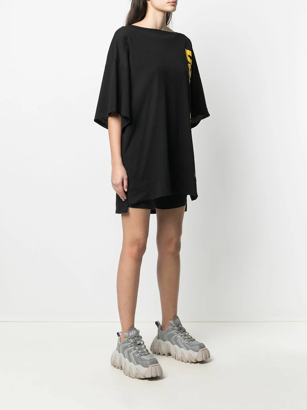 Encolure large, effet d’épaules descendues, manches courtes, coutures ton sur ton, logo imprimé sur le côté, fentes latérales, ourlet plus long au dos. Matière : coton.