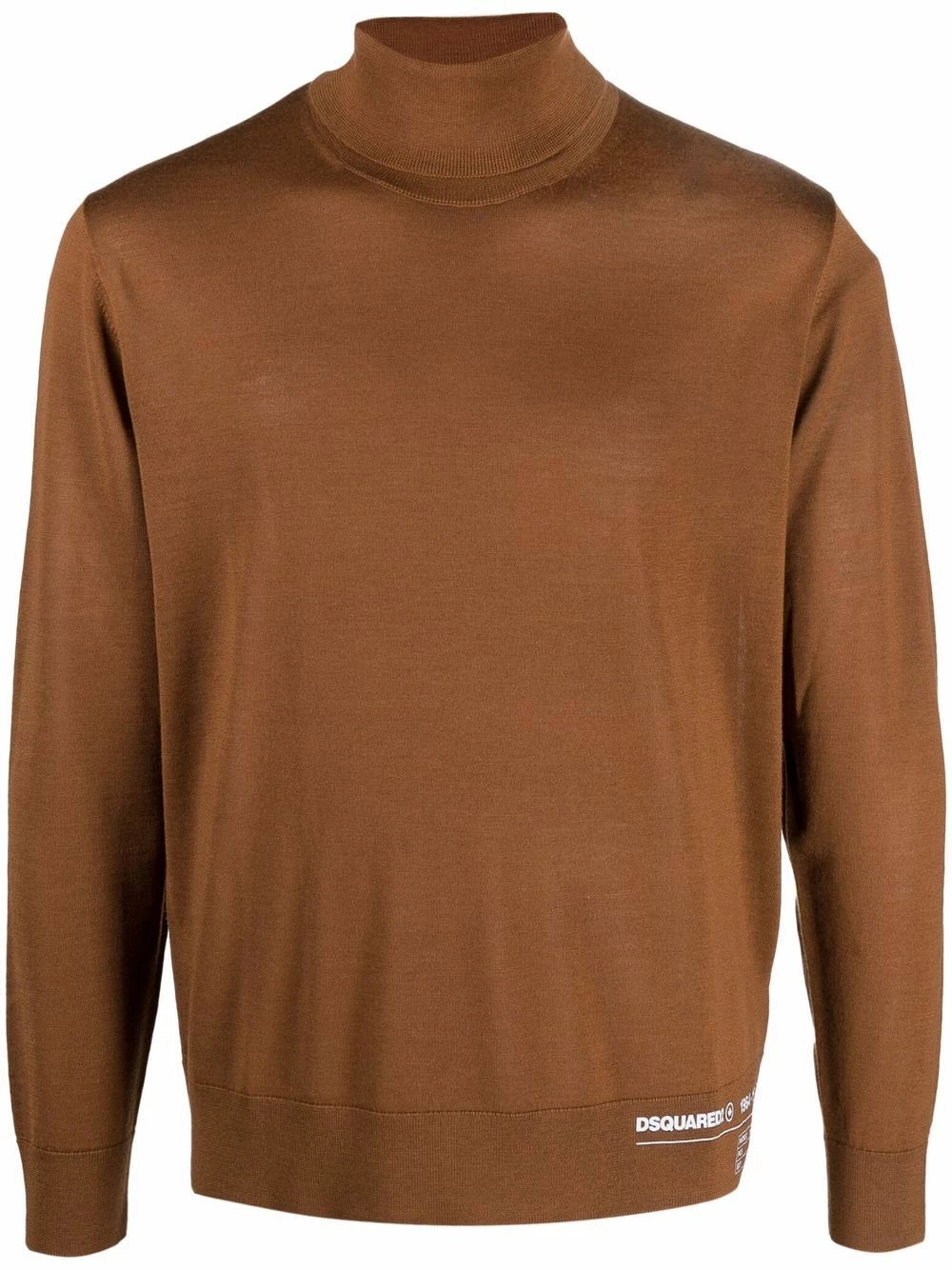 Maille nervurée, logo imprimé sur le côté, col roulé, manches longues. Couleur : marron. Matière : laine.