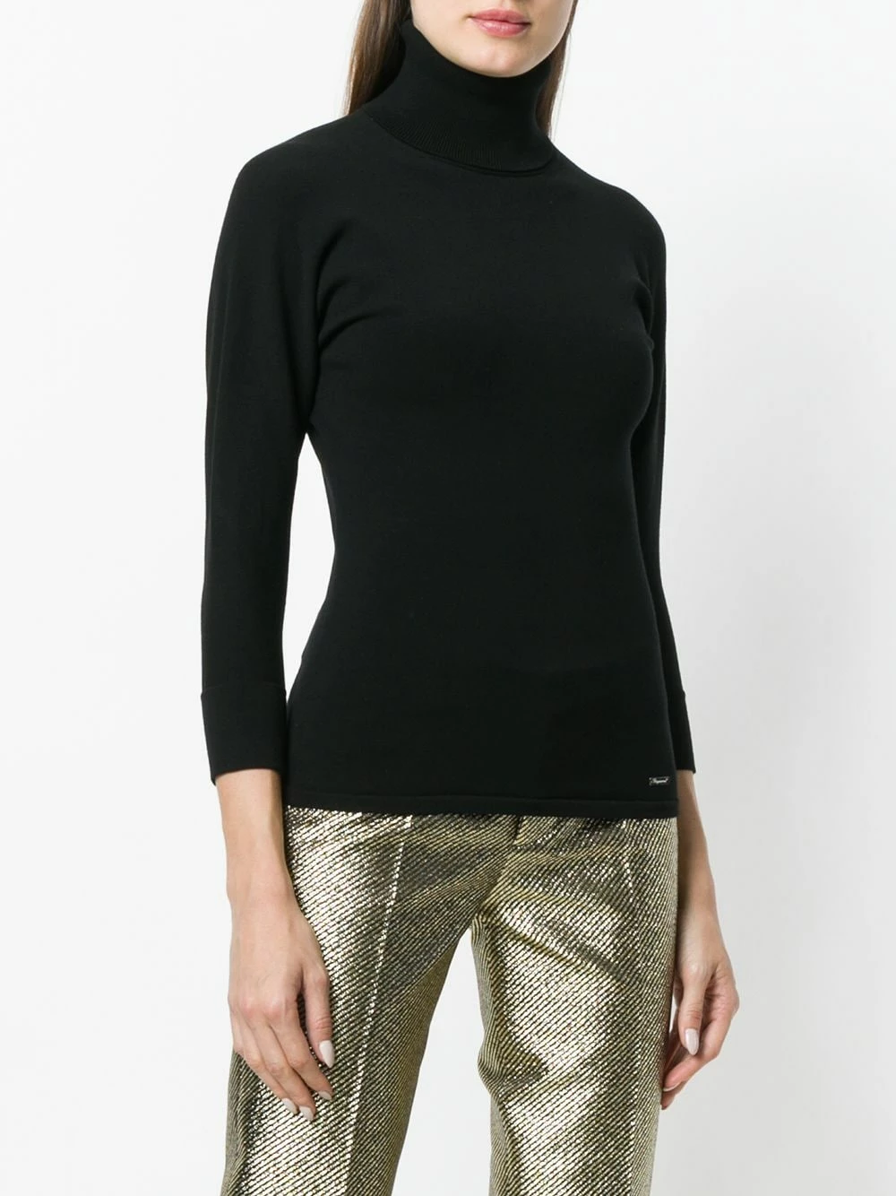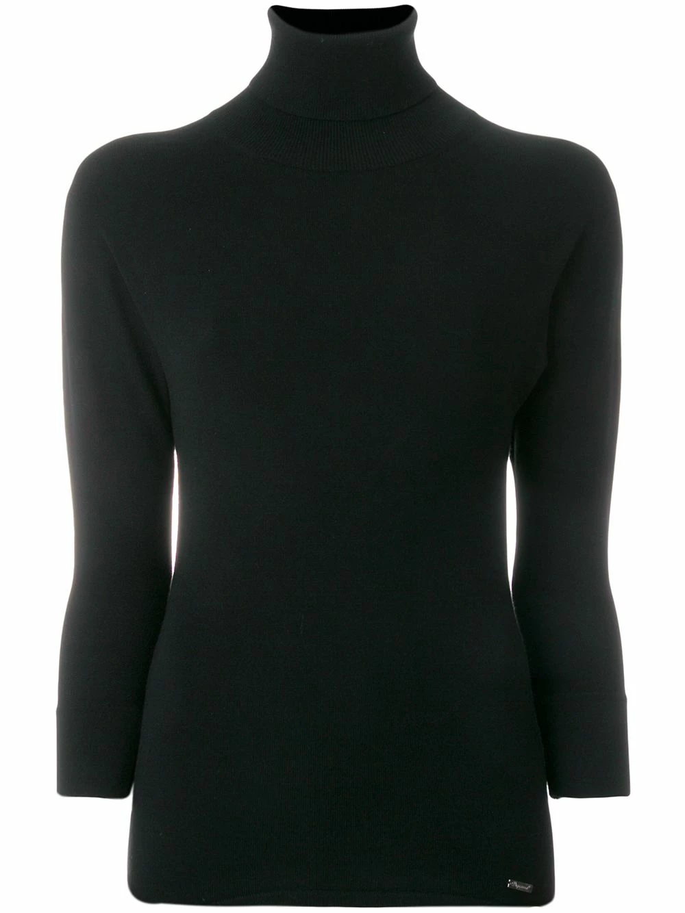 Pull à col roulé Dsquared2 avec col roulé nervuré, manches longues, silhouette ajustée et logo argenté sur les branches. Couleur : noir.