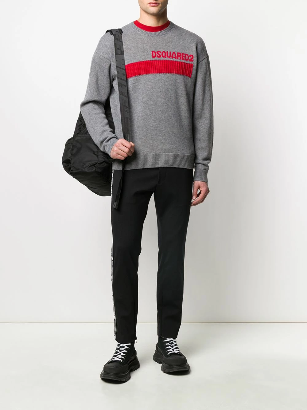 Pull à empiècements contrastants en laine vierge Dsquared2 avec logo poitrine, encolure ras du cou, effet d’épaules descendues, manches longues, ourlet et poignets nervurés et ourlet et poignets nervurés. Couleur : gris.