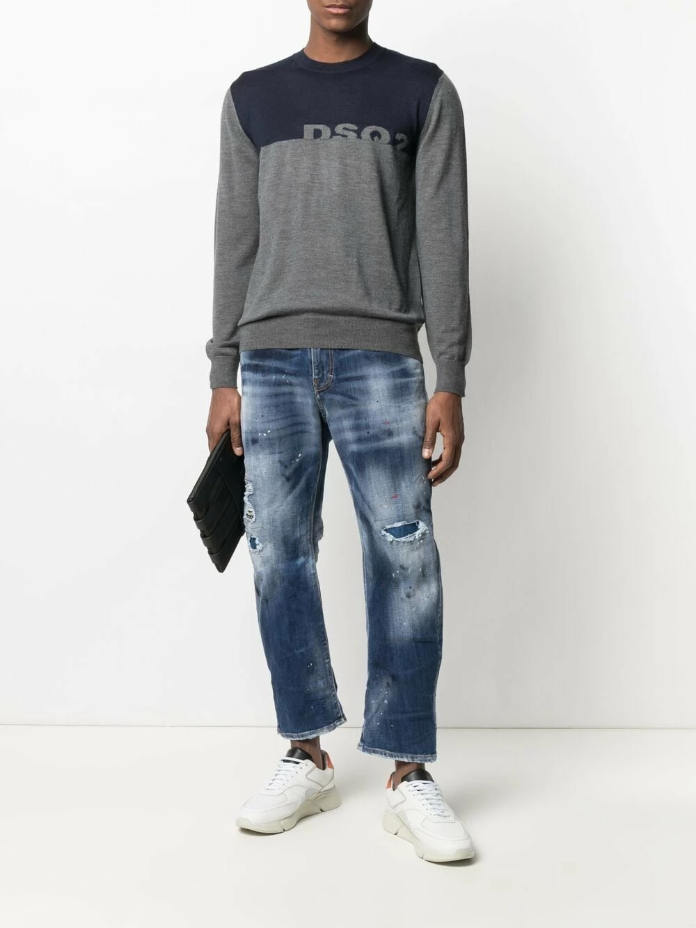 Logo intarsia, modèle bicolore, manches longues, ourlet droit. Couleur : gris. Matière : laine.