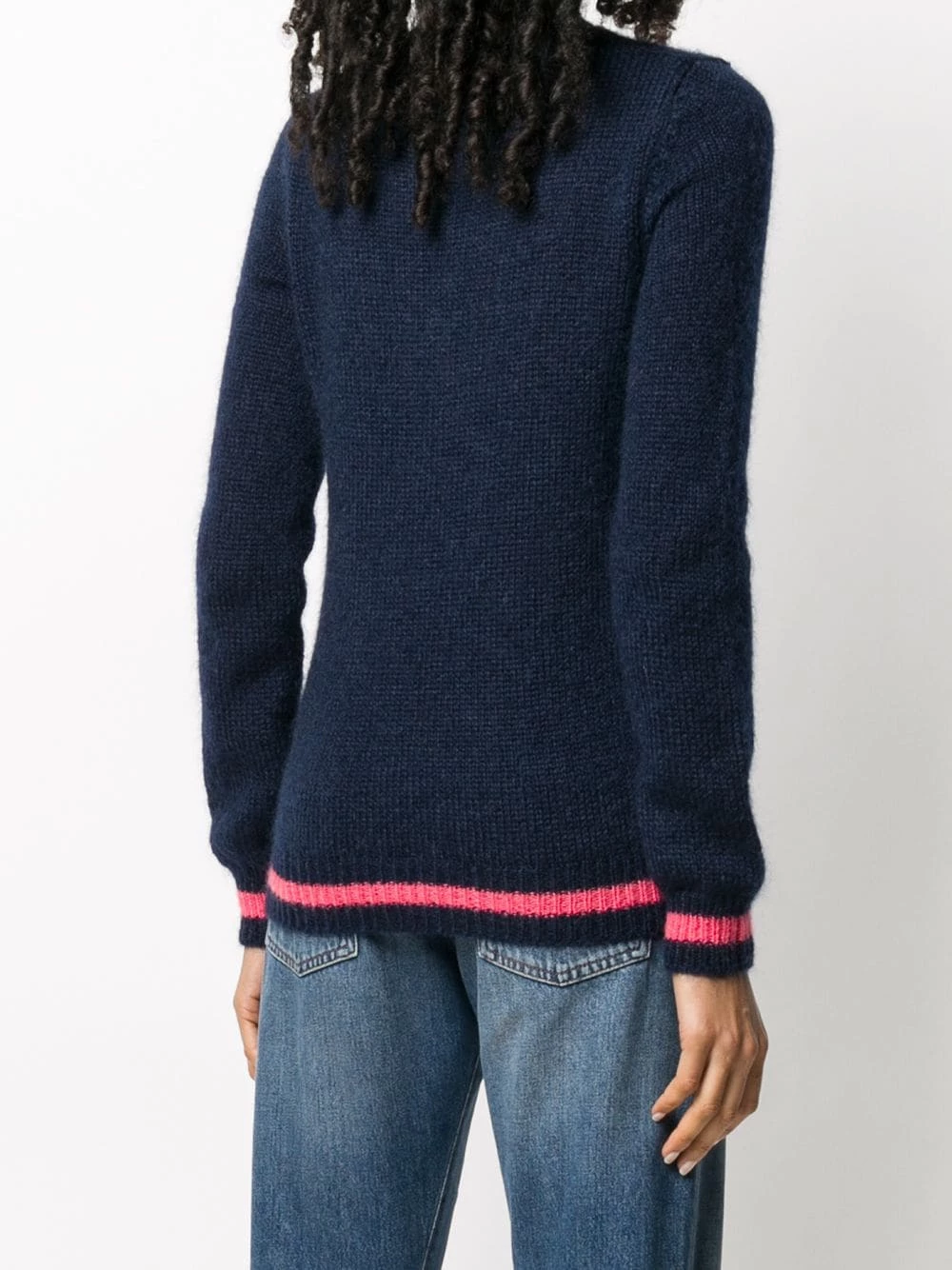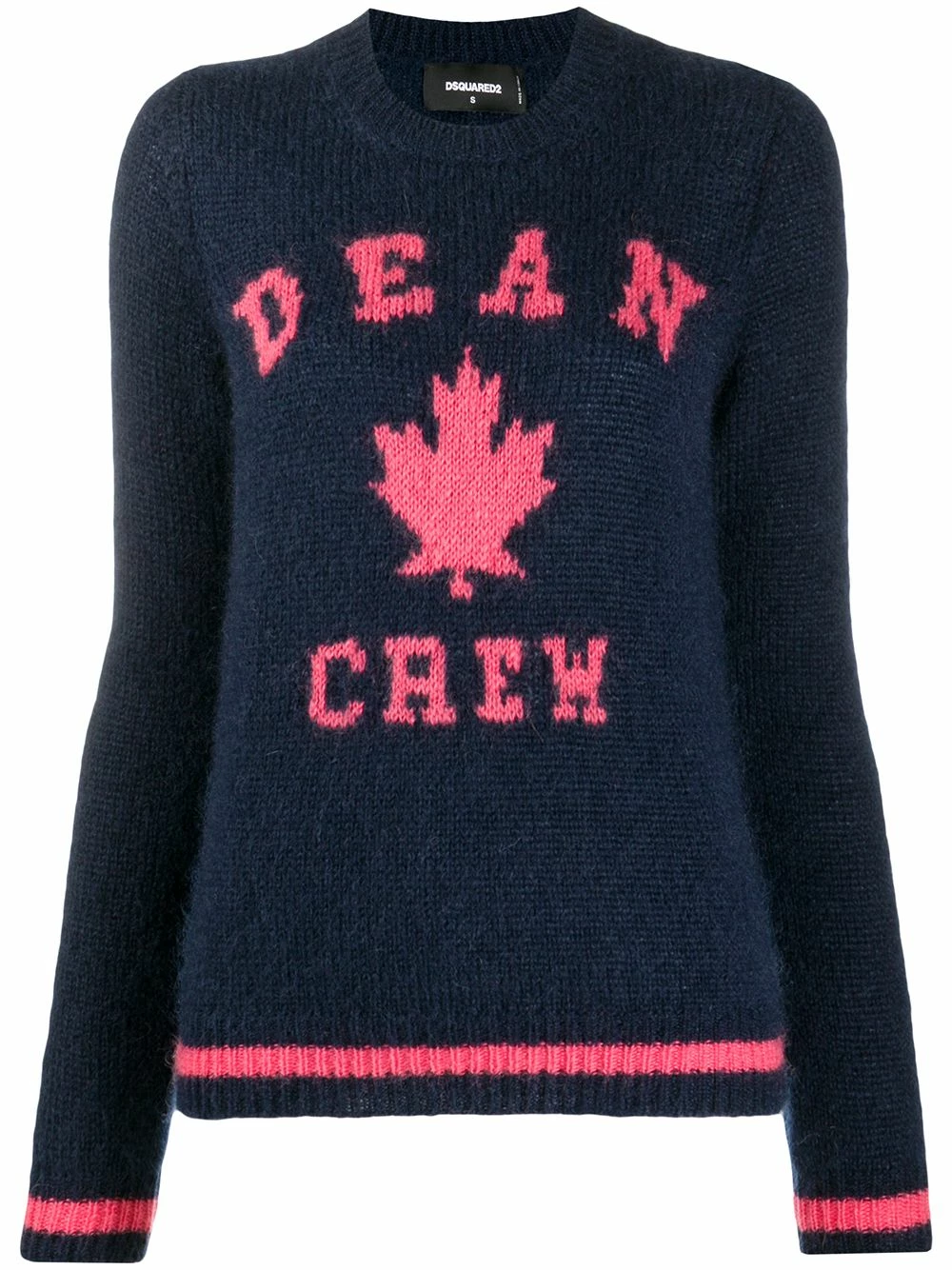 Encolure ras du cou, bordures nervurées, manches longues, jacquard à motif logo, détails rayés.
