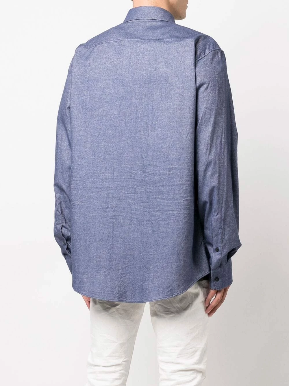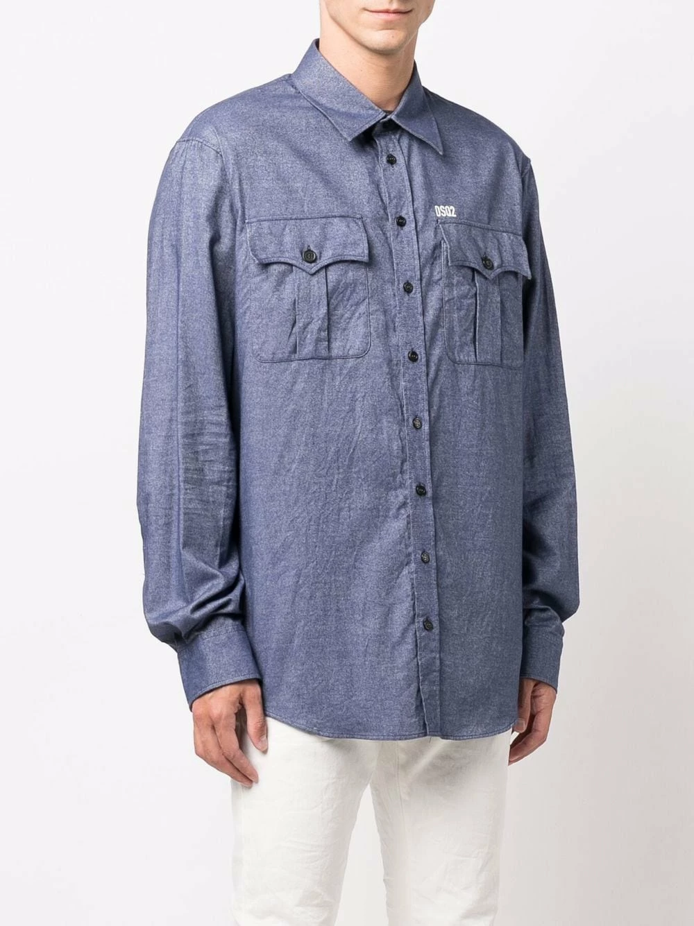 Logo imprimé à la poitrine, col classique, boutonnière sur le devant, poche poitrine boutonnée, manches longues, ourlet incurvé. Couleur : bleu. Matière : coton.