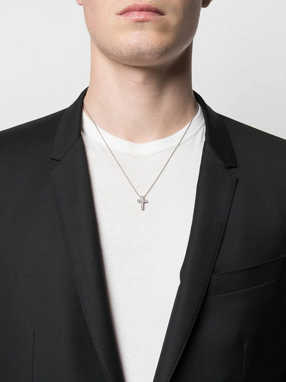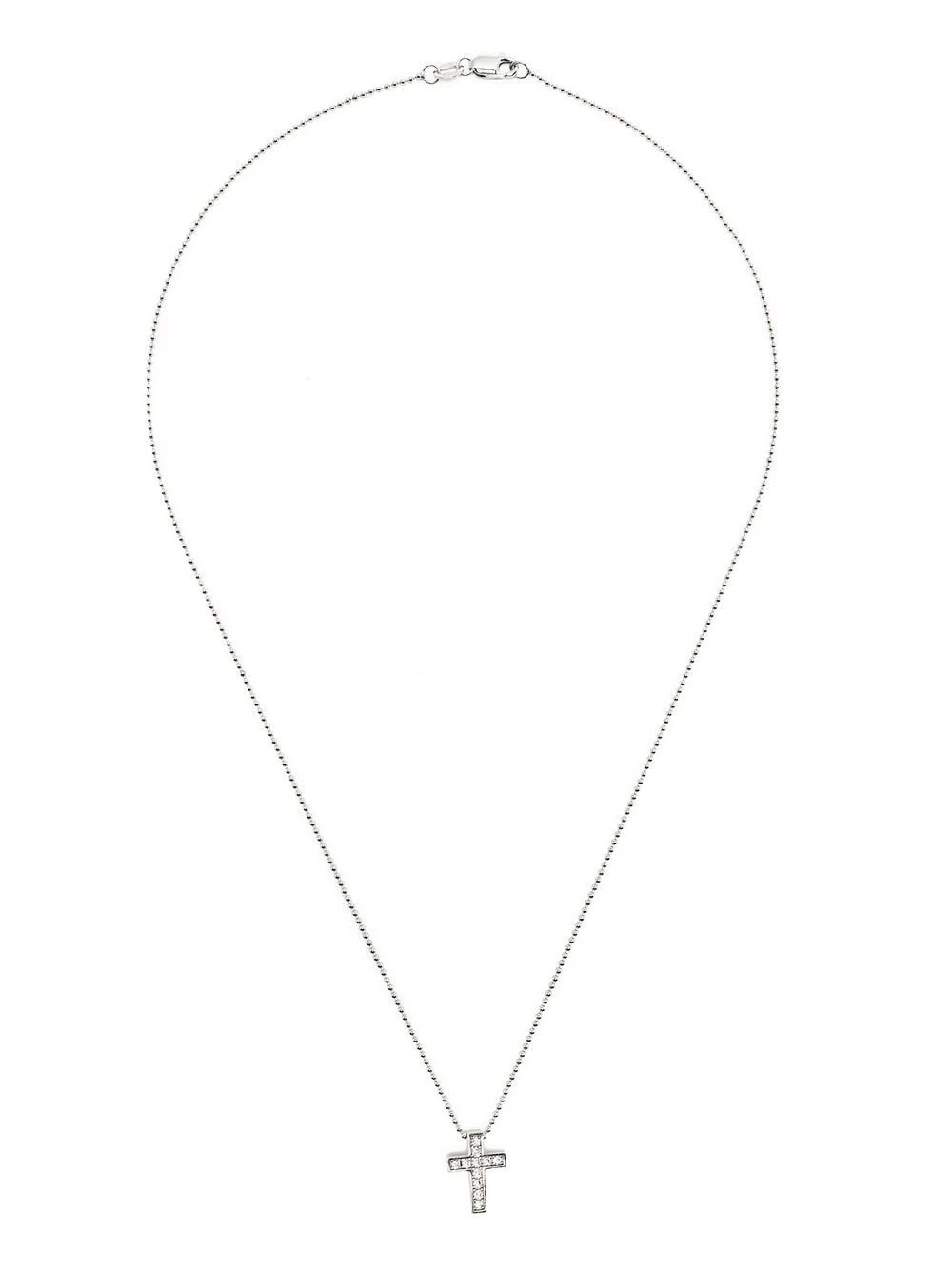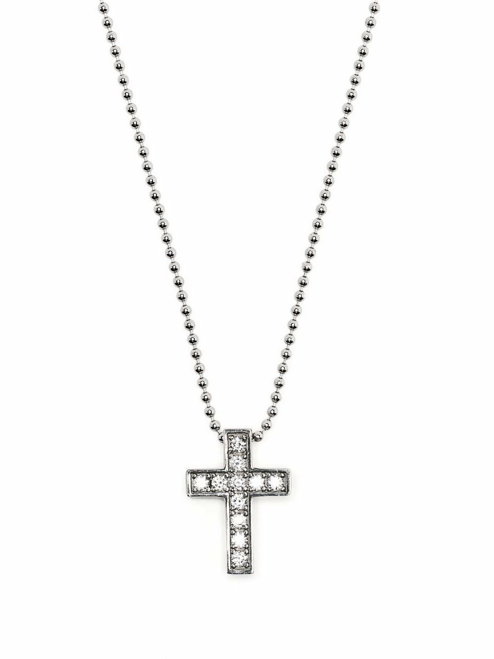 Ornement en cristal, pendentif croix, maille boule, fermoir mousqueton. Couleur : argent.