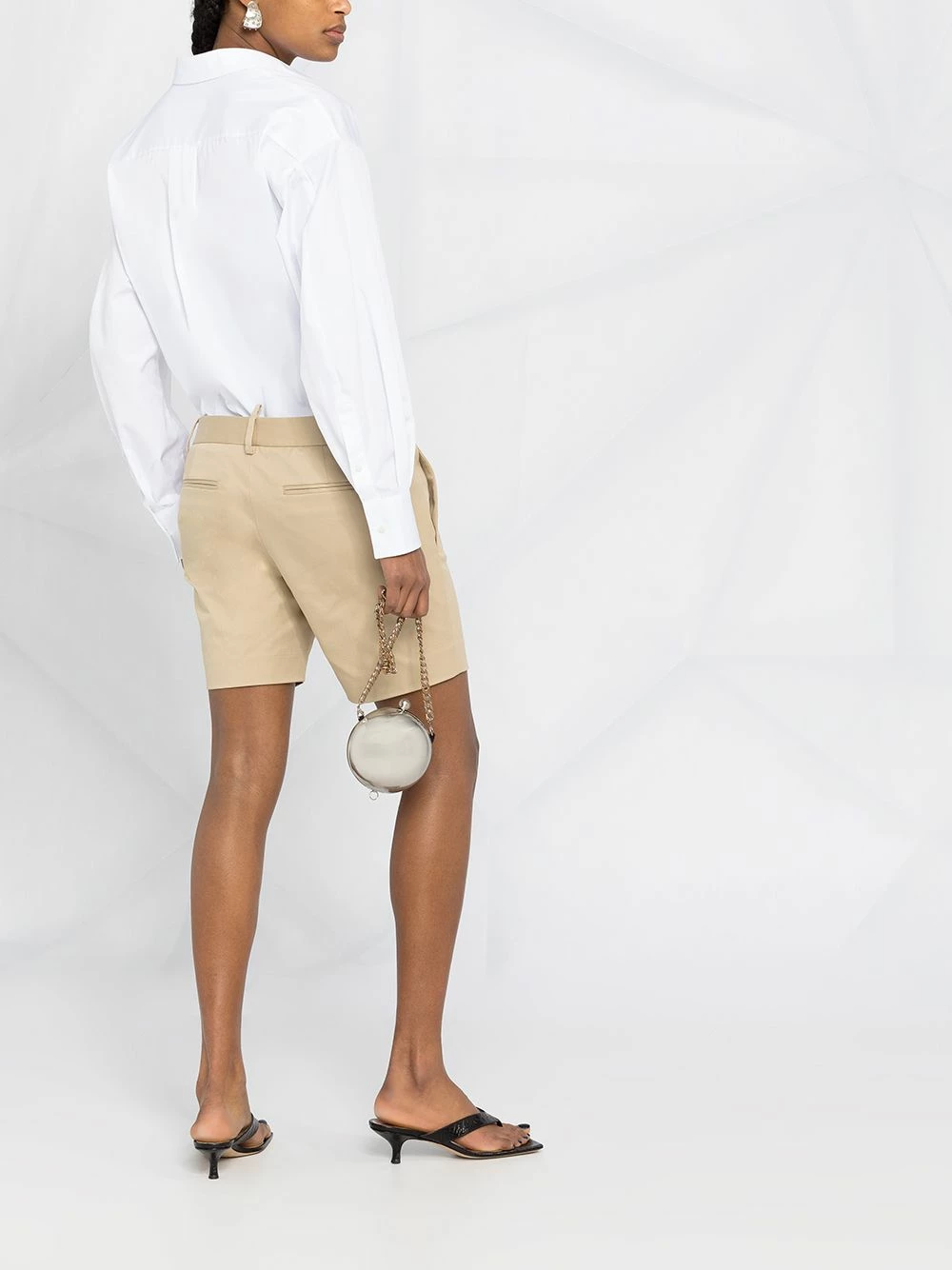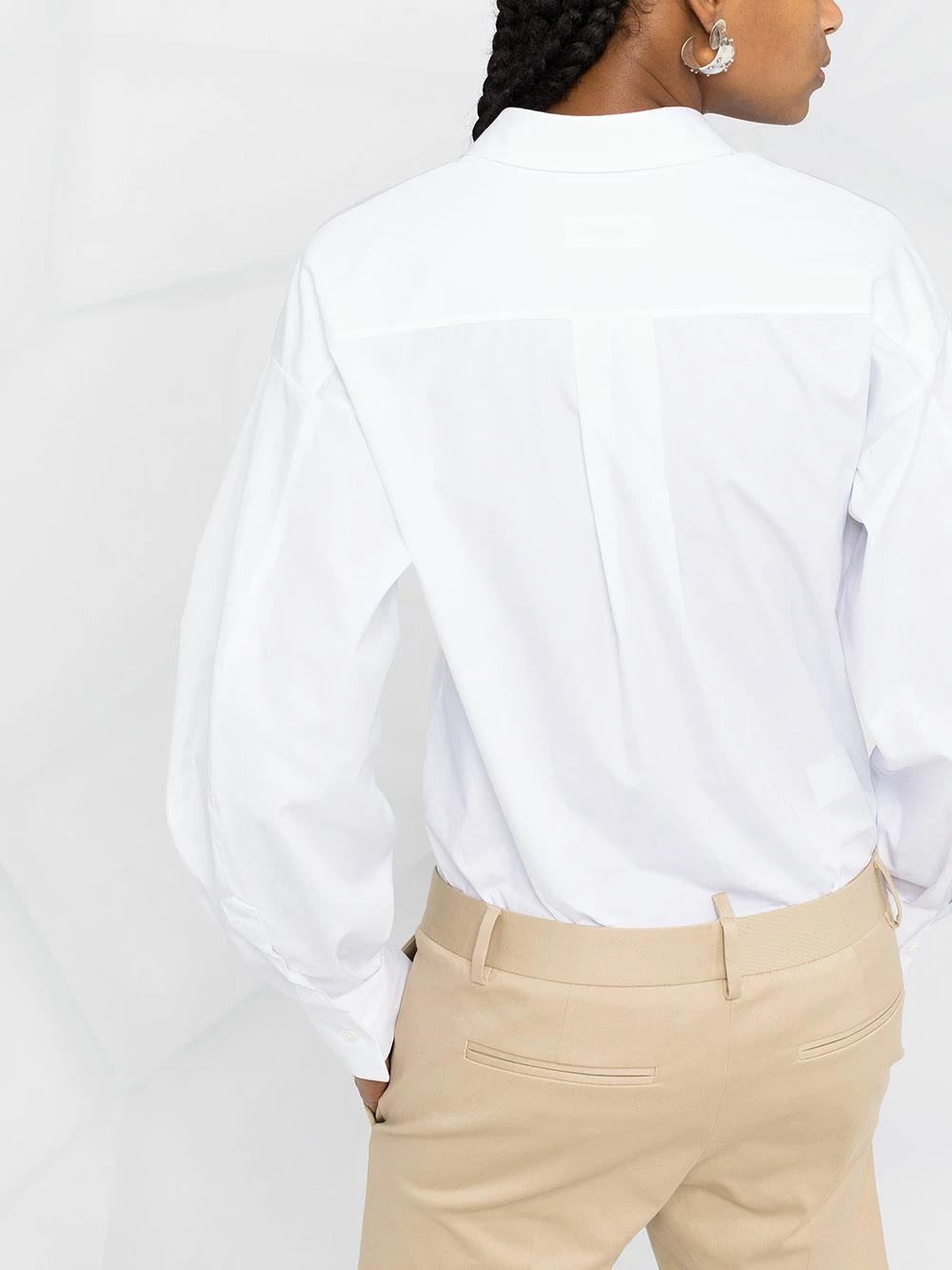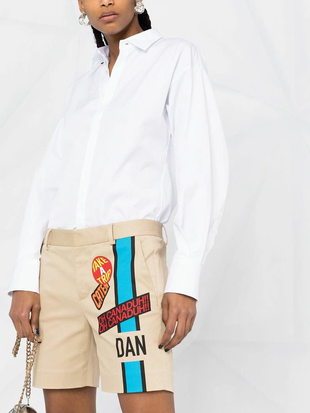 Slogan imprimé sur l’avant, boutonnière dissimulée sur le devant, détail de plis creux, col classique, manches longues, poignets boutonnés, passants de ceinture, deux poches latérales passepoilées, poches arrière passepoilées, coupe courte.