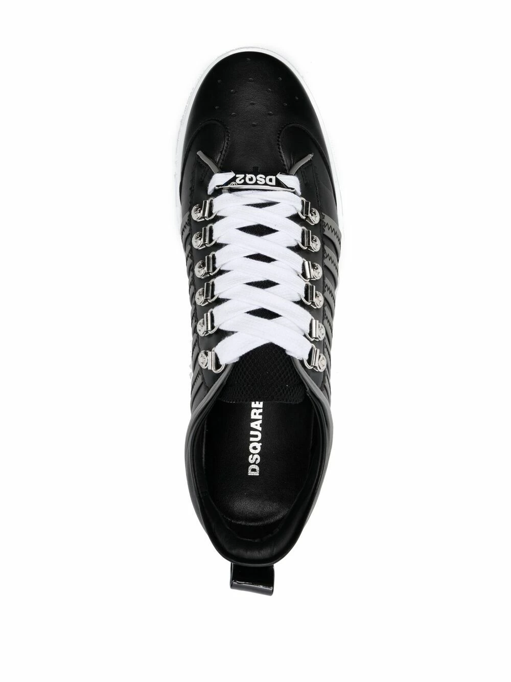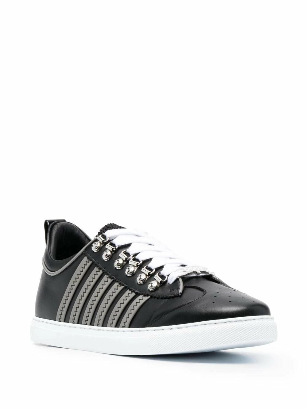 Détail de rayure latérale, languette d’enfilage au talon, fermeture à lacer sur le devant, semelle plate en caoutchouc, semelle intérieure griffée. Couleur : noir. Matière : cuir.